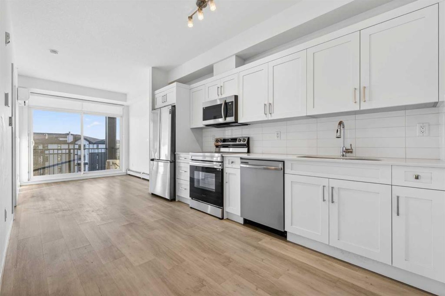 Welcome to the best value that Sage Hill has to offer. This one-bedroom, one-bathroom TOP FLOOR condo is in pristine condition. As you walk into the unit you are greeted with an abundance of natural light and soaring 9-foot ceilings. The luxury vinyl plank flooring across the kitchen and living rooms are durable and low maintenance. The kitchen is bright, white and modern, with stainless steel appliances and quartz countertops. The living room opens to a large patio door and patio space, ideal for indoor/outdoor entertaining. The bedroom provides a convenient walkthrough closet with access to the four-piece bathroom. The unit also features an in-suite washer and dryer and central AC, perfect to stay cool for warm summer days. Window coverings consist of upgraded roller blinds. The unit also comes with titled above ground parking and an assigned storage unit for added convenience. Ideally located with quick access to major routes including Stoney Trail, Sarcee Trail, and Shaganappi Trail, this home puts you just minutes from schools, public transit, shopping centres. A perfect opportunity for first-time buyers, downsizers, or investors looking for a move-in-ready property in a highly accessible location. Call your favourite realtor today to book a showing.