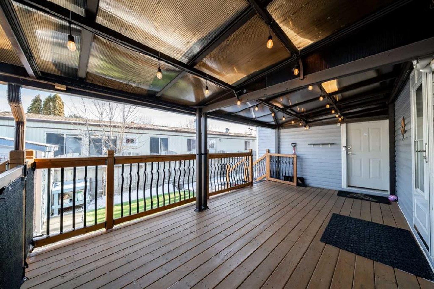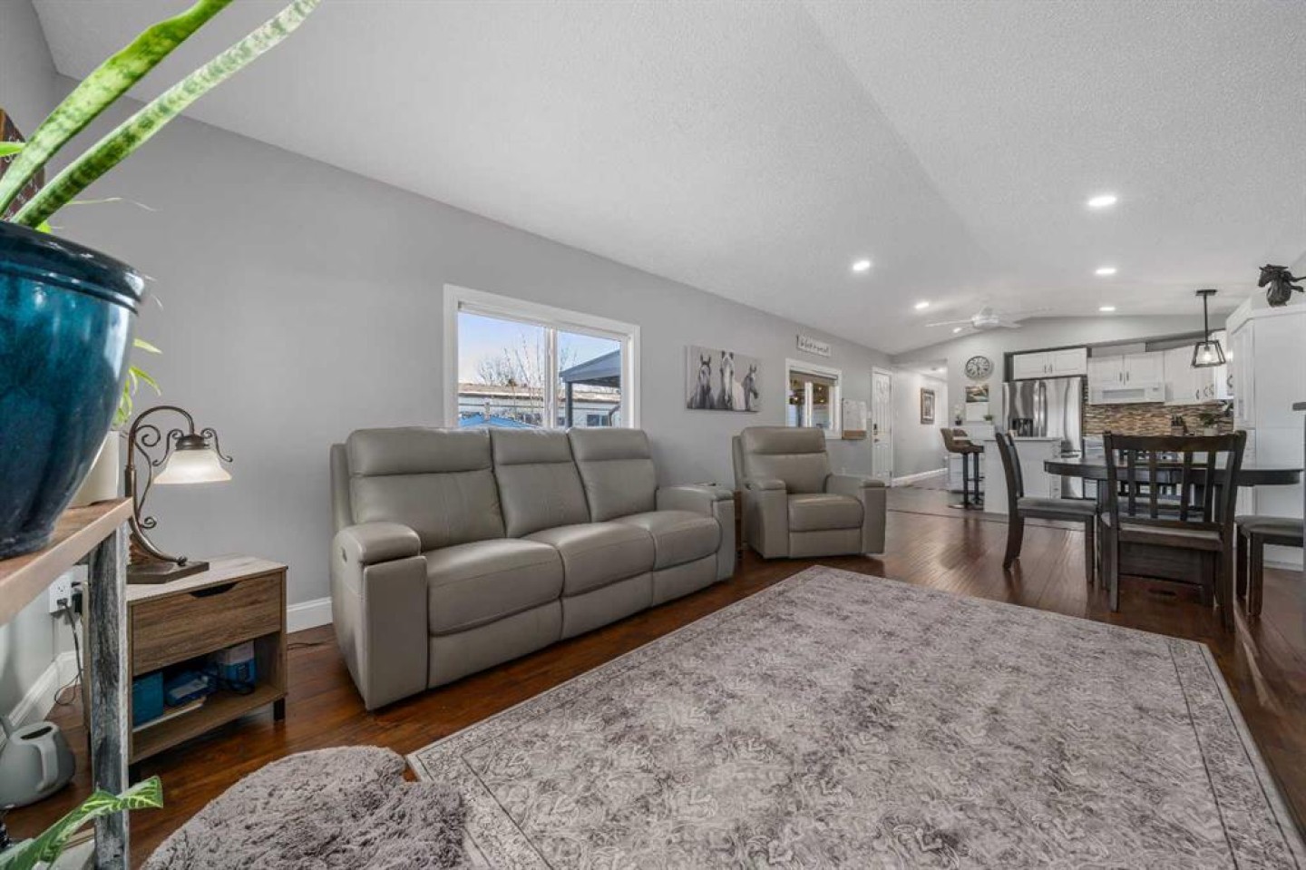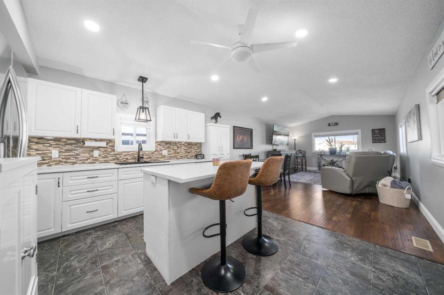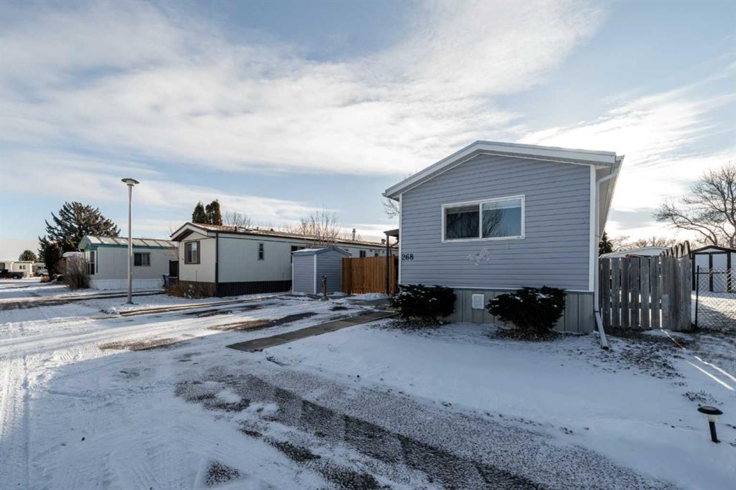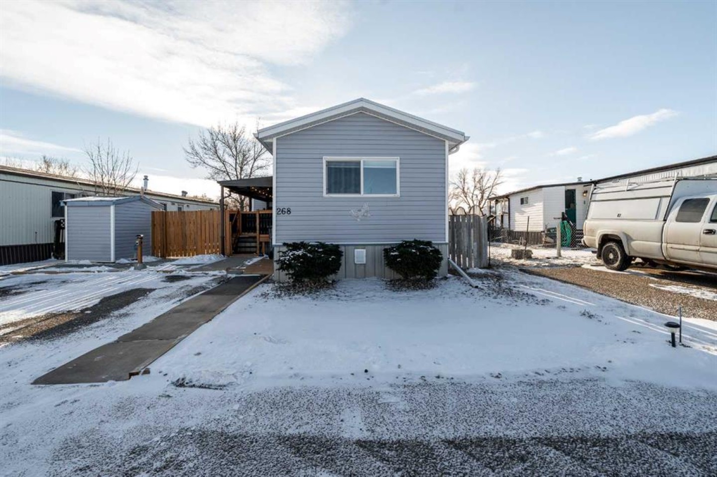 OWNED LAND, NO LOT FEES! Want low maintenance living with everything on one level...with fully fenced yard for your pets or kids? Welcome to this 3 bed 2 bath home that has been meticulously maintained inside and out. The large covered deck (19'5"x 10'5") is welcoming and a great addition to morning coffees, entertaining friends and family in the warmer months, all while being protected from the elements. It's an extension of the home! Step inside to find a beautiful open concept kitchen/dining/living room with vaulted ceilings and newly incorporated pot lights to add to the abundance of natural light. The kitchen has new countertops, new sink and new side by side fridge. Enjoy simple meals at the counter seated island which also supplies numerous storage drawers/cupboards and an electrical outlet for further convenience. Down the hall, away from the noise of living, you will find a four pc bath with laundry, a generous master bedroom with 3pc ensuite and two additional bedrooms..one currently used as an office with outdoor access. No detail has been missed, inside or outside...the list is endless. A new furnace installed in July 2025, with a pump so it doesn't drain under the home (affecting moisture below)but rather into the sewer lines, new light fixtures/fans...washer/dryer and dishwasher approximately 2 years old, new flooring in master bedroom. The office has been freshly painted. Moving outside, the covered deck was stained this past summer and the gazebo has sliding panels to control level of sun etc. The yard has been completely transformed into a maintenance free zone including pea gravel and artificial grass. New sidewalks and rubber pads were installed to keep walking easy as well as a new garbage platform. There are 3 sheds and two container holding racks for added storage and convenience. Finally, the home was relevelled with new footings on cement pads and new 8ml poly/pea gravel installed with heat tape on water lines below for optimal comfort and security. Parking is never a problem, there is plenty extra in the roundabout directly in front of the home. Don't miss the opportunity to check out this great home!