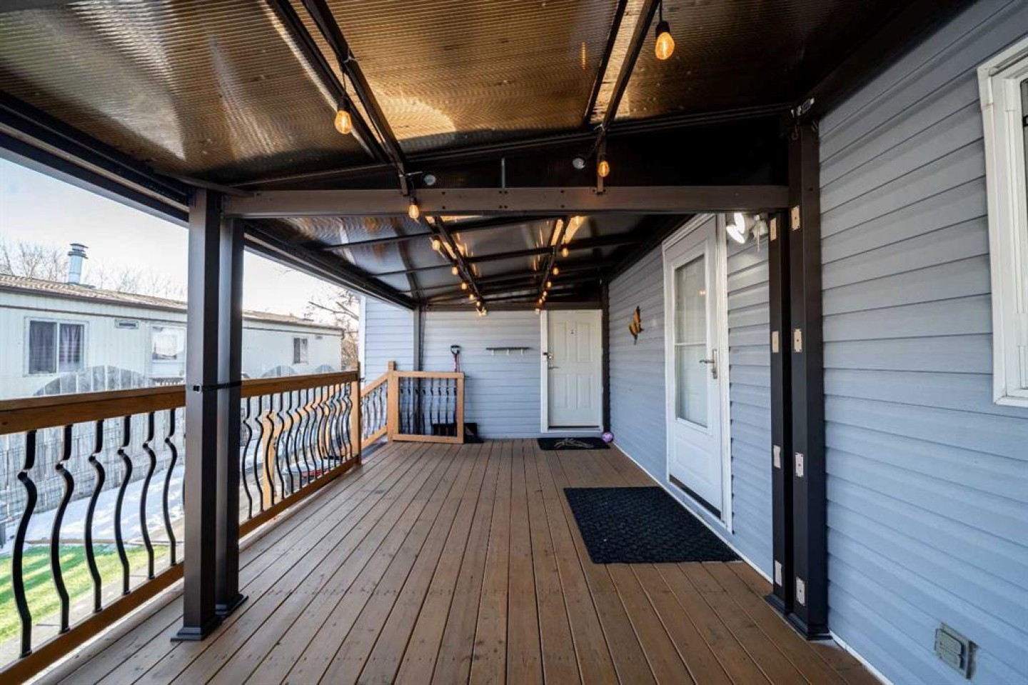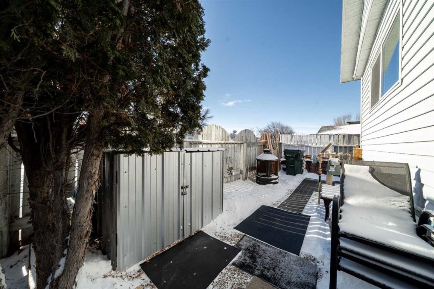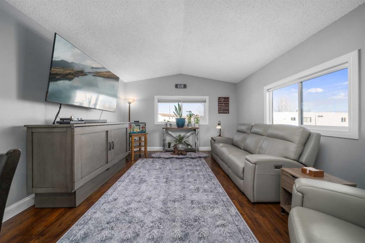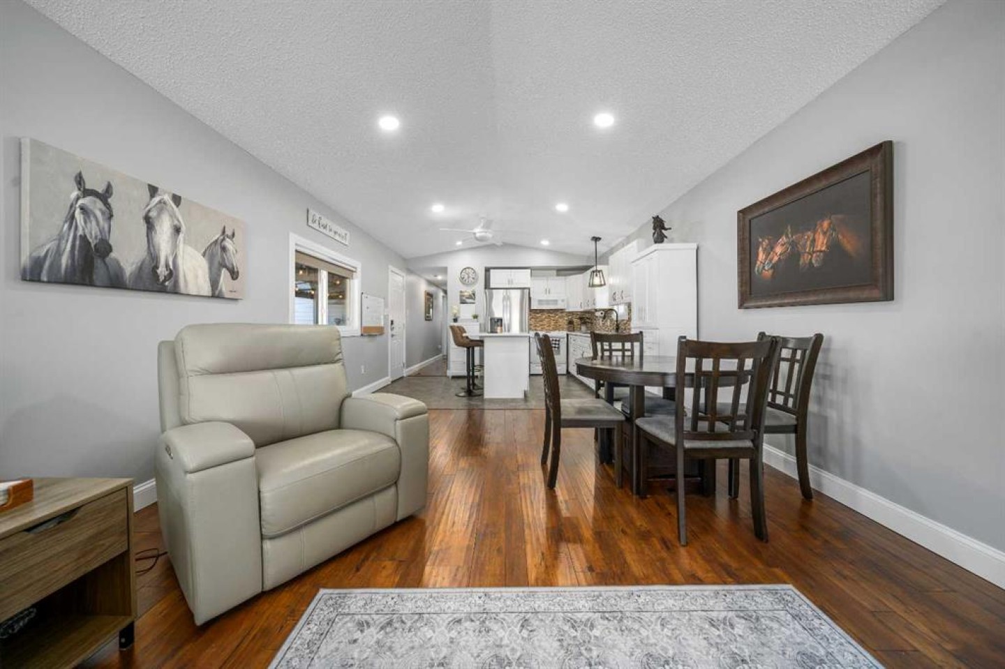 OWNED LAND, NO LOT FEES! Want low maintenance living with everything on one level...with fully fenced yard for your pets or kids? Welcome to this 3 bed 2 bath home that has been meticulously maintained inside and out. The large covered deck (19'5"x 10'5") is welcoming and a great addition to morning coffees, entertaining friends and family in the warmer months, all while being protected from the elements. It's an extension of the home! Step inside to find a beautiful open concept kitchen/dining/living room with vaulted ceilings and newly incorporated pot lights to add to the abundance of natural light. The kitchen has new countertops, new sink and new side by side fridge. Enjoy simple meals at the counter seated island which also supplies numerous storage drawers/cupboards and an electrical outlet for further convenience. Down the hall, away from the noise of living, you will find a four pc bath with laundry, a generous master bedroom with 3pc ensuite and two additional bedrooms..one currently used as an office with outdoor access. No detail has been missed, inside or outside...the list is endless. A new furnace installed in July 2025, with a pump so it doesn't drain under the home (affecting moisture below)but rather into the sewer lines, new light fixtures/fans...washer/dryer and dishwasher approximately 2 years old, new flooring in master bedroom. The office has been freshly painted. Moving outside, the covered deck was stained this past summer and the gazebo has sliding panels to control level of sun etc. The yard has been completely transformed into a maintenance free zone including pea gravel and artificial grass. New sidewalks and rubber pads were installed to keep walking easy as well as a new garbage platform. There are 3 sheds and two container holding racks for added storage and convenience. Finally, the home was relevelled with new footings on cement pads and new 8ml poly/pea gravel installed with heat tape on water lines below for optimal comfort and security. Parking is never a problem, there is plenty extra in the roundabout directly in front of the home. Don't miss the opportunity to check out this great home!