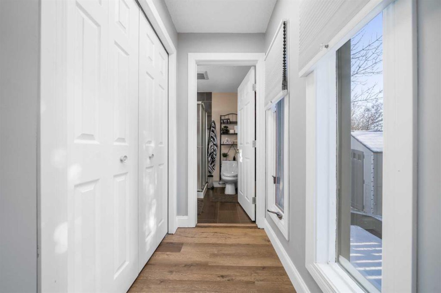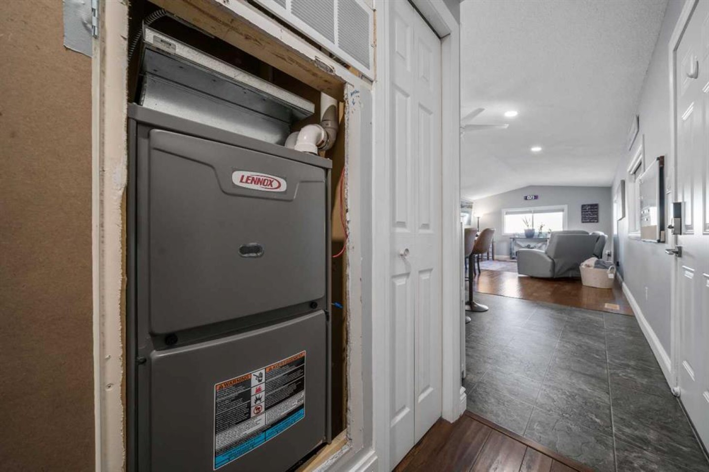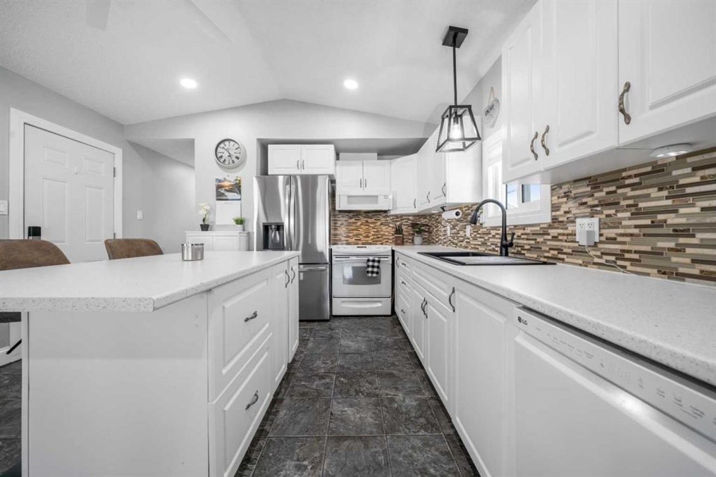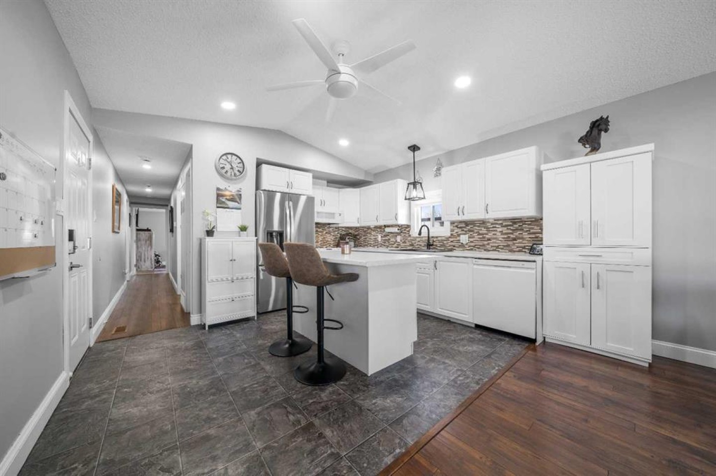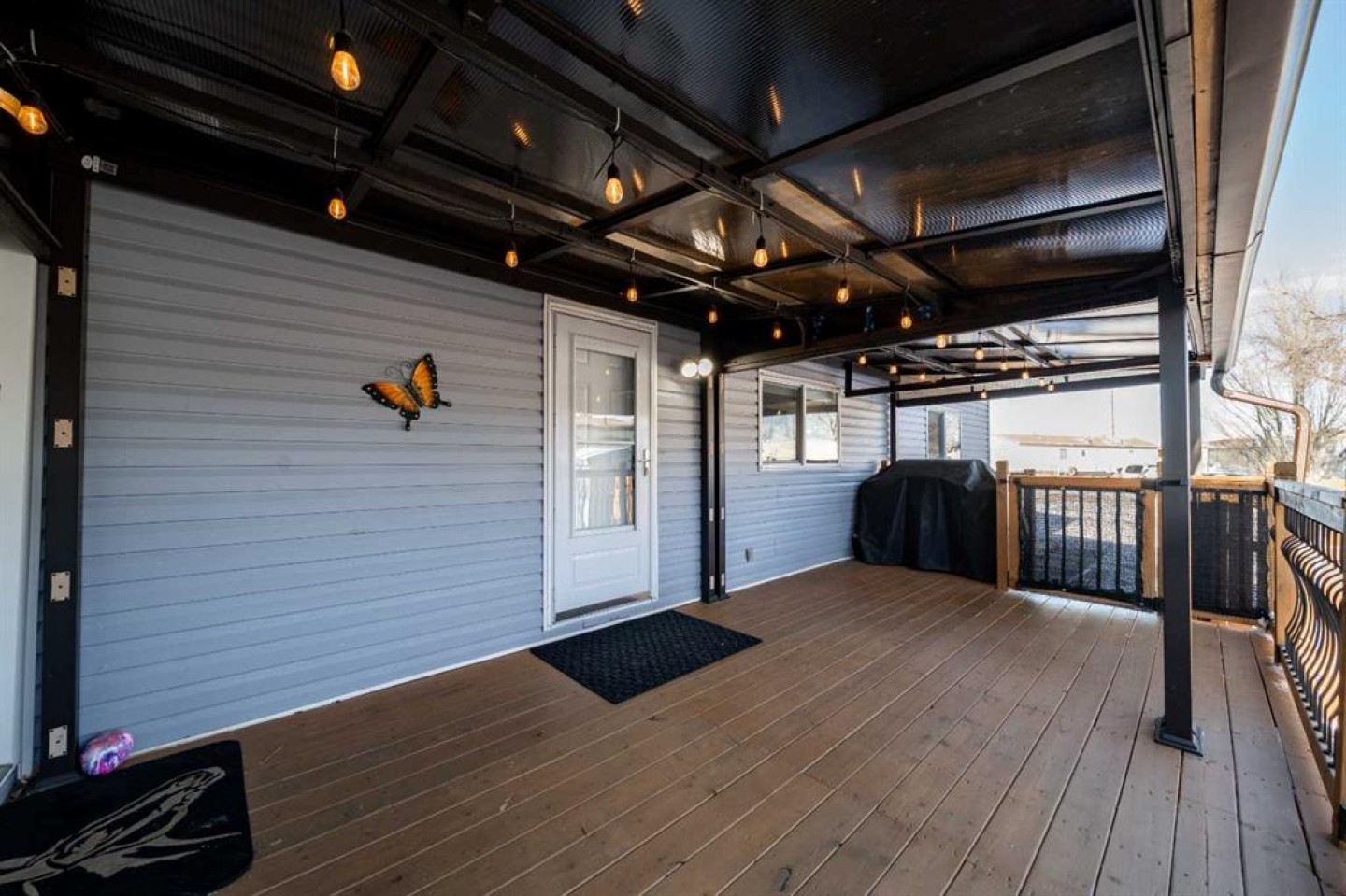 OWNED LAND, NO LOT FEES! Want low maintenance living with everything on one level...with fully fenced yard for your pets or kids? Welcome to this 3 bed 2 bath home that has been meticulously maintained inside and out. The large covered deck (19'5"x 10'5") is welcoming and a great addition to morning coffees, entertaining friends and family in the warmer months, all while being protected from the elements. It's an extension of the home! Step inside to find a beautiful open concept kitchen/dining/living room with vaulted ceilings and newly incorporated pot lights to add to the abundance of natural light. The kitchen has new countertops, new sink and new side by side fridge. Enjoy simple meals at the counter seated island which also supplies numerous storage drawers/cupboards and an electrical outlet for further convenience. Down the hall, away from the noise of living, you will find a four pc bath with laundry, a generous master bedroom with 3pc ensuite and two additional bedrooms..one currently used as an office with outdoor access. No detail has been missed, inside or outside...the list is endless. A new furnace installed in July 2025, with a pump so it doesn't drain under the home (affecting moisture below)but rather into the sewer lines, new light fixtures/fans...washer/dryer and dishwasher approximately 2 years old, new flooring in master bedroom. The office has been freshly painted. Moving outside, the covered deck was stained this past summer and the gazebo has sliding panels to control level of sun etc. The yard has been completely transformed into a maintenance free zone including pea gravel and artificial grass. New sidewalks and rubber pads were installed to keep walking easy as well as a new garbage platform. There are 3 sheds and two container holding racks for added storage and convenience. Finally, the home was relevelled with new footings on cement pads and new 8ml poly/pea gravel installed with heat tape on water lines below for optimal comfort and security. Parking is never a problem, there is plenty extra in the roundabout directly in front of the home. Don't miss the opportunity to check out this great home!