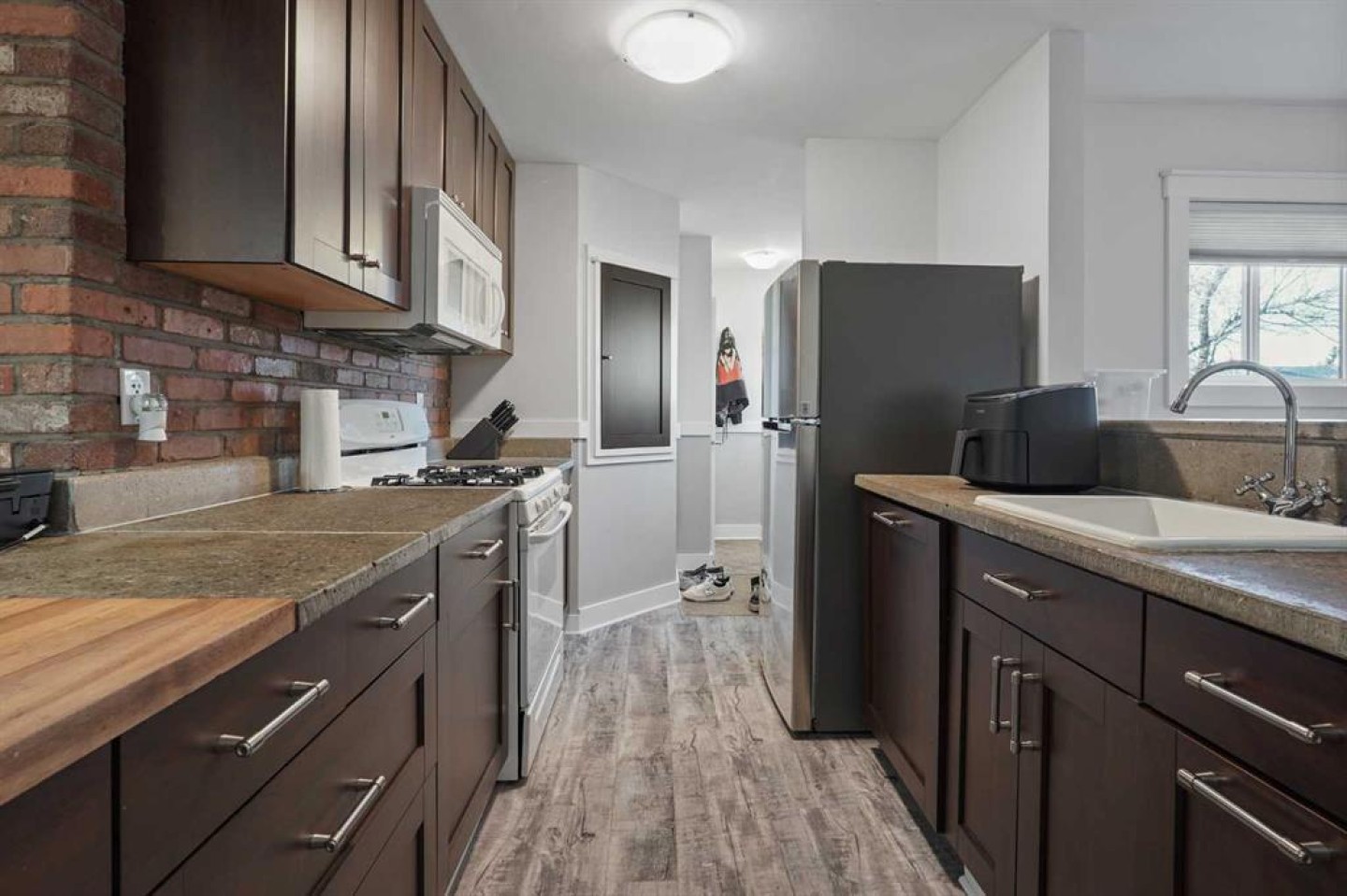 Welcome to this charming and thoughtfully updated home located on a beautiful corner lot in the heart of Fort Macleod — a small community known for its welcoming spirit and strong sense of pride. This cozy two-bedroom, one-bathroom home offers a perfect blend of character and modern style. The bathroom features a relaxing jetted tub, ideal for unwinding at the end of the day. Inside, you’ll find durable laminate flooring throughout and a stylish kitchen highlighted by concrete countertops and a unique brick archway that adds warmth and architectural interest. Outside, the property truly shines with mature trees providing privacy and shade. The heated, detached 20’ x 24’ garage boasts 10-foot ceilings, making it perfect for vehicles, storage, hobbies, or a workshop.