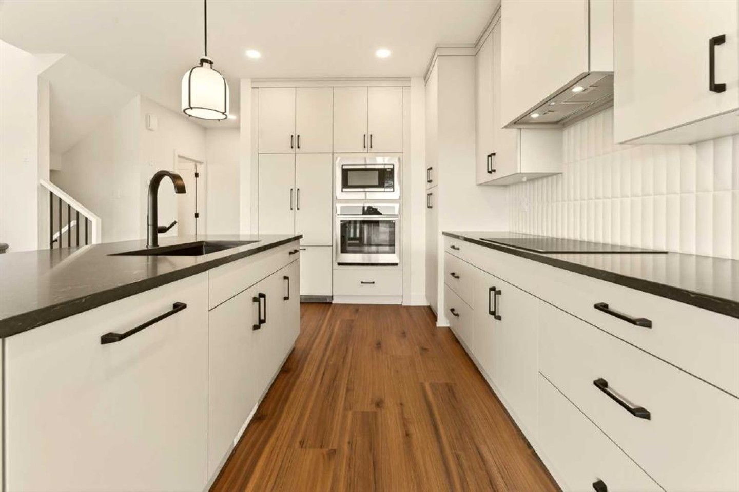 The main floor is bright, open, and intentionally designed to feel both elevated and functional, anchored by a standout kitchen that truly sets the tone for the home. Extended cabinetry runs all the way to the ceiling, paired with quartz countertops and a sleek induction cooktop, while the built-in oven and microwave keep everything clean and streamlined. The panelled Fisher & Paykel fridge and matching panelled dishwasher blend seamlessly into the cabinetry, giving the kitchen a polished, high-end look without feeling overdone. Just off the kitchen, the dining and living areas flow effortlessly together and open to the spacious backyard through sliding glass doors, perfectly positioned for a future deck and indoor-outdoor entertaining.