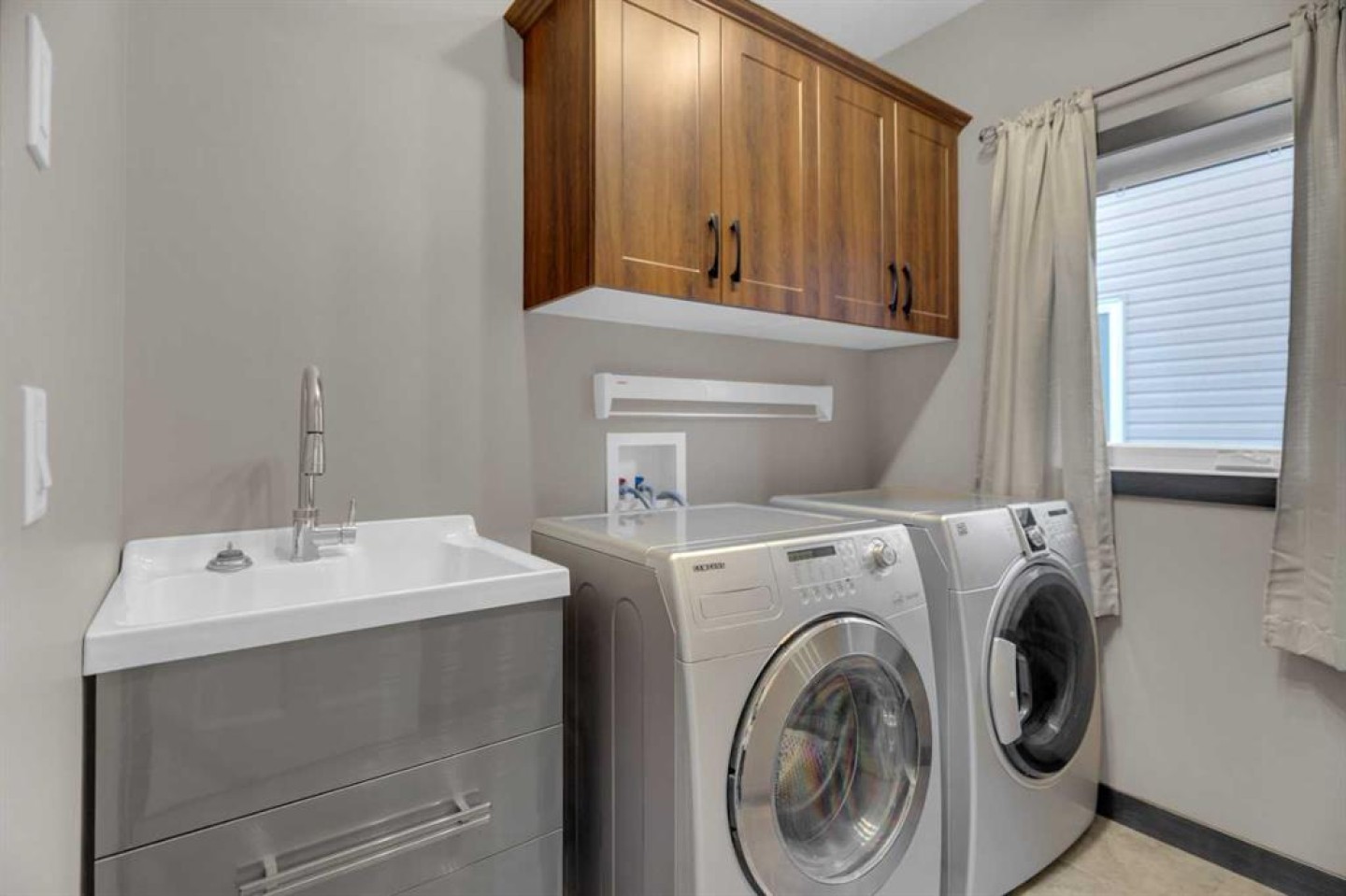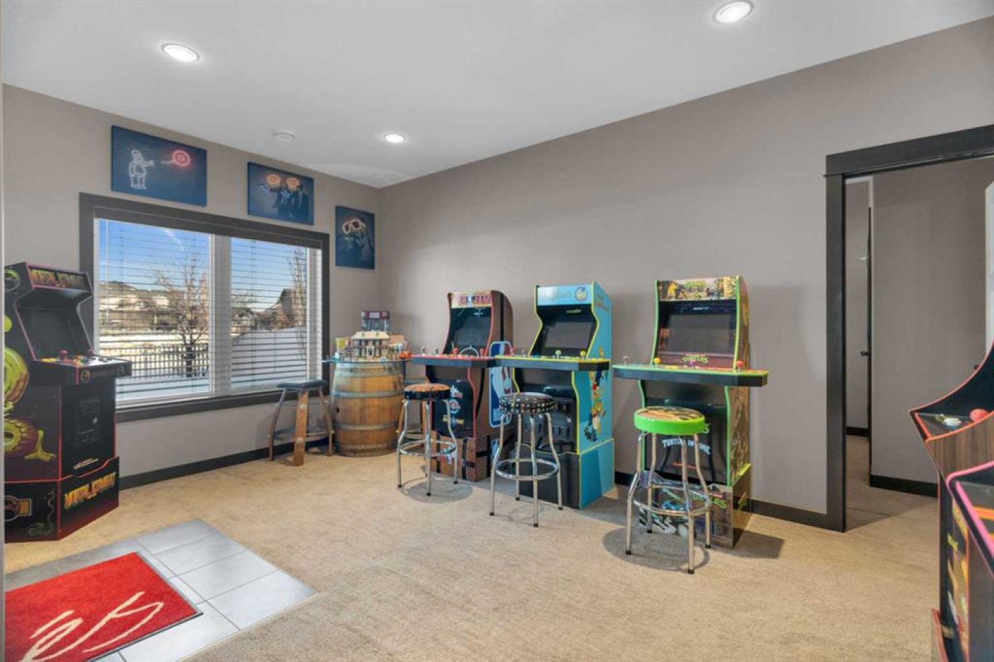 Additional highlights include professionally installed window coverings and living room drapes, central air conditioning, surround sound throughout the main floor and the basement, and in-floor heating in the basement.