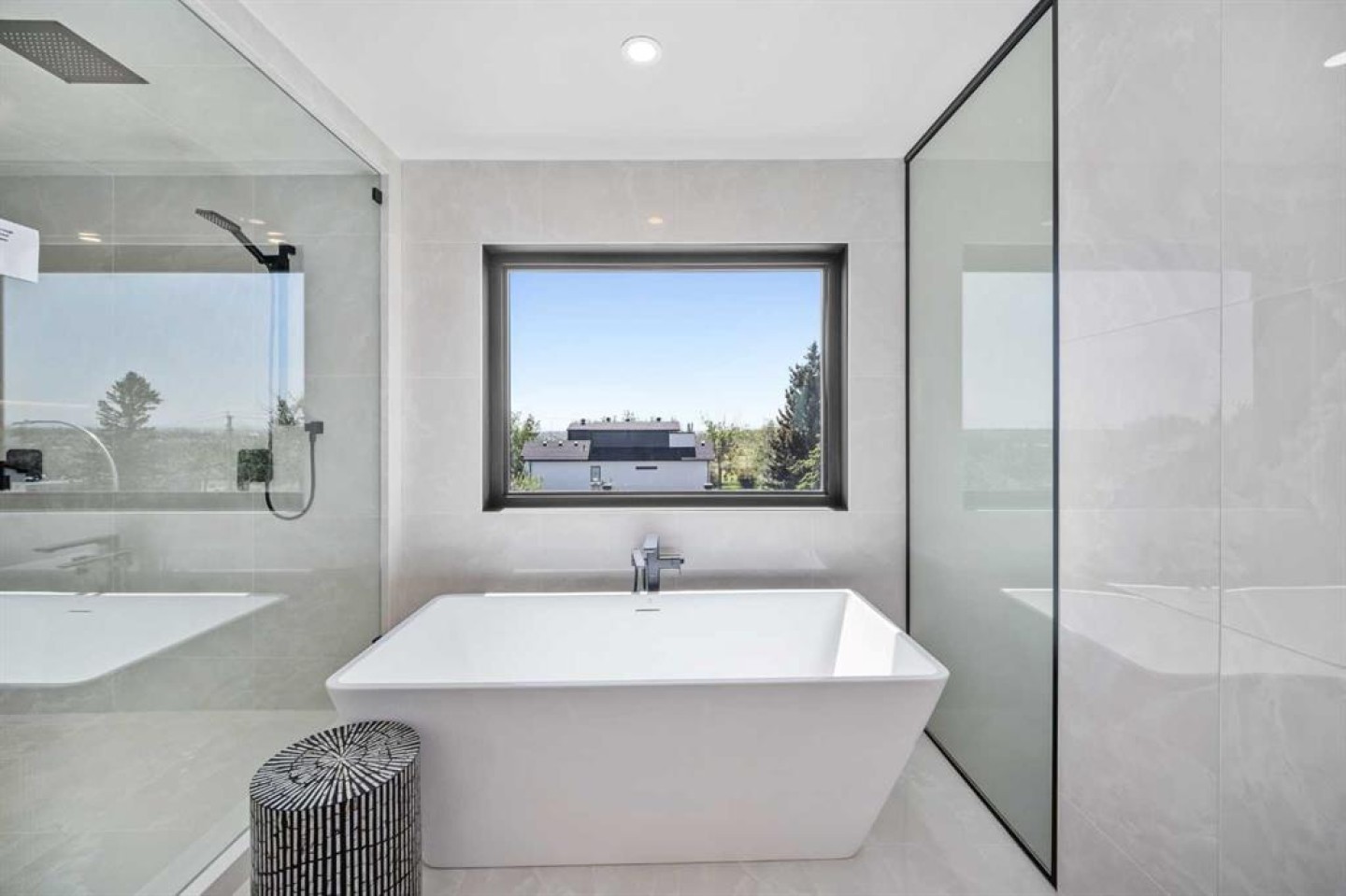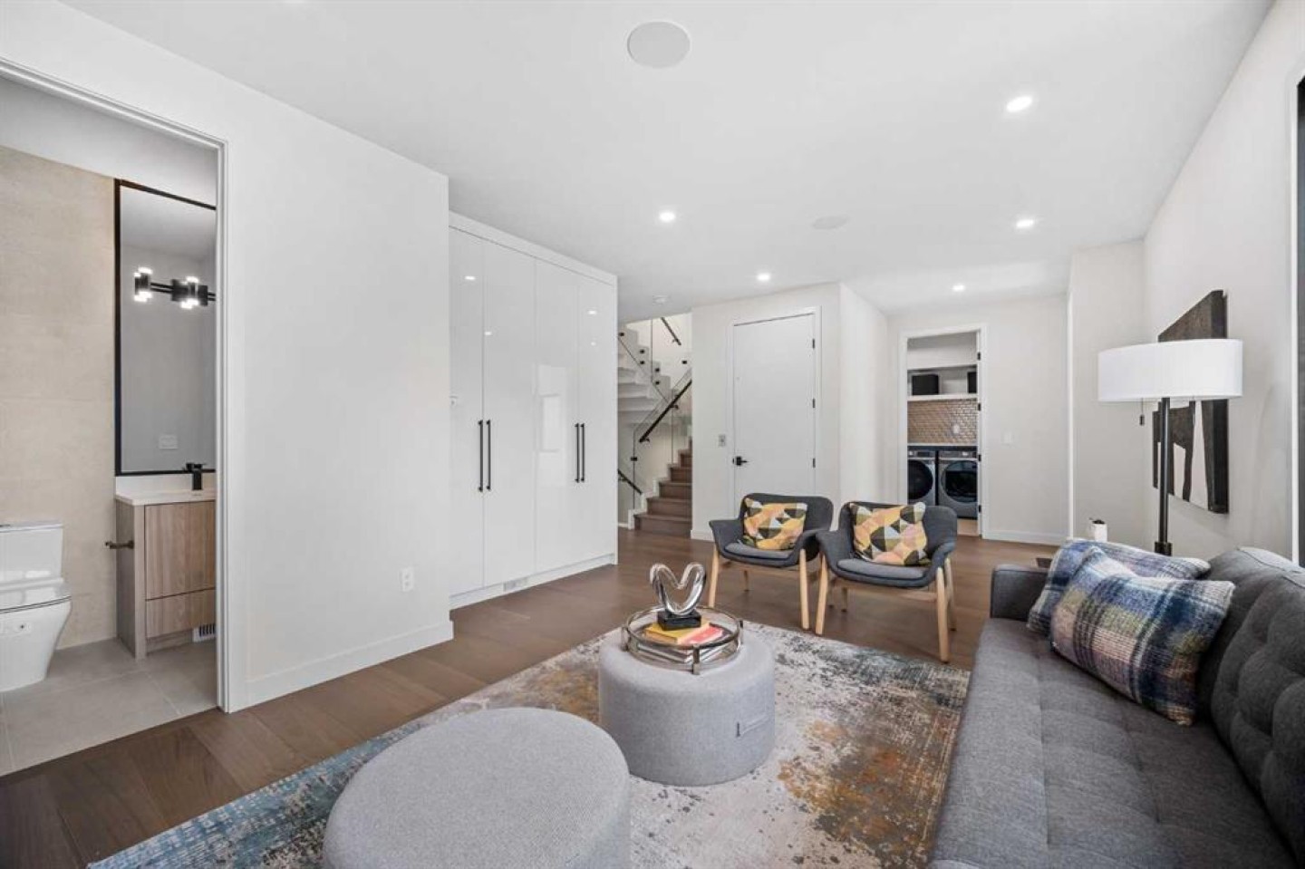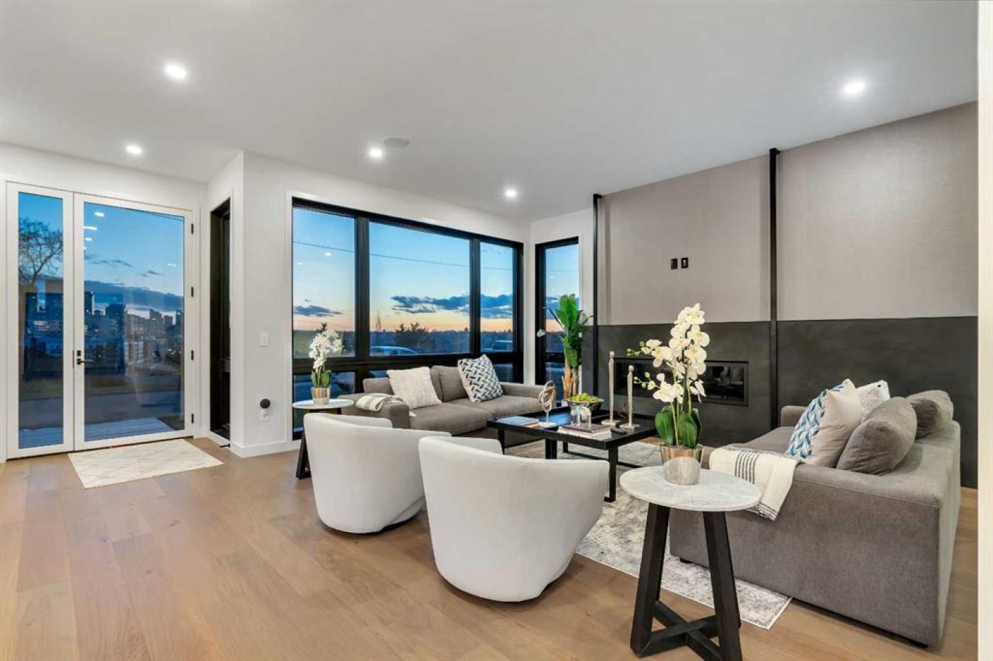 An architectural masterpiece by Silverpoint Custom Homes and Paul Lavoie Interior Design. Perched on a spectacular lot overlooking Bridgeland, and offering breathtaking views of the City and Rocky Mountains. A 5,200-square-foot gem, which seamlessly blends Hollywood Hills vibes, in a meticulous and one of a kind design. A fantastic open floor plan with a separate formal living and dining rooms overlooking the city. Boasting a truly magnificent kitchen, featuring a 13ft waterfall island and all MIELE appliances. Hardwood floors weave throughout the four levels including the basement, creating a harmonious atmosphere of seamless design. The main level surprises you with a hidden coat closet, a spacious mudroom, and a private den overlooking a backyard oasis with a large deck, (hot-tub ready) Move effortlessly between levels via the elevator or a captivating floor to ceiling glass-walled staircase leading to three generous bedrooms and a master top suite, simply like no other. The second floor offers 3 spacious bedrooms with panoramic city views from 2 bedrooms, private balconies, and a separate family lounge with access to a full guest bath. A fabulous laundry room and linen closet complete this level, not to mention large picture windows offering fulll sunrise worthy east views. The third-floor PRINCIPAL BEDROOM is a showstopper with a HUGE BALCONY showcasing the best panoramic city and mountain vews. A separate lounge area with coffee bar, fridge and a built in TV LIFT separate the bedroom area. As you enter the ensuite, flooded with natural light, a magical SMARTGLASS window gives you the option of privacy, or to enjoy the fabulous city views while soaking in the tub. A luxurious dual vanity, dual spa shower area surrounded by glass, featuring heated floors and shower bench. The walk-in wardrobe suite is a one of a kind dream space, with built in's that will rival a designer shop. Large skylights, a huge window and your own washer/dryer, make this the perfect dressing area. The lower level caters to the extended family and features a media area with full bar, gym, and a large bedroom. A full bath including a steam shower completes this level with all heated hardwood flooring. The outdoor spaces surrounding the house lets you indulge in extended year round outdoor living. A large front patio with a fire pit option, and seating lets you indulge in the west city and mountain views. The rear yard offers you a great dining space, and private relaxation areas with an optional hot tub, and a multi purpose sports area or green space. This home as expected includes all Smart home features, an elevator, extensive internal glass walls, AC, infloor heat, and an oversized garage with a full third car garage option which can be built prior to possession for the buyer. An amazingly unique home with modern, yet classic design elements, encompassing every luxury option a discerning home owner would desire in their dream home.