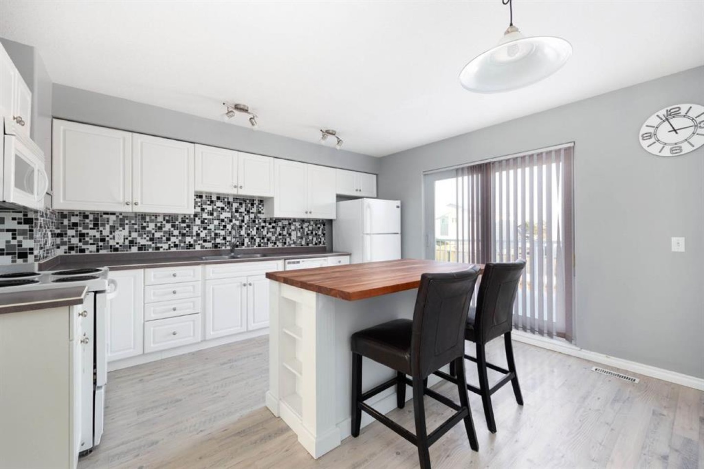 Welcome to this move in ready 2-bedroom home with an attached garage, ideally located in Prairie Creek and offering exceptional value. Whether you’re a first-time buyer or a savvy investor, this renovated (no carpet) home delivers comfort, functionality, and convenience in one inviting package. The spacious living room is filled with natural light from oversized windows, creating a warm and welcoming atmosphere with the corner gas fireplace. The kitchen offers plenty of modern white cabinetry, an eaten island and direct access to a balcony with natural gas bbq hookups. Upstairs, you’ll find two generously sized bedrooms, each with large closets, along with a 4-piece bathroom; The master bedroom features a vaulted ceiling with large windows to draw in natural light. The yard is fully fenced and landscaped, perfect for entertaining or pets.Located close to public transit, walking trails, highway 63, the airport, and more, This move-in-ready gem checks all the boxes — value, updates, location, and affordable. Call to book your showing today!
