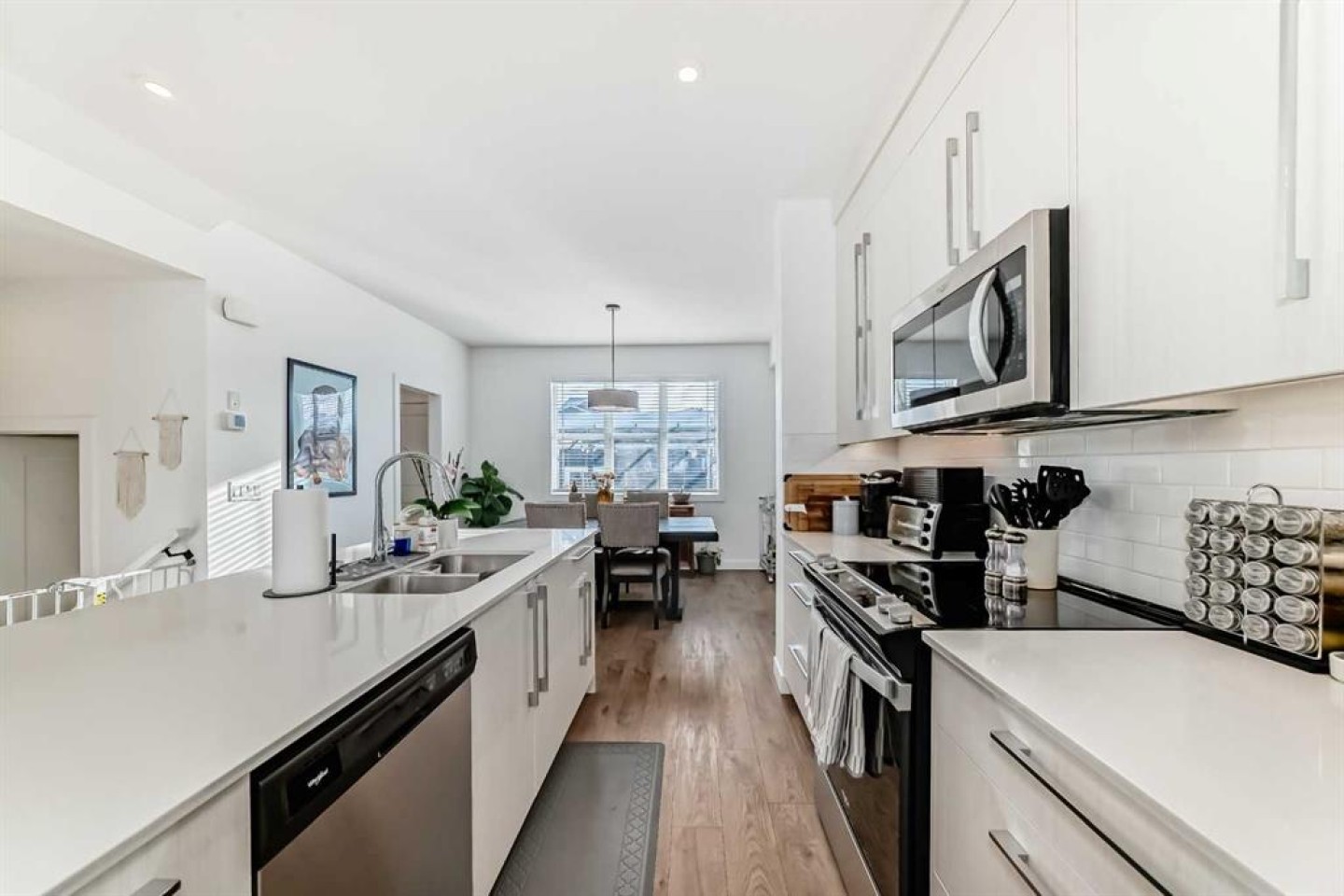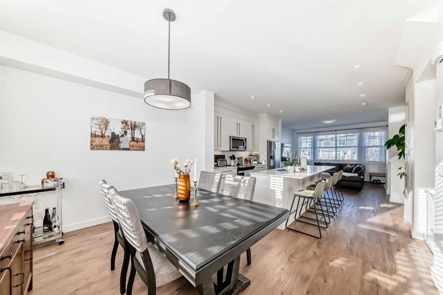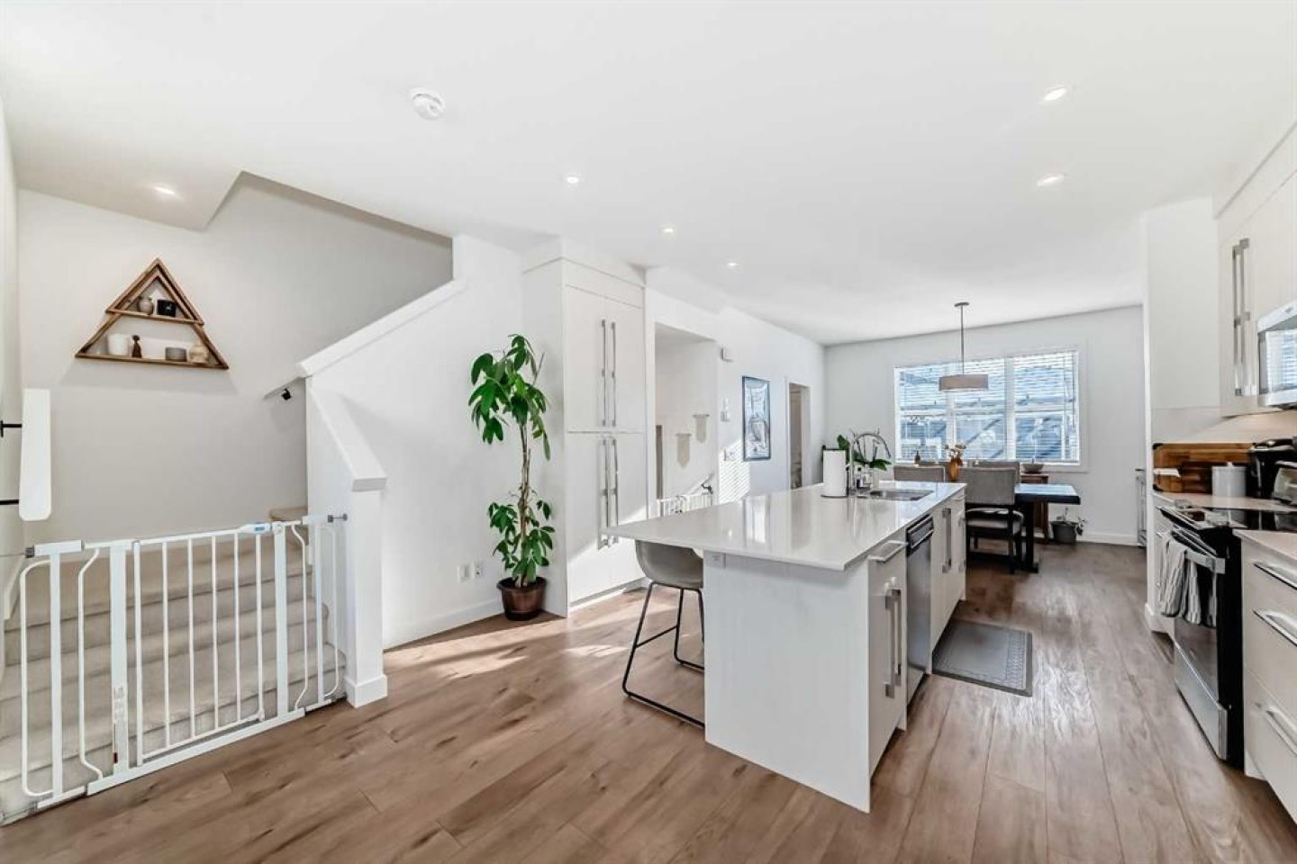 The main floor welcomes you with 9’ ceilings, pot lights throughout, wide staircases, and durable luxury vinyl plank flooring, setting the stage for a bright and inviting atmosphere. At the heart of the home is a contemporary kitchen featuring quartz countertops, abundant cabinetry, and a convenient breakfast bar that's perfect for casual meals or entertaining. The open layout flows effortlessly into the sun-filled living and dining areas, creating a warm and connected space for everyday living.