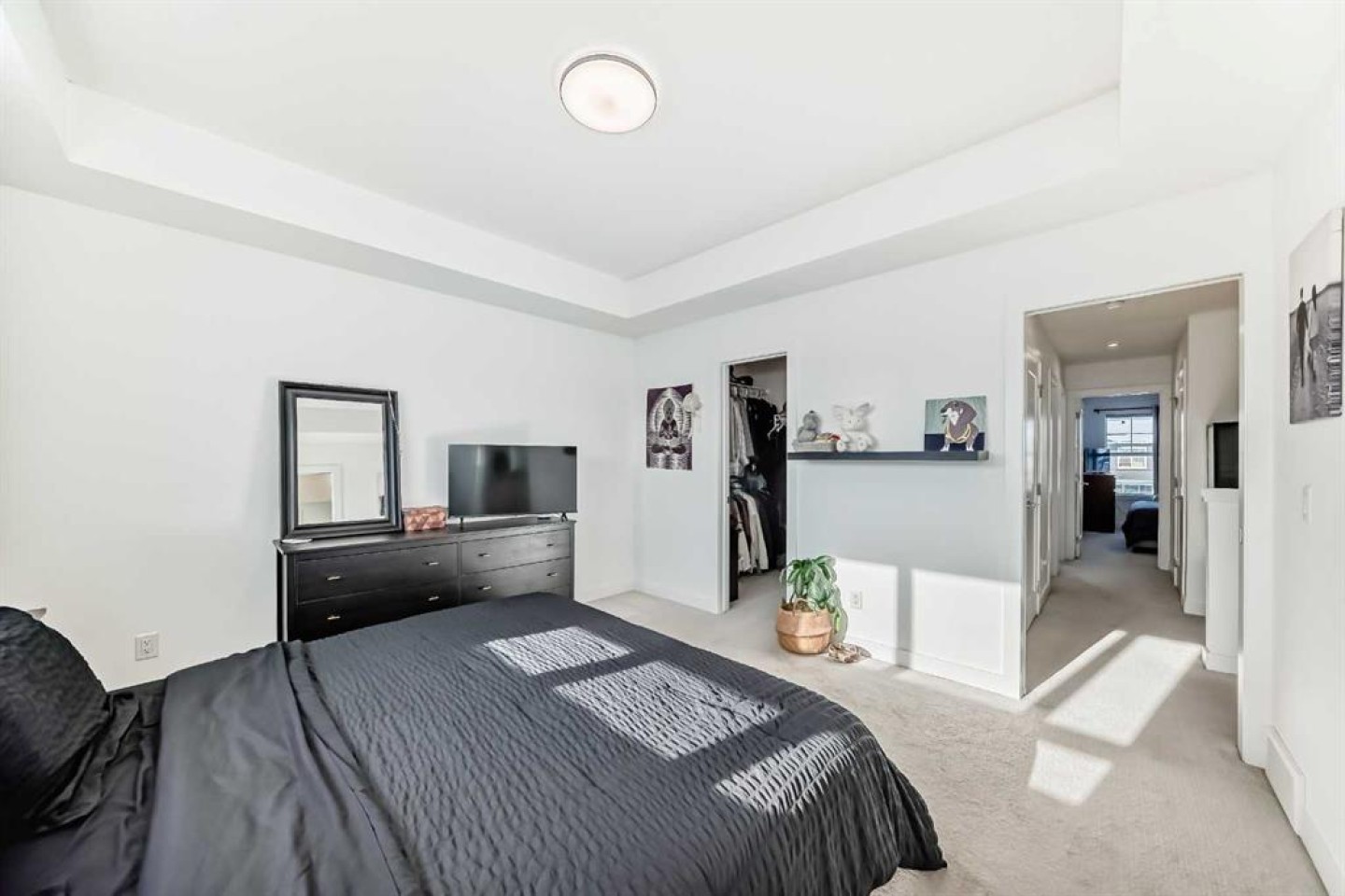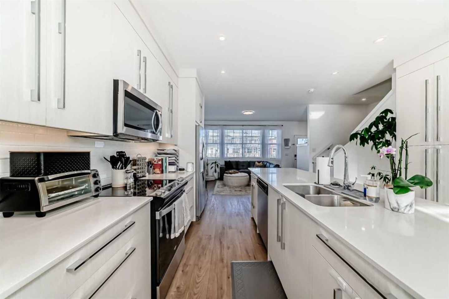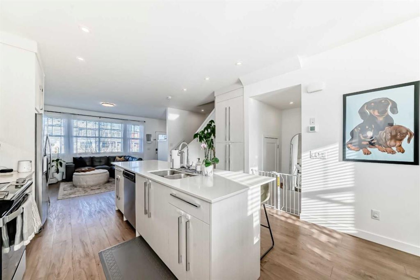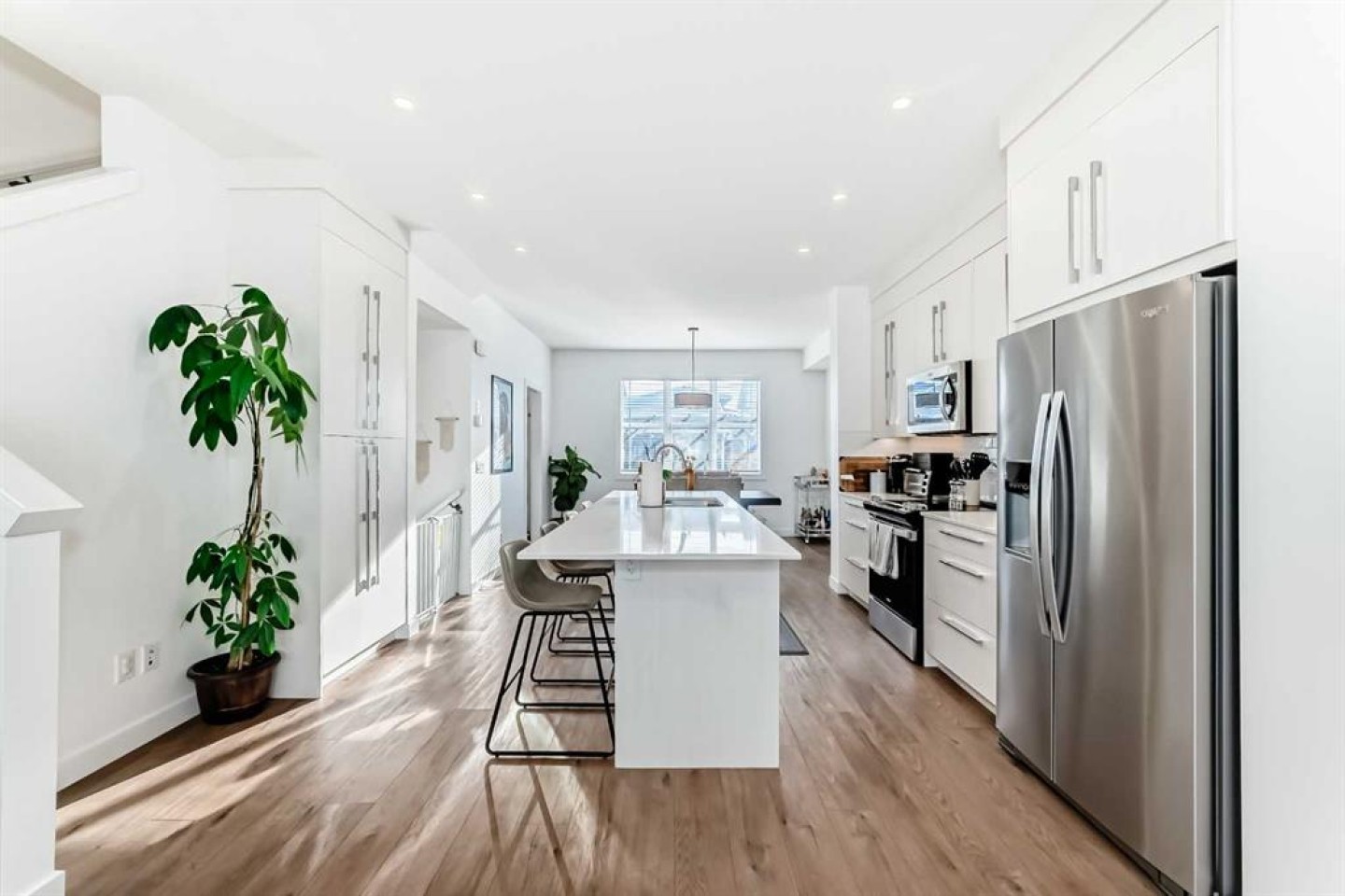 The main floor welcomes you with 9’ ceilings, pot lights throughout, wide staircases, and durable luxury vinyl plank flooring, setting the stage for a bright and inviting atmosphere. At the heart of the home is a contemporary kitchen featuring quartz countertops, abundant cabinetry, and a convenient breakfast bar that's perfect for casual meals or entertaining. The open layout flows effortlessly into the sun-filled living and dining areas, creating a warm and connected space for everyday living.