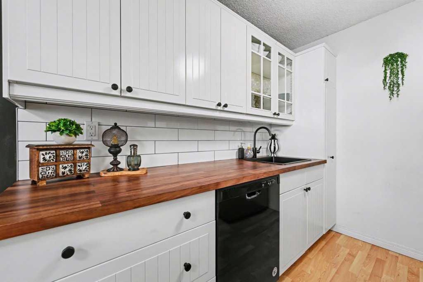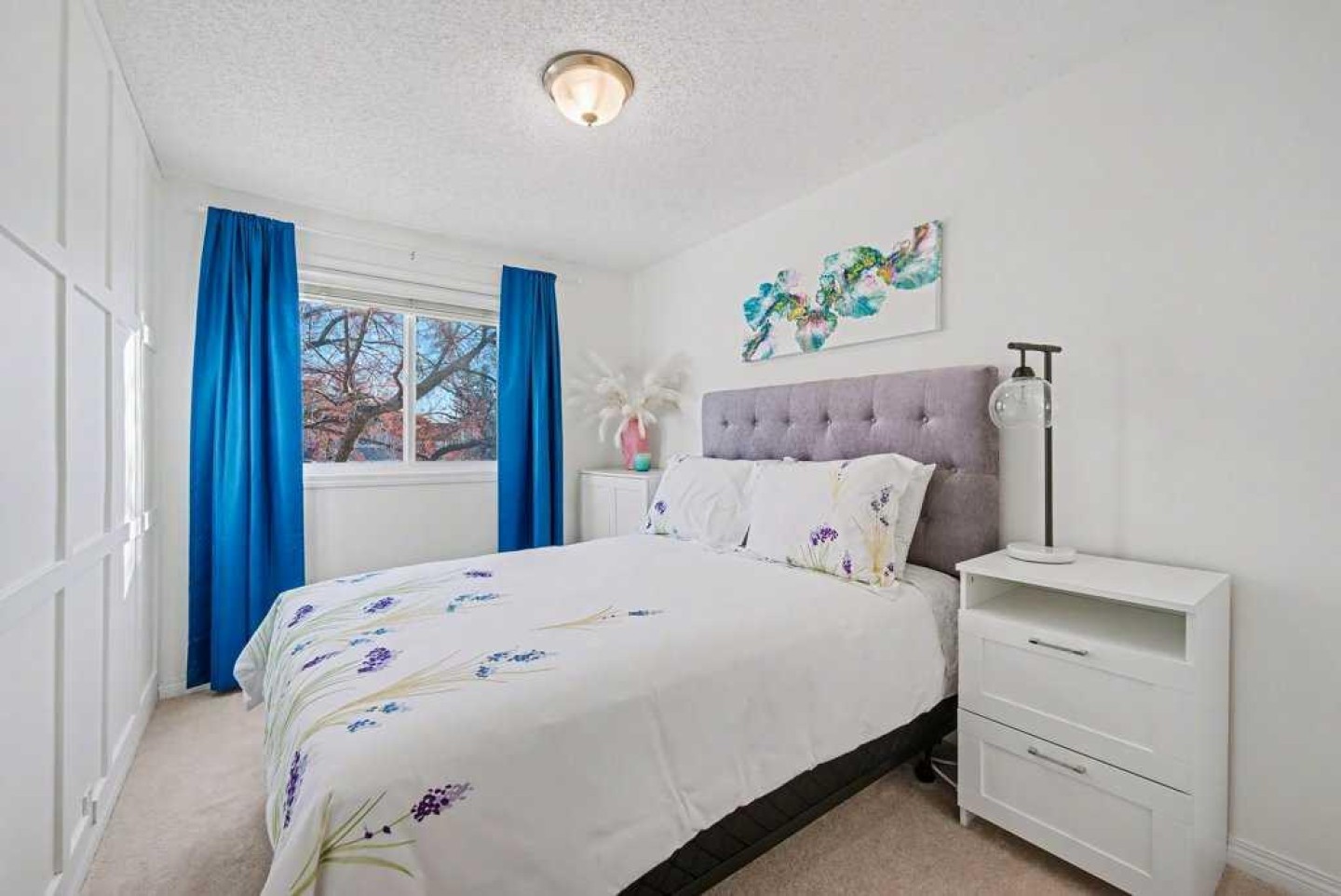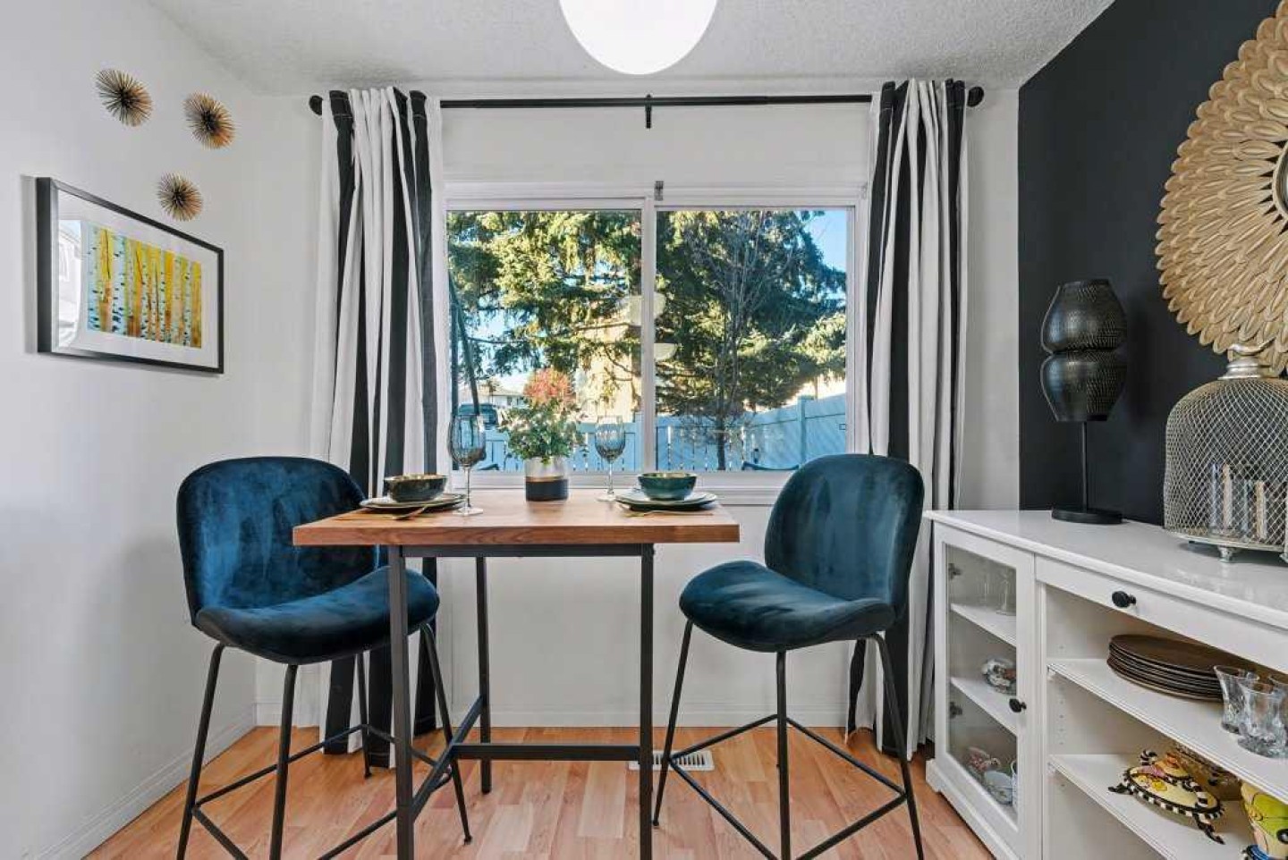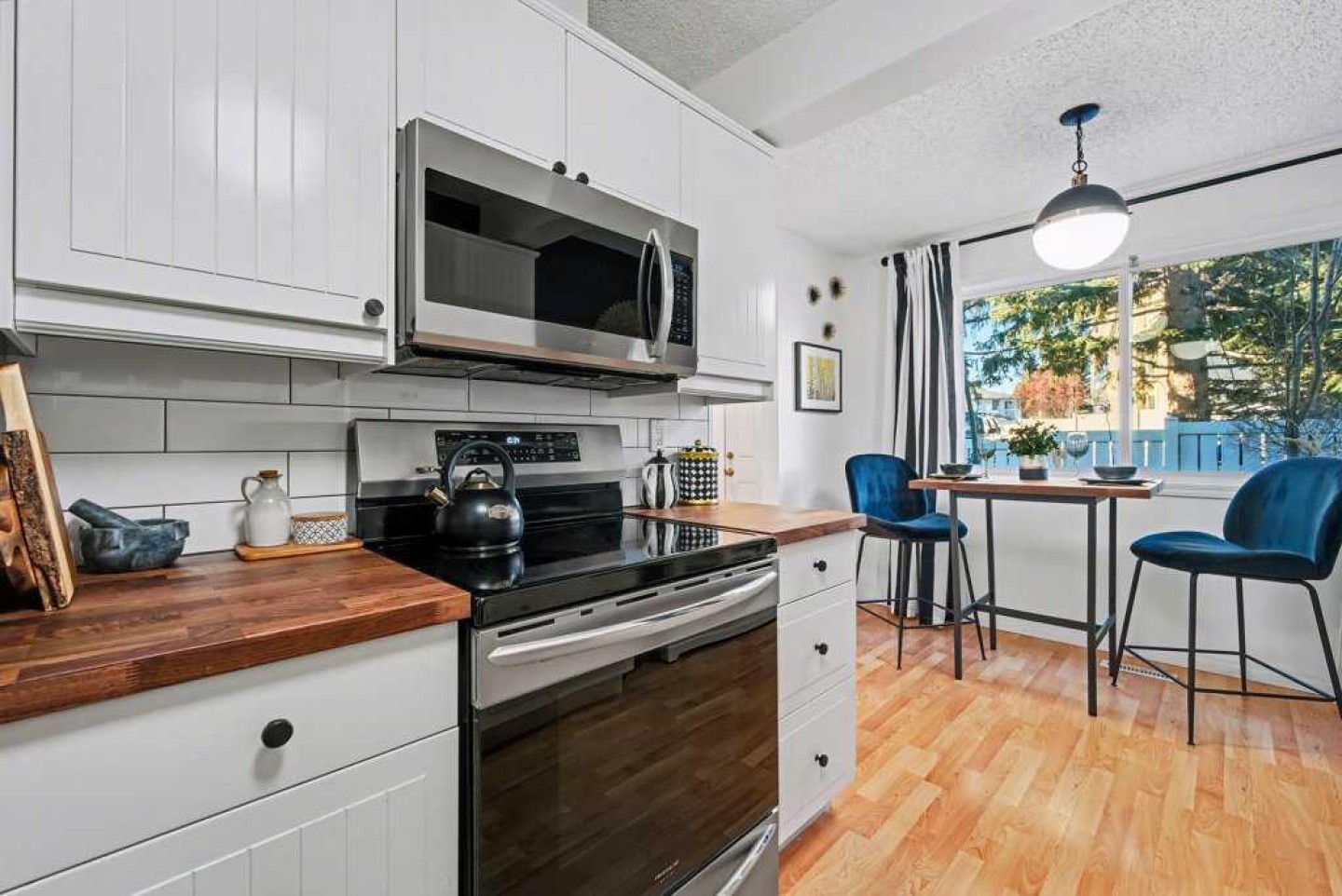 What a beauty! Perfect location on the back side of the complex in a quiet corner, steps away from Fish Creek Park! Go for long walks immersed in nature along paved pathways! This complex is incredibly well managed with strong reserve fund & low monthly condo fees that even include water & gas! The unit has been beautifully updated featuring modern design touches. Gleaming oak hardwood floors, newer windows & hot water tank. Re-designed kitchen features Black Walnut butcher block counter tops, loads of white cabinets & new appliances. Check out the induction stove! Enjoy your breakfast at the dining nook overlooking the beautiful back yard & watch the squirrels playing in the mature trees behind! 3 bedrooms & a fully updated bathroom upstairs. The Primary bedroom has room for a full furniture suite, features a large closet & nook area perfect for a computer or makeup desk. More space awaits you in the basement where the laundry machines & mechanicals are located. Look for the “secret door” that leads to a whimsical room professionally painted by a movie set designer. The yard has been transformed into a private oasis in nature. Enjoy low maintenance vinyl decking & stone bordered raised gardens! Walk out the back gate directly to your parking space. You will love getting to know the friendly, quiet, long term neighbours.