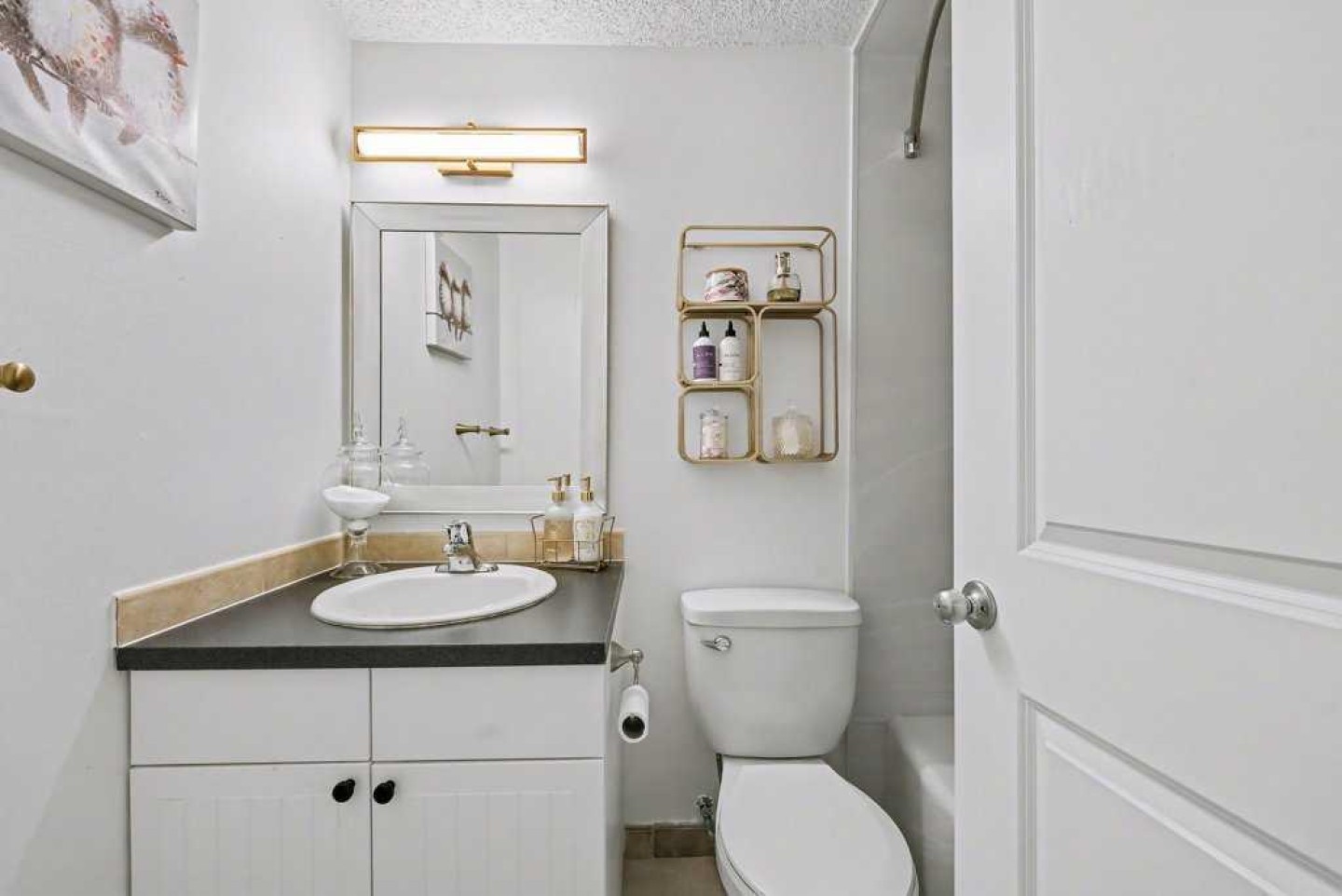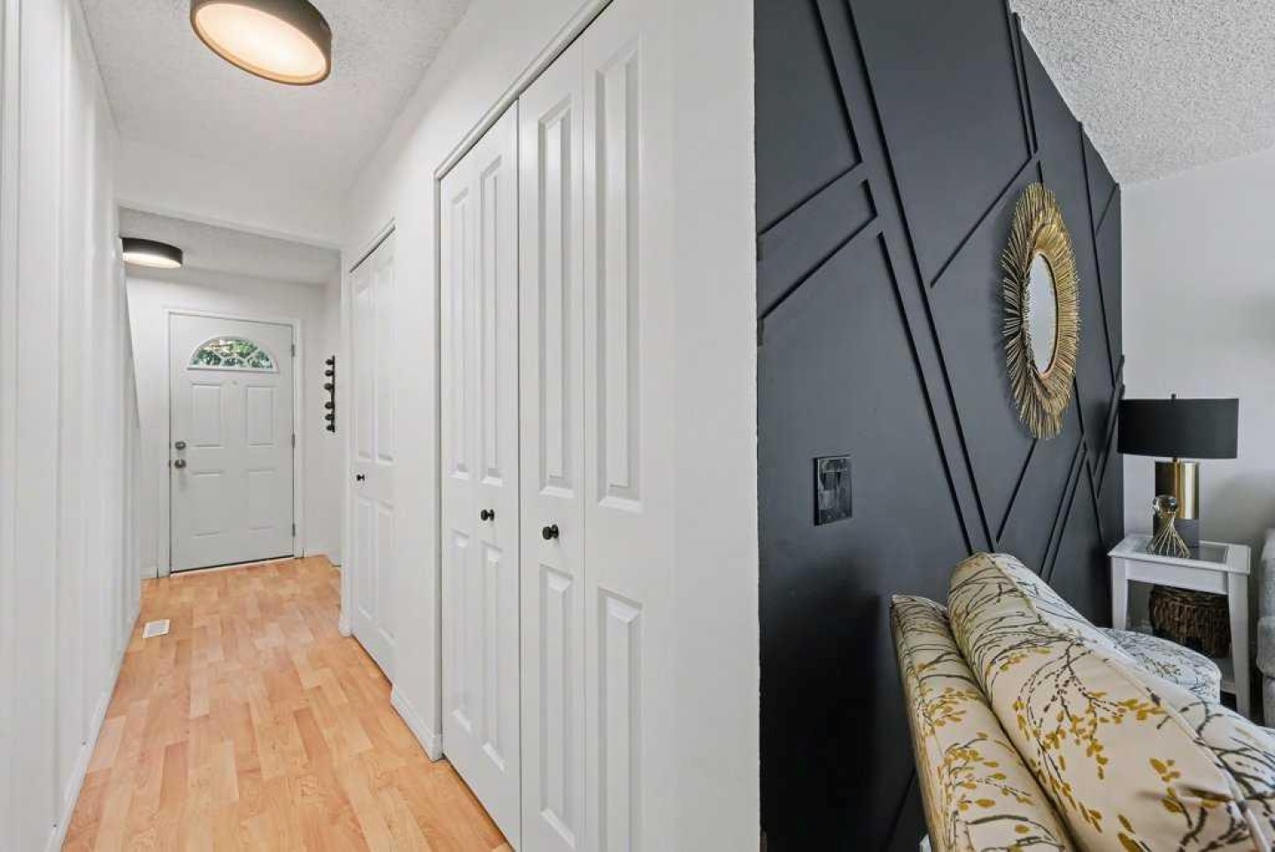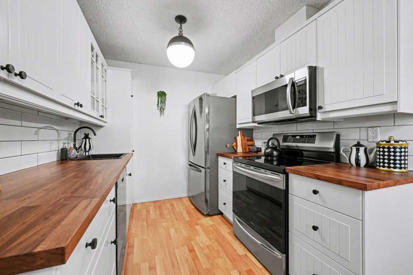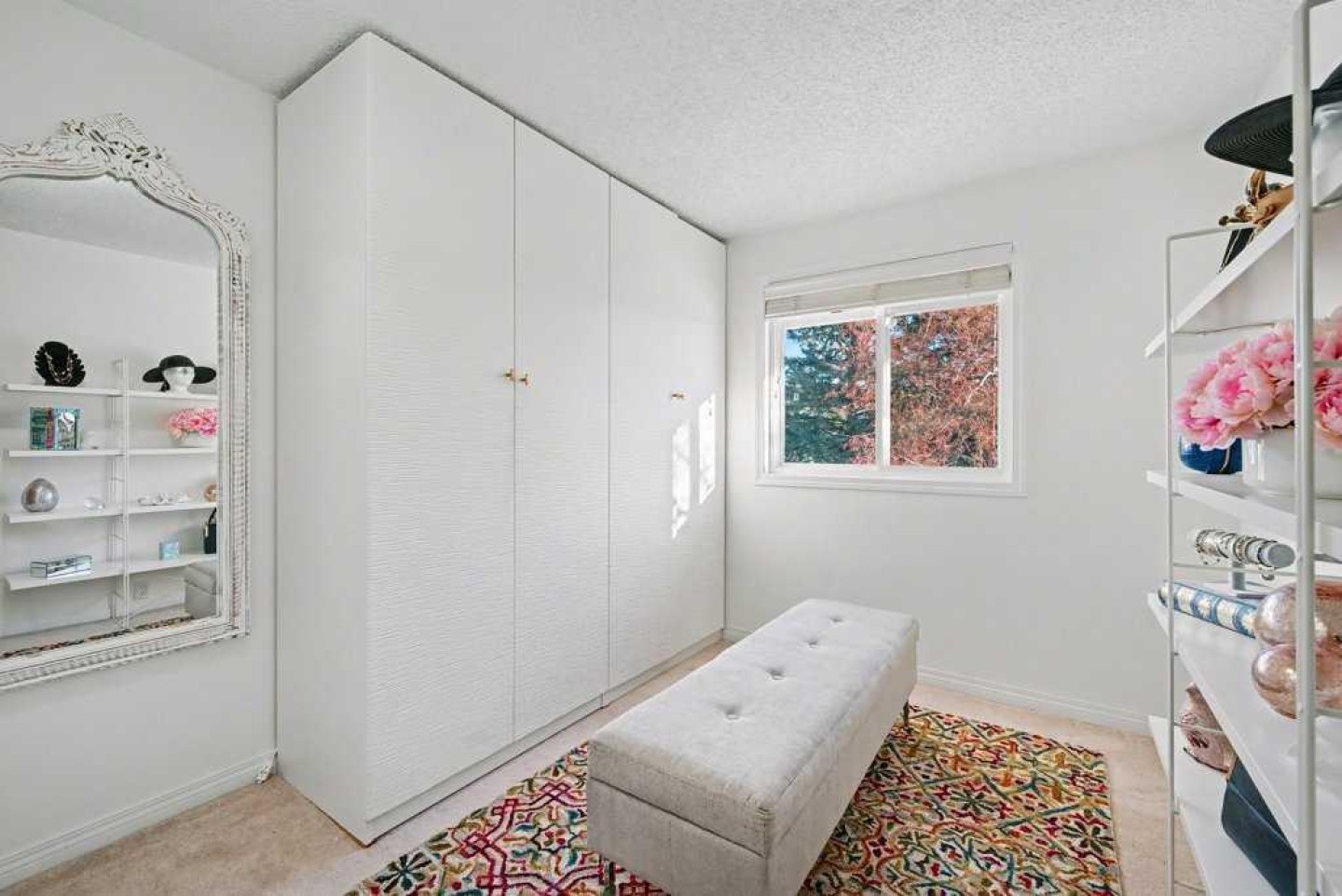 What a beauty! Perfect location on the back side of the complex in a quiet corner, steps away from Fish Creek Park! Go for long walks immersed in nature along paved pathways! This complex is incredibly well managed with strong reserve fund & low monthly condo fees that even include water & gas! The unit has been beautifully updated featuring modern design touches. Gleaming oak hardwood floors, newer windows & hot water tank. Re-designed kitchen features Black Walnut butcher block counter tops, loads of white cabinets & new appliances. Check out the induction stove! Enjoy your breakfast at the dining nook overlooking the beautiful back yard & watch the squirrels playing in the mature trees behind! 3 bedrooms & a fully updated bathroom upstairs. The Primary bedroom has room for a full furniture suite, features a large closet & nook area perfect for a computer or makeup desk. More space awaits you in the basement where the laundry machines & mechanicals are located. Look for the “secret door” that leads to a whimsical room professionally painted by a movie set designer. The yard has been transformed into a private oasis in nature. Enjoy low maintenance vinyl decking & stone bordered raised gardens! Walk out the back gate directly to your parking space. You will love getting to know the friendly, quiet, long term neighbours.