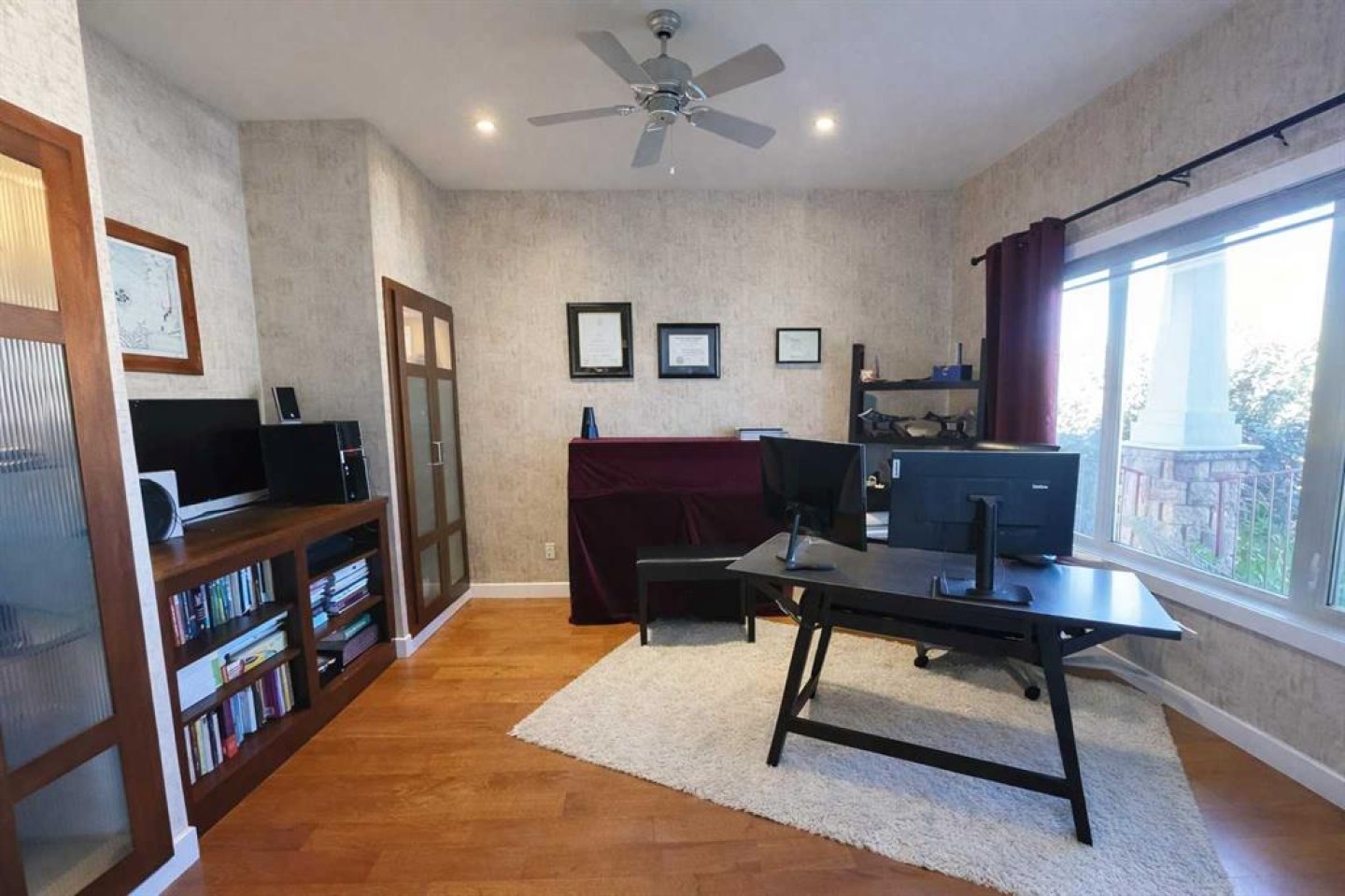 Experience refined luxury in this executive-style former Galko show home — a masterful blend of elegance, comfort, and exceptional design. Boasting over 4,000 sq. ft. of premium living space, including a bright walkout basement, this meticulously crafted residence offers breathtaking views of the lake and waterfall. Inside, you'll find rich hardwood floors, granite countertops, and a chef-inspired kitchen complete with a brand-new gas range, dual dishwashers, and generous prep and entertaining space. The dual-zone HVAC system,along with a furnace and hot water tank both approximately 3 years old, ensures efficient, year-round comfort throughout the home. The spa-inspired primary ensuite invites you to unwind with a marble shower and jacuzzi tub — your personal retreat for relaxation and rejuvenation. The fully finished walkout lower level is designed for entertaining and leisure, featuring a state-of-the-art theatre room, a fully equipped gym, wet bar, and a cozy gas fireplace. Another elegant fireplace graces the main living area, enhancing the home’s warmth and ambiance. Additional upgrades include brand-new carpeting throughout the basement, a new water softener, and numerous thoughtful touches that elevate both function and style. Located in the prestigious Paradise Canyon community, this one-of-a-kind property exemplifies upscale living at its finest — a true sanctuary of sophistication.