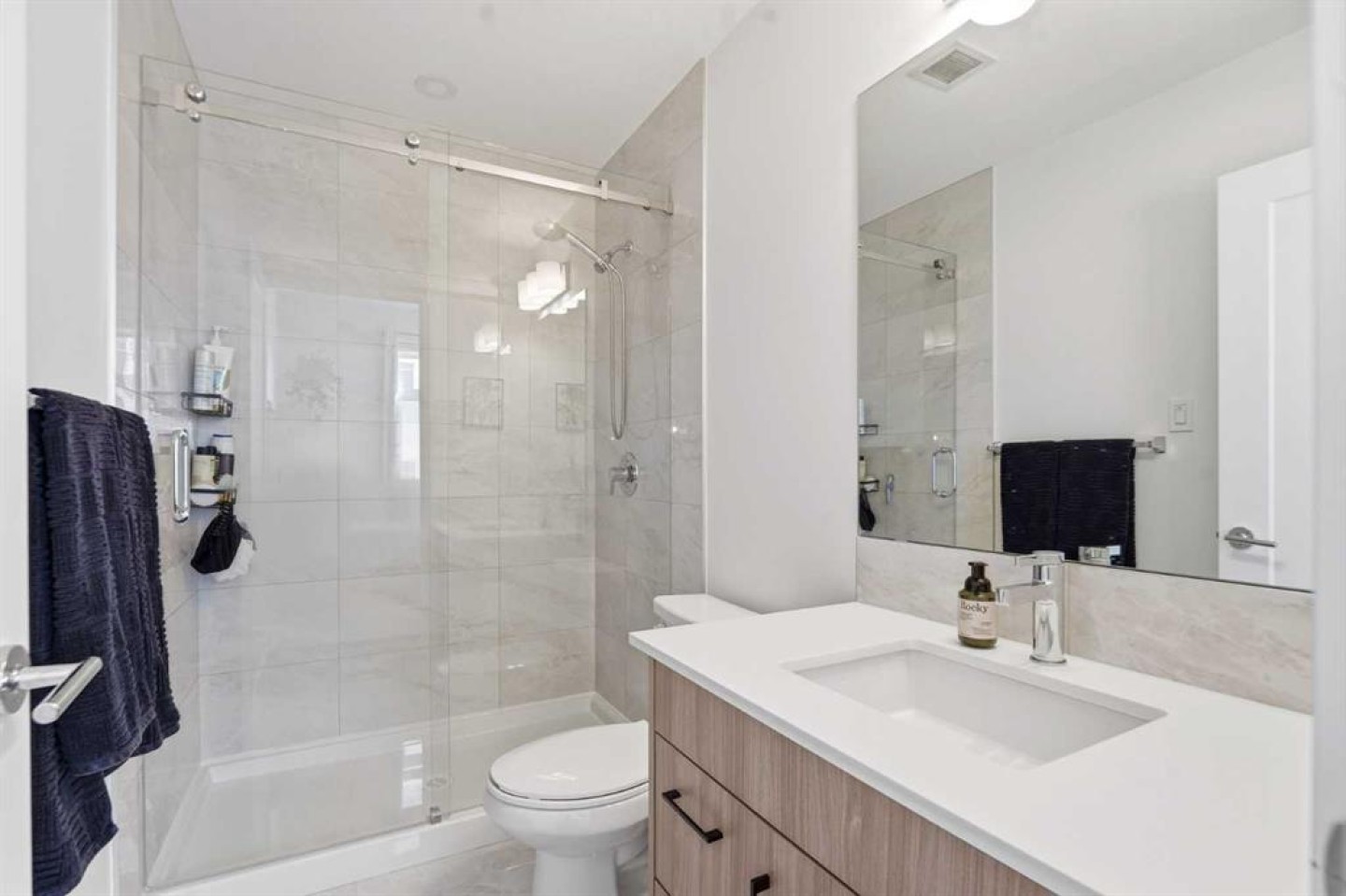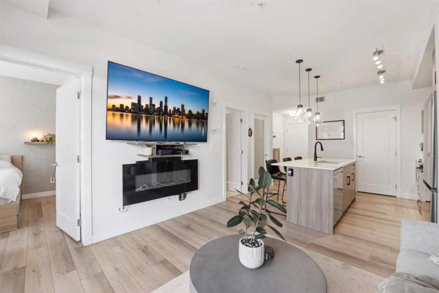 This 2-bedroom, 2-bathroom condo with AC offers a refined take on lake community living, complete with low condo fees of $327.50 including heat and water, titled underground parking, an assigned storage locker, in-suite laundry, and full access to the highly desirable Auburn Bay lake community. As you step inside, you’re welcomed by a well-appointed entryway with a convenient coat closet to your left. From here, the home opens up beautifully into the kitchen and main living space, immediately setting the tone with its bright, modern feel and thoughtful design. The kitchen is both stylish and functional, featuring ceiling-height cabinetry, quartz countertops, a stunning tile backsplash, black modern hardware, and upgraded lighting that adds warmth and character. Stainless steel appliances, a built-in microwave, sleek hood fan, and a silgranite undermount sink complete the space. Tucked seamlessly into a storage closet beside the kitchen is the in-suite laundry, keeping daily tasks out of sight while remaining easily accessible. Flowing openly from the kitchen, the living room is inviting and comfortable, anchored by a cozy electric fireplace with a built-in mantle. Large sliding glass doors fill the space with natural light and lead you onto the balcony, a outdoor retreat perfect for morning coffee, evening wine, or summer entertaining. The primary bedroom offers a calm and comfortable escape, featuring two closets and plenty of natural light. The private ensuite elevates the experience with a floor to ceiling tiled walk-in shower, quartz countertops, and an undermount sink, creating a spa-like feel without being overdone. Nearby, the second bedroom is generously sized and versatile, perfect as a guest room and/or office. The second bathroom is a full 4-piece with a tub and shower, ideal for guests or shared living. Throughout the home, thoughtful upgrades such as wide luxury vinyl plank flooring, 9-foot ceilings, air conditioning, and modern finishes create a polished, cohesive look that balances comfort with style. Add in the convenience of underground parking with a storage locker located directly behind the stall, and the everyday ease of condo living truly shines. Set between Auburn Bay and Mahogany, with walkable access to shops, dining, groceries, parks, and an off-leash dog park, this upgraded condo delivers everything you could hope for in a lake community - lifestyle, design, and value, without compromise.