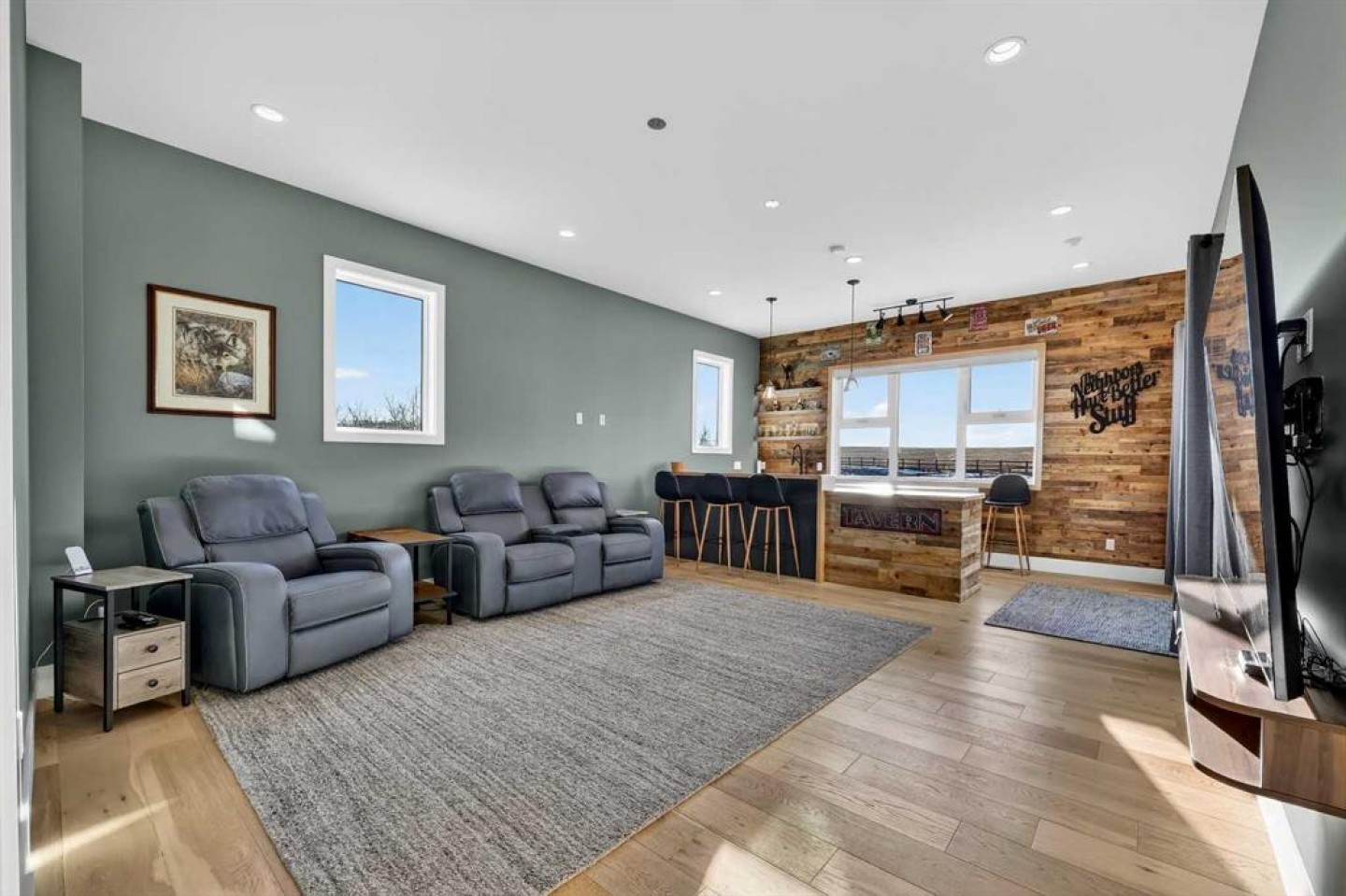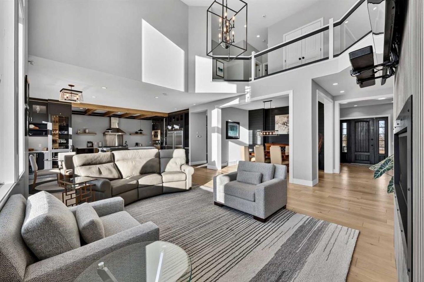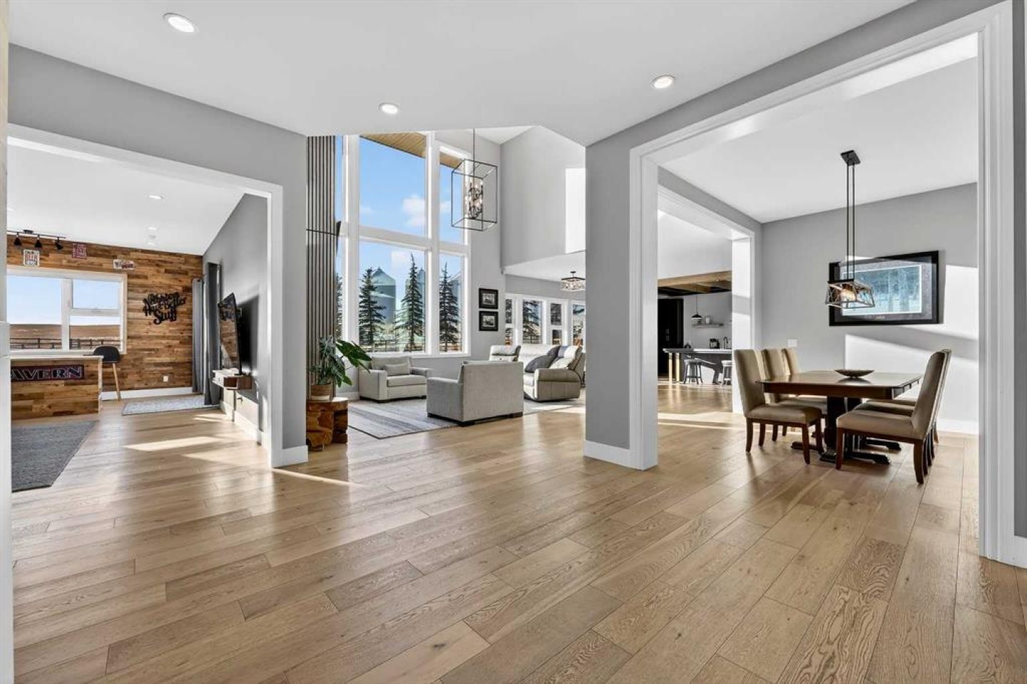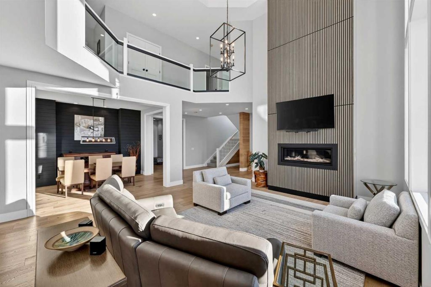 Step inside to soaring 20-foot ceilings, oversized windows, and sun-filled living spaces anchored by a modern fireplace. The main floor is thoughtfully laid out with a private home office, a grand living room, and a refined dining area with a statement feature wall and fireplace. The chef’s kitchen is fully outfitted with newer high-end appliances including a brand new chef's dream gas stove and dual ovens, quartz countertops, a large island, modern cabinetry and a walk-in pantry, perfectly blending function and style. A generous recreational flex space offers endless possibilities. An ideal games room, home gym, theatre, man cave, or easily converted into a main-floor bedroom with exterior access to the massive deck.