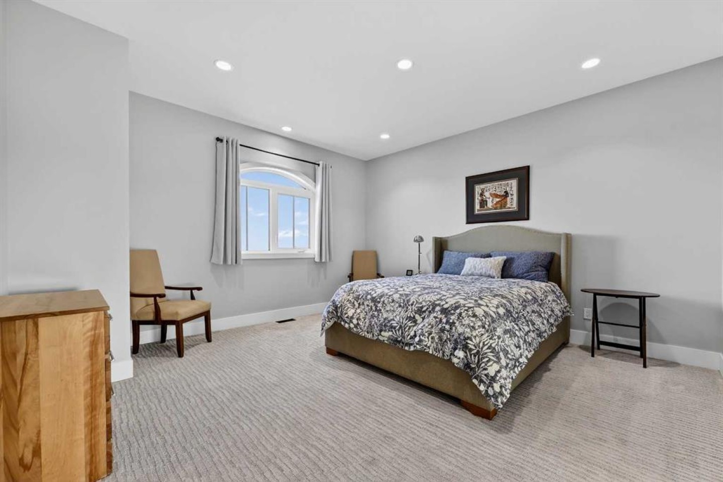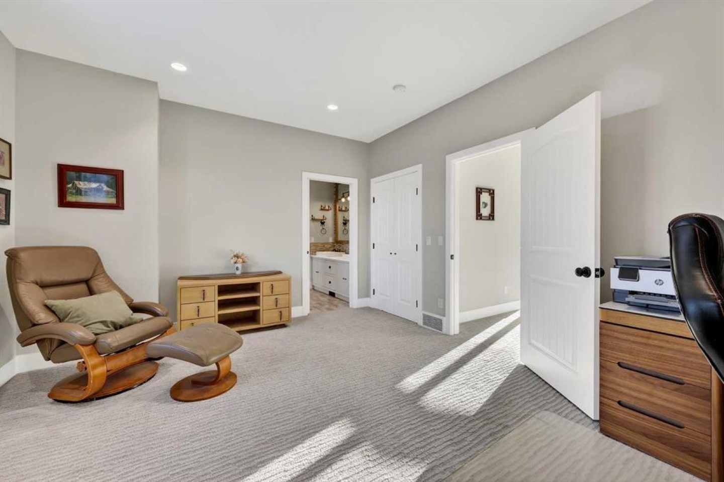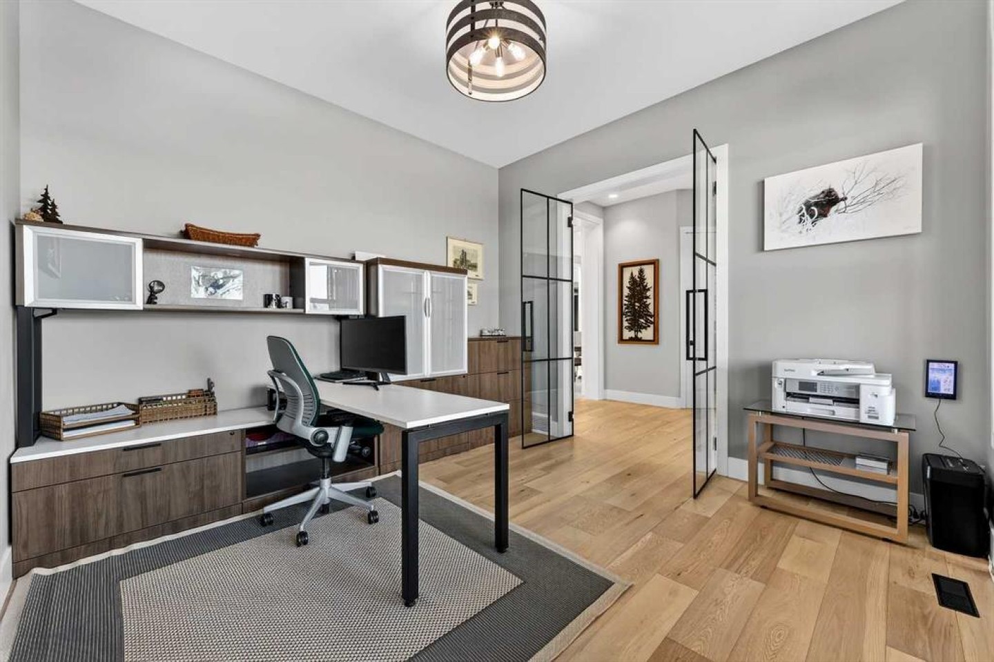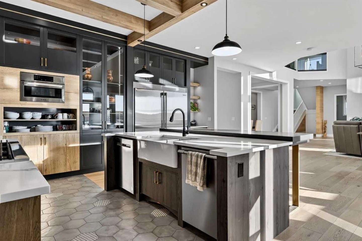 Step inside to soaring 20-foot ceilings, oversized windows, and sun-filled living spaces anchored by a modern fireplace. The main floor is thoughtfully laid out with a private home office, a grand living room, and a refined dining area with a statement feature wall and fireplace. The chef’s kitchen is fully outfitted with newer high-end appliances including a brand new chef's dream gas stove and dual ovens, quartz countertops, a large island, modern cabinetry and a walk-in pantry, perfectly blending function and style. A generous recreational flex space offers endless possibilities. An ideal games room, home gym, theatre, man cave, or easily converted into a main-floor bedroom with exterior access to the massive deck.