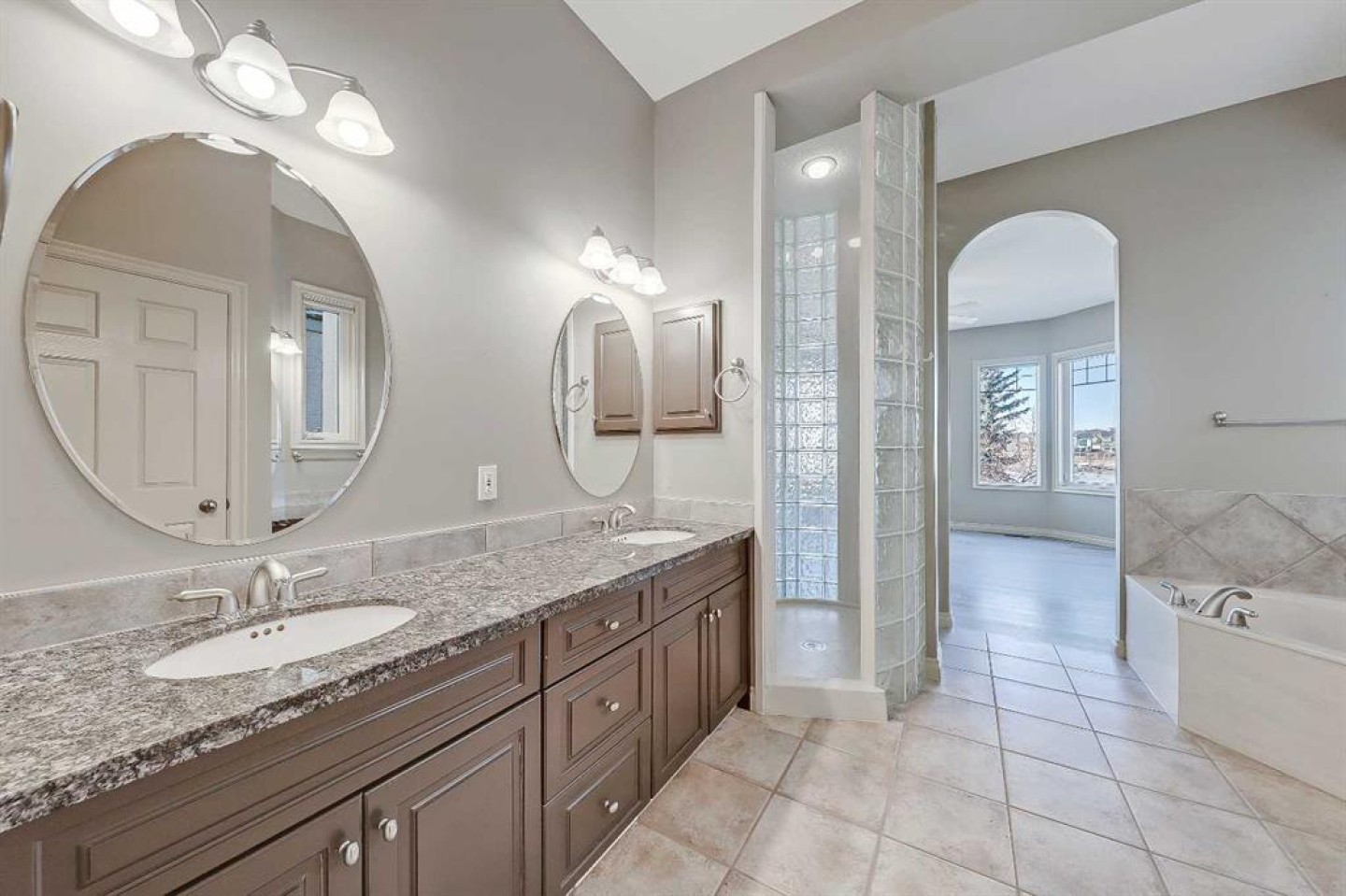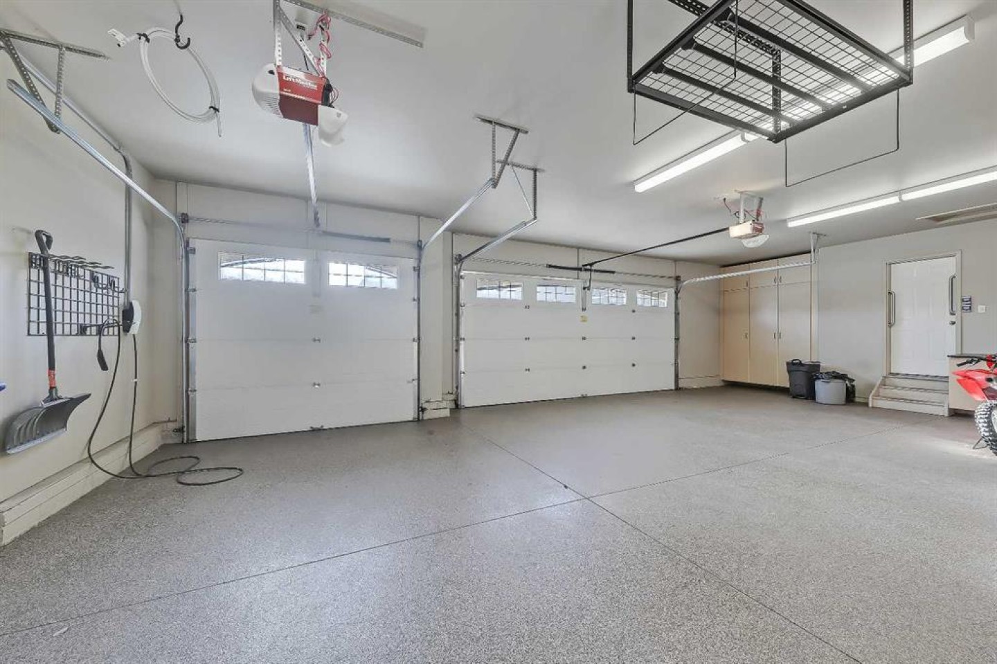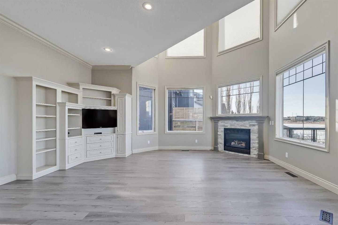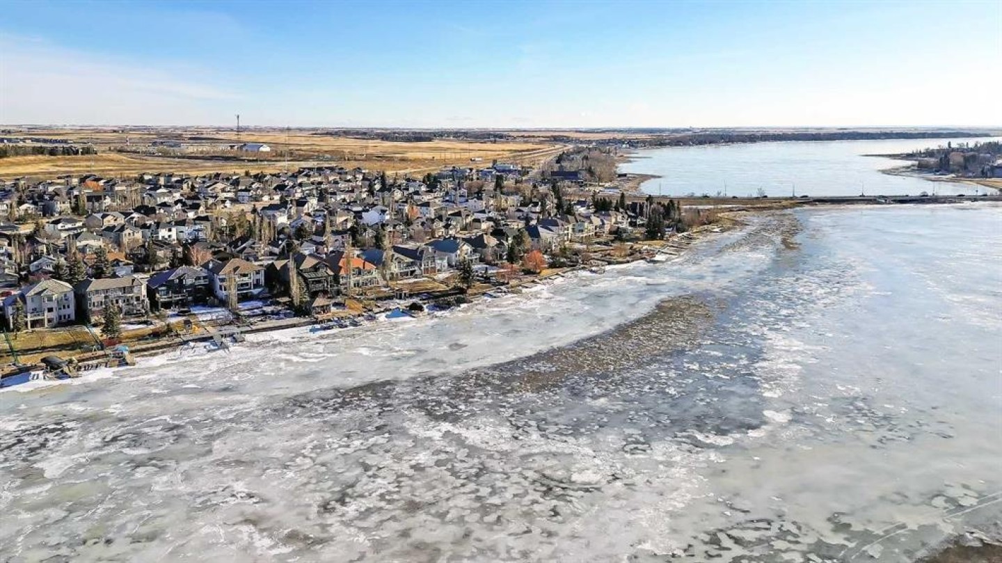 LAKEFRONT LIVING IN THE COVE, one of Chestermere’s most desirable communities! This fully finished, executive walk-out bungalow-style home sits on a massive 1/3+ acre lot backing directly onto Chestermere Lake! Offering over 4,900 sq. ft in total (with over 3,000 sq. ft. above grade), this property features a total of 5 bedrooms, 3.5 bathrooms, a fully developed walkout basement, an attached triple-car garage, and a private dock with a private boat lift. A bright, open-to-above foyer welcomes you into the main level, highlighted by 10-ft ceilings, crown moulding, built-in speakers, and expansive windows overlooking the lake. The oversized kitchen is designed for both cooking and entertaining, complete with stainless steel appliances, including a French door fridge, a wall oven and microwave, a 5-burner gas cooktop, an undercounter beverage fridge, a walk-in pantry, granite countertops, a triple-basin sink, a prep counter with a second sink, and a casual dining area overlooking the water. The adjacent 2-storey living room features a gas fireplace with a stone surround and double patio doors that open to a large stamped concrete deck with incredible lake views. The main-floor primary suite offers direct water views through multiple bay windows, a walk-in closet with built-ins, and a spa-inspired 5-piece ensuite with soaker tub, glass shower, and dual vanity sinks. A mudroom, powder room, laundry, and interior direct access to the heated, epoxy-finished triple garage complete this level. Upstairs, a spacious bonus room with a private balcony overlooks the lake, accompanied by two additional bedrooms with walk-in closets and a well-appointed main bath with dual sinks and separate tub/shower areas. The fully-developed walk-out basement features hydronic in-floor heating, a large recreation space with media built-ins, a wet bar, wine storage, two additional bedrooms, a full bath, and extensive storage. Outside, the enormous, sunny West-facing landscaped backyard enjoys incredible lake views, stamped concrete pathways and multiple patio areas, plus a private dock with a boat lift. and storage shed. Additional highlights include cement shingle roofing, soffit lighting, dual A/C units, and 200-amp service. Located near schools, shopping, parks, and recreation, this is a rare opportunity to own a true lakefront property in one of Chestermere’s most desirable communities.