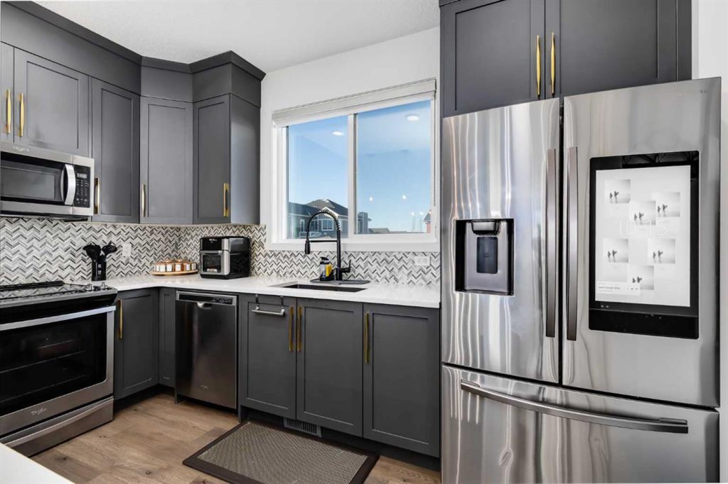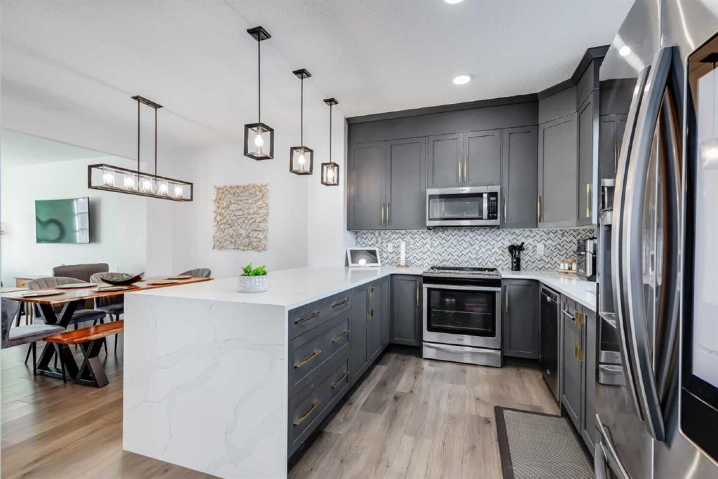 The open-concept layout offers a seamless flow between the living room, dining area, and kitchen, making the space both functional and inviting. Located at the back of the home, the kitchen features quartz countertops throughout, finished with a stylish waterfall edge detail that adds a clean, modern touch. A convenient half bath is located on the landing leading down to the lower level.