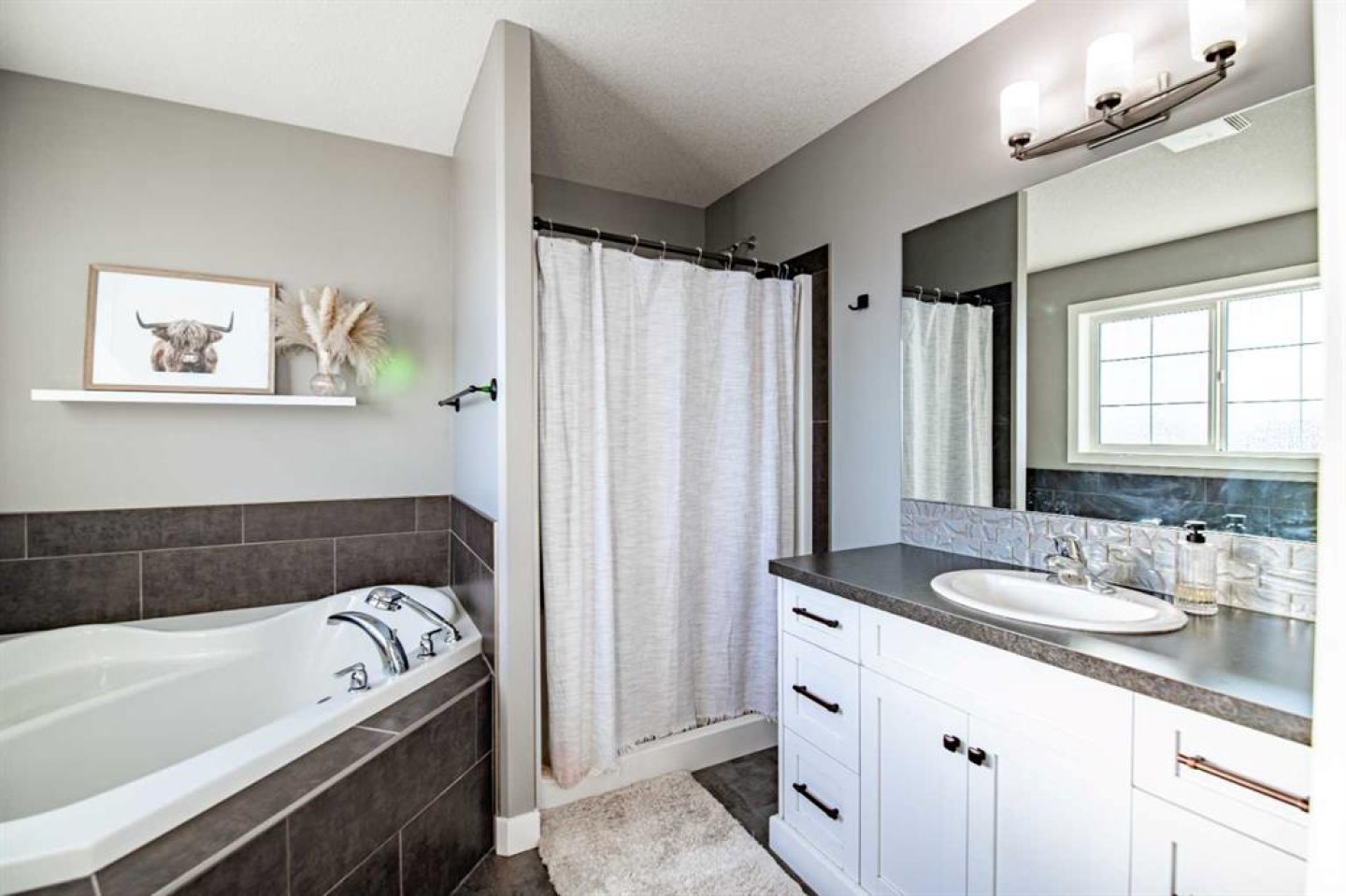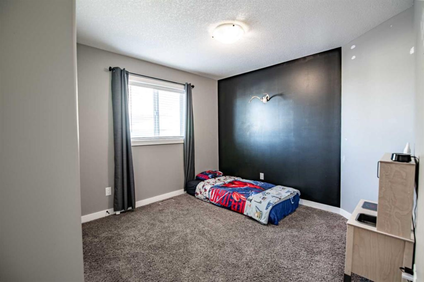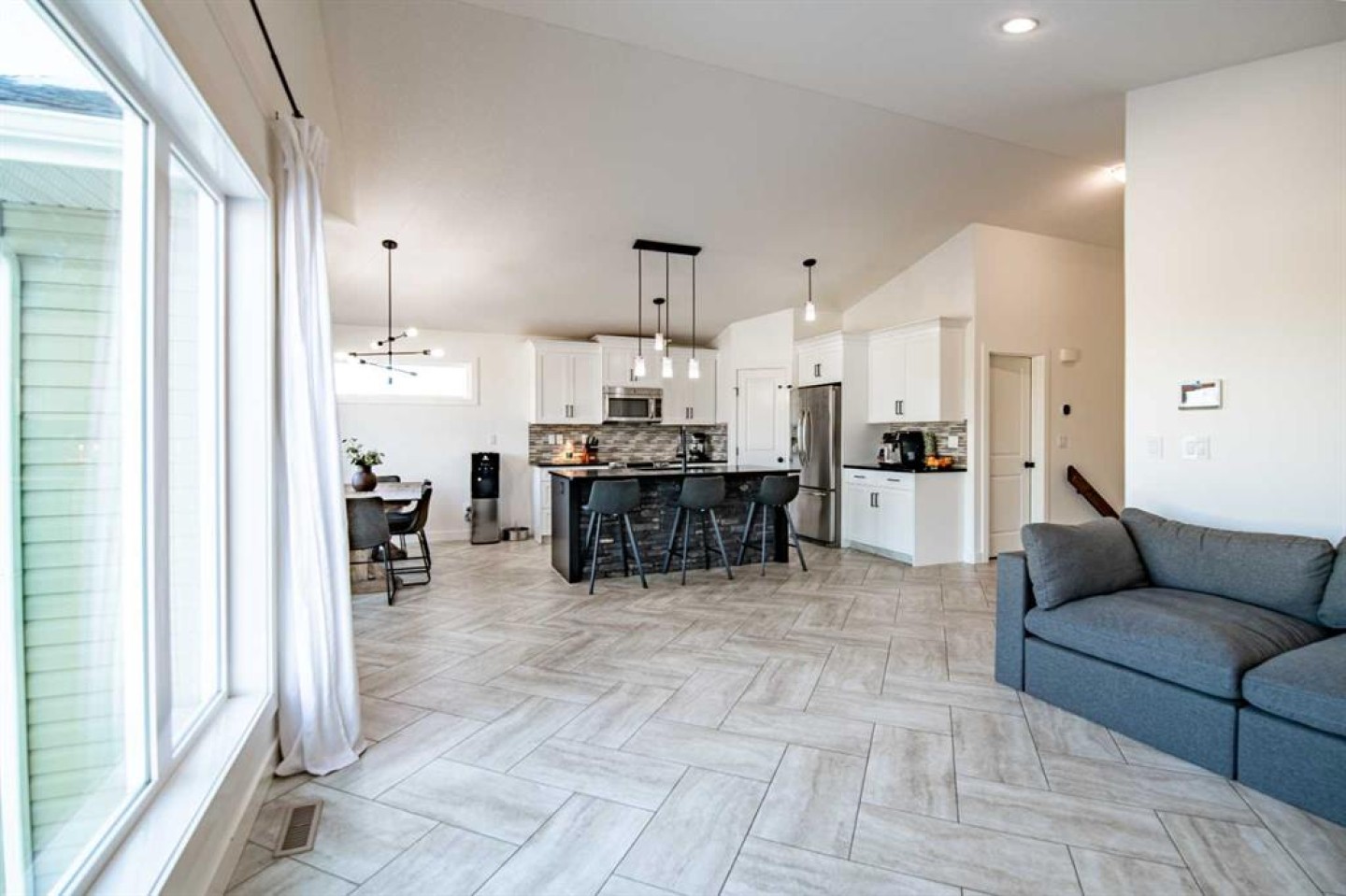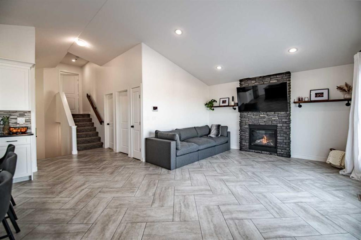 Welcome to this fully finished modified bi-level home in Blackfalds, ideally located on a pie-shaped lot and built for turnkey living. The maintenance-free front yard, stained concrete driveway, and permanent outdoor lighting offer standout curb appeal. Inside, enjoy a bright open-concept main floor with vaulted ceilings, large windows, a gas fireplace with black rock finish, and a stylish kitchen featuring quartz countertops, stainless steel appliances, a pantry, and island seating. A rear deck (with gas hook up) overlooking the entire backyard, Two bedrooms and a full bath complete the main level, while the private upper-level primary suite includes a walk-in closet and ensuite. The walkout basement is warm and inviting with 9’ ceilings, in-floor heat, large windows, a wet bar, an additional bedroom, and full bathroom—perfect for entertaining and summer living. Upgrades include a 3-stage whole-home water filtration system, water softener, two hot water tanks, central A/C, central vacuum, and solid core doors. Step outside to the massive lower 29’ x 14’ deck, fully fenced yard, and garden shed. The oversized 22’ x 25’ heated garage features hot and cold water with a sink. A rare walkout bi-level with this level of finish—move-in ready and built for comfort.