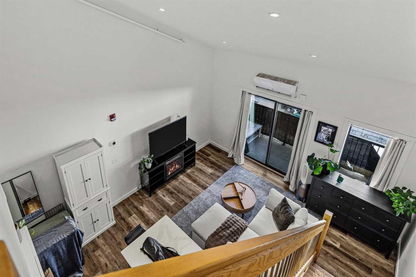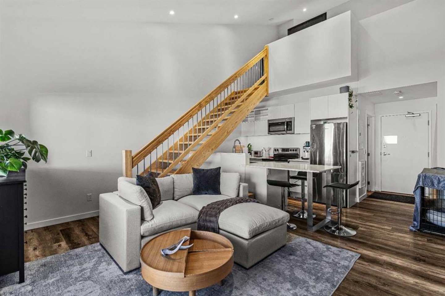 Soaring ceilings and large windows create a bright, inviting main living area that brings the outdoors in. The kitchen features granite countertops, while the functional loft bedroom offers a flexible layout ideal for everyday living or working from home.