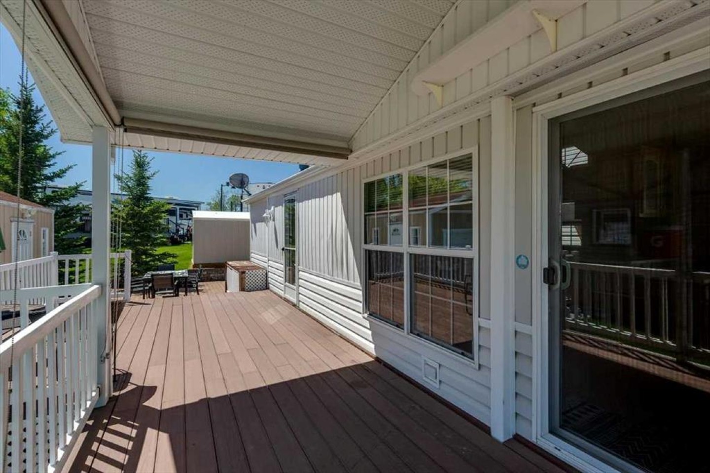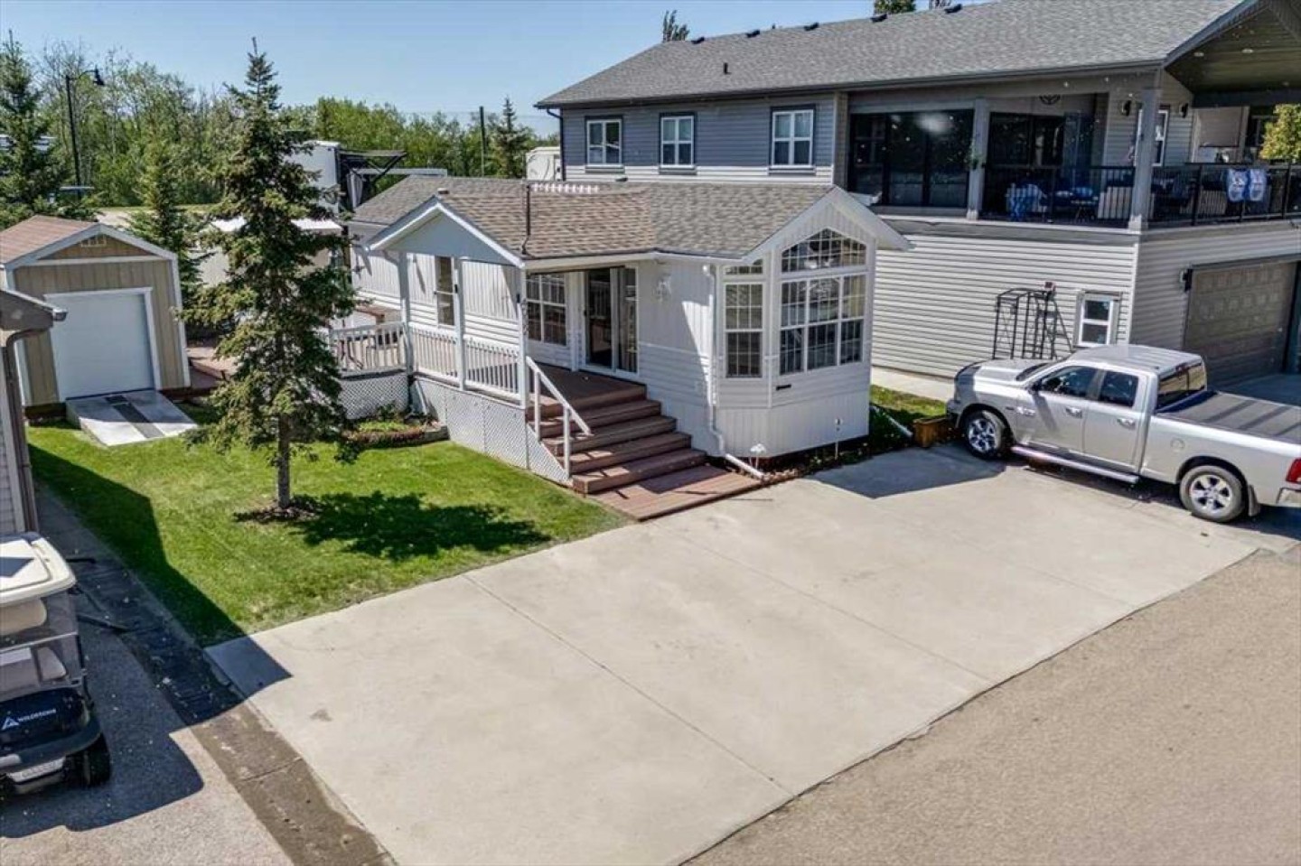 This fully winterized park model unit features an open-concept layout with vaulted ceilings and floor-to-ceiling windows that flood the space with natural light. The spacious living area includes an electric fireplace for cozy evenings, while the modern kitchen is equipped with a gas stove, fridge, microwave, down the hall, you have a stacked washer/dryer. You will be very comfortable with 2 bedrooms, the primary bedroom has beautiful built-ins for storage. Also enjoy a spacious 4 piece bath. Step outside onto the south-facing composite deck, partially covered for all-weather enjoyment. Patio pavers along the side and back provide extended outdoor living space, perfect for morning coffee or enjoying a night under the stars. A 12x9 insulated shed is included for extra storage. Never worry about parking for your boat or golf cart with a 4 car concrete driveway.