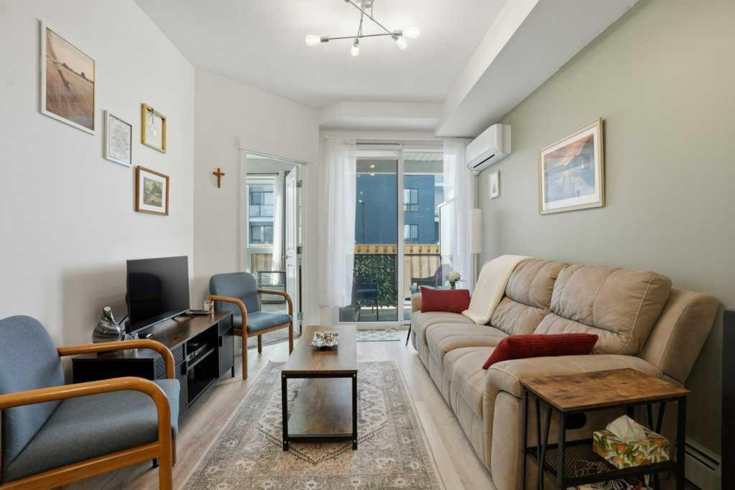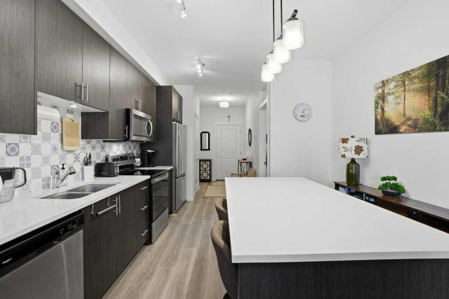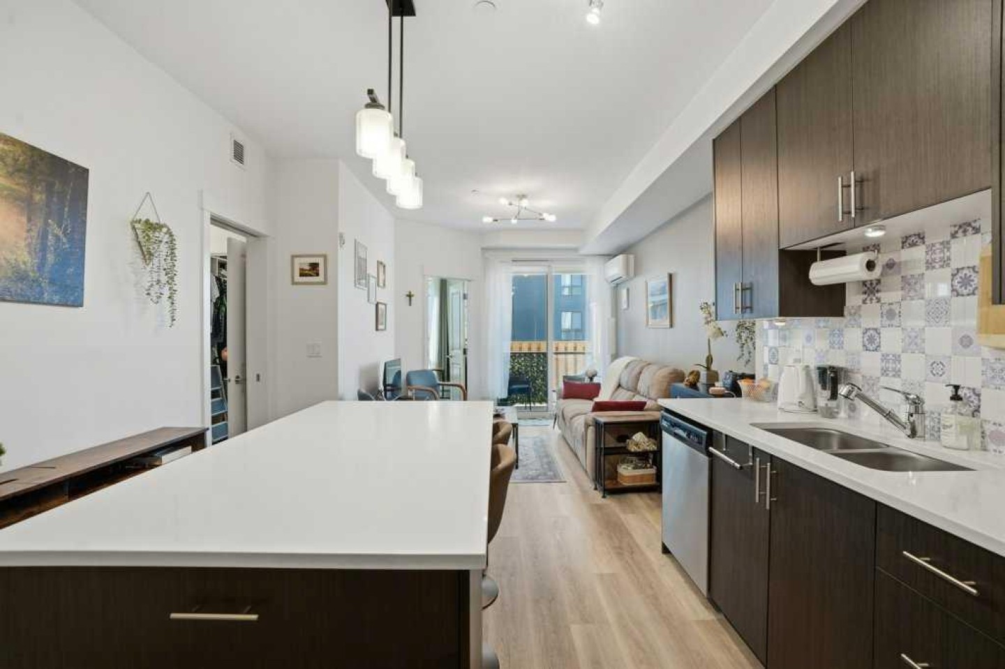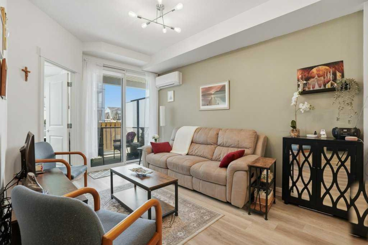Modern Comfort & a Prime Location. Discover this stylish two bedroom condo in the heart of Sage Hill, designed for both comfort and convenience. The open-concept layout welcomes you with a spacious foyer that flows seamlessly into the kitchen, living area, and the private west facing balcony, ideal for entertaining or relaxing at home. Enjoy a bright, neutral color palette, durable vinyl plank flooring, air conditioning, luxurious quartz counter tops and stainless-steel appliances. The unit features 9 foot ceilings ,in-suite laundry with a washer and dryer for added convenience. The primary bedroom boasts a custom walk-in closet and private access to a four-piece bathroom, the flex room off the entry is perfect for a home office or guest bedroom. Step outside to scenic green spaces and walking/biking paths, bringing nature close to home. Shopping and dining are minutes away at Sage Hill Crossing, with quick access to Beacon Hill Centre and Costco. Commuting is simple with nearby Stoney Trail, connecting you to the entire city. Experience designer style, modern amenities, upscale finishes including Front load washer & dryer, upgraded light fixtures Quartz counter tops through out, Island kitchen plus full height kitchen cabinets and an unbeatable location—this home truly has it all.