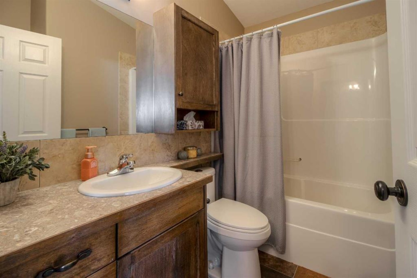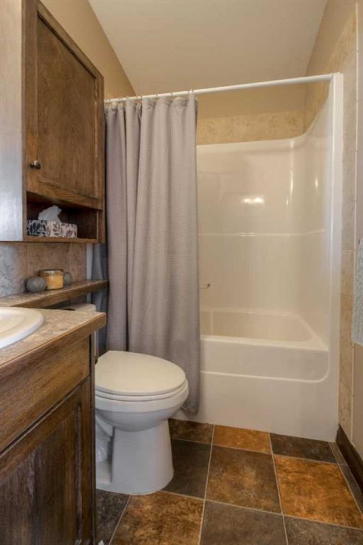 The primary bedroom is conveniently located on the main floor and features dual closets and a private ensuite complete with a jetted tub. Upstairs, you’ll find two additional bedrooms and a full bathroom, making it an ideal layout for children or guests.