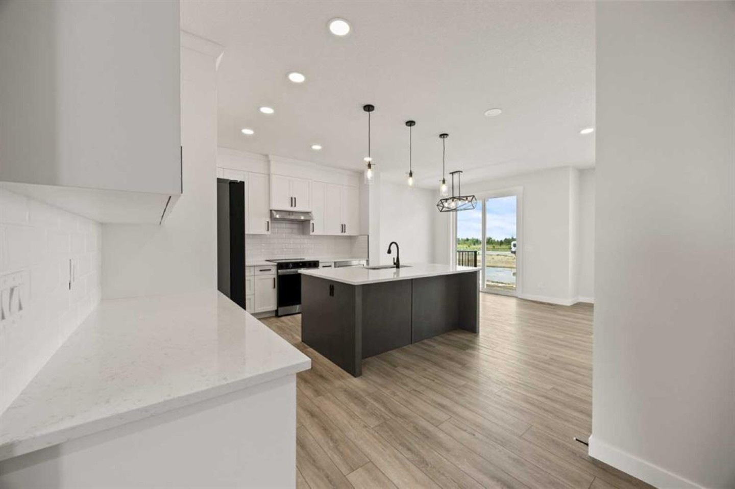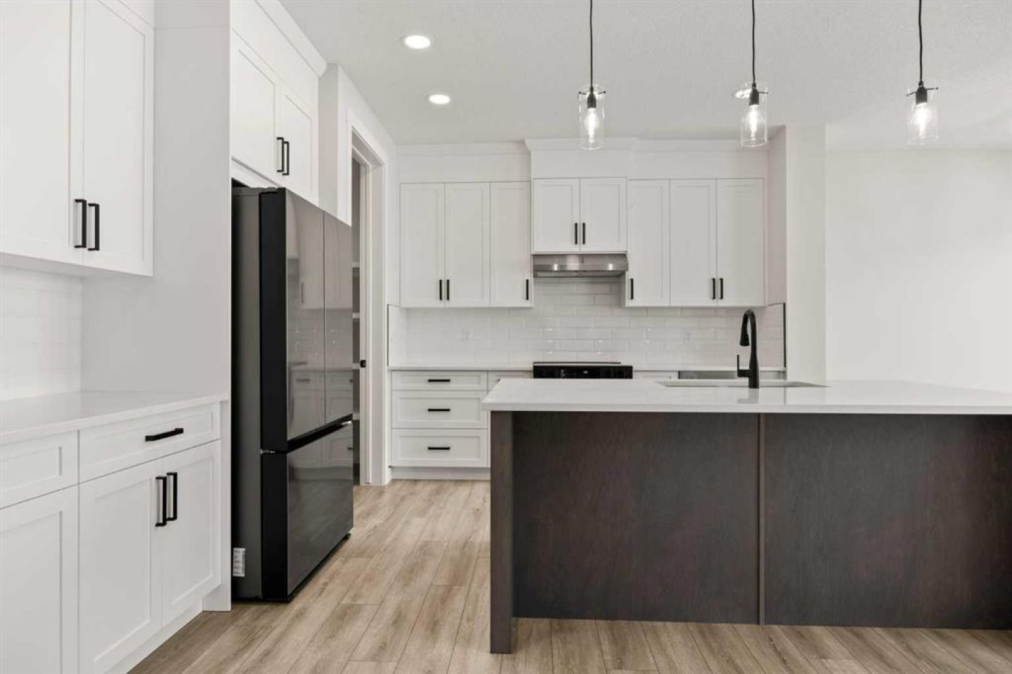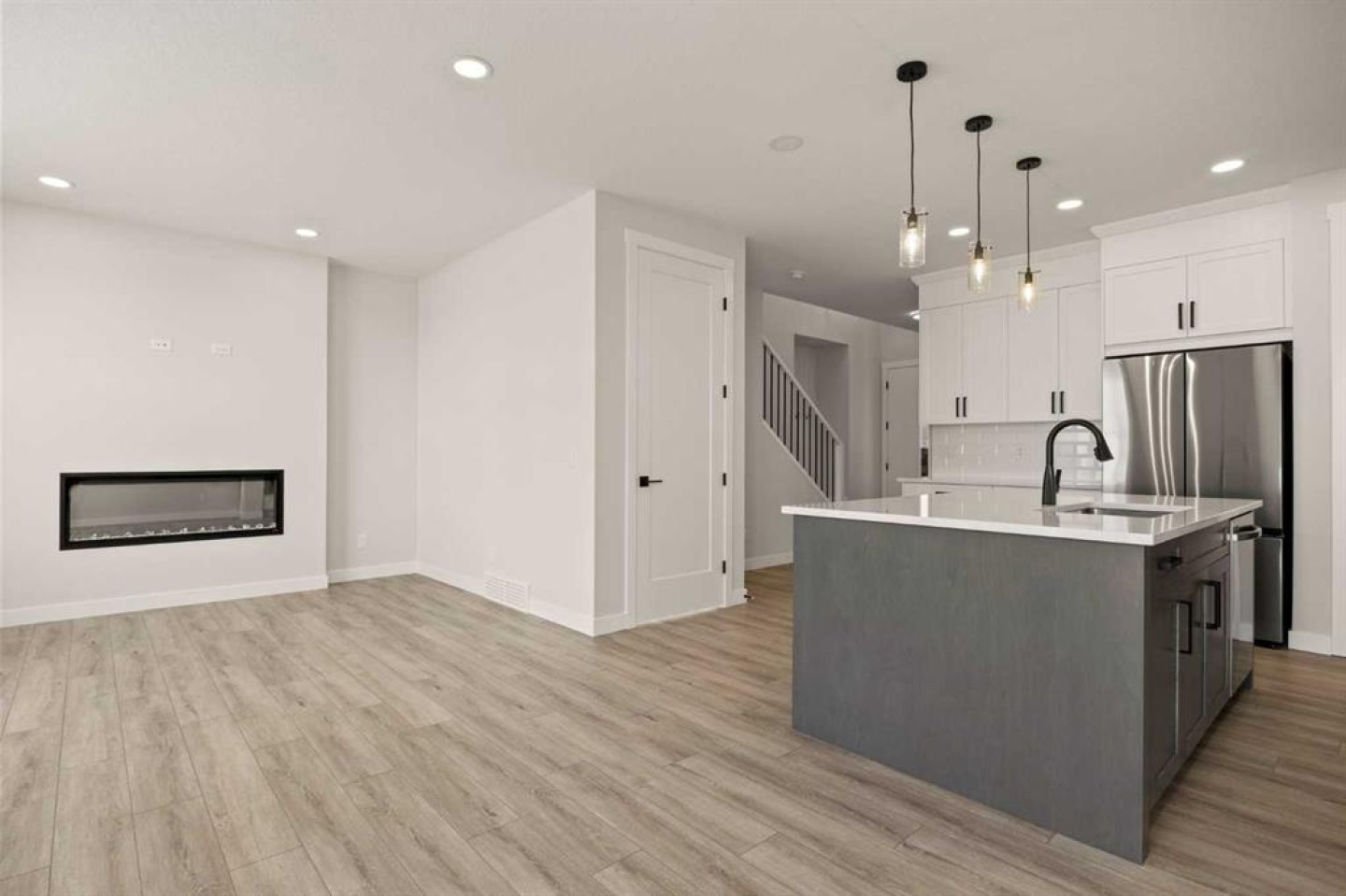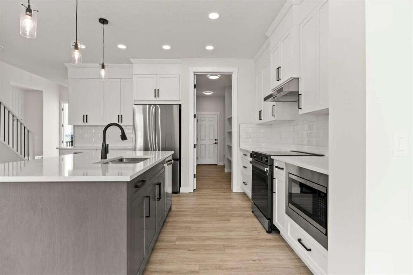 From the moment you step inside, you’re greeted by a luxury open-to-below entrance featuring a custom shiplap coat hook and built-in bench, making a stylish and practical first impression. The main floor features 9' ceilings with 8' doors throughout, a full bedroom with an adjoining full bathroom, and a walkthrough mudroom and pantry that connects seamlessly to the open living space. The heart of the home is the kitchen, with painted cabinets to the ceiling, quartz countertops, a large island with breakfast bar seating, and stainless steel appliances. Oversized triple-pane windows fill the dining and living rooms with natural light, while the open layout makes this the perfect home for family gatherings or entertaining.