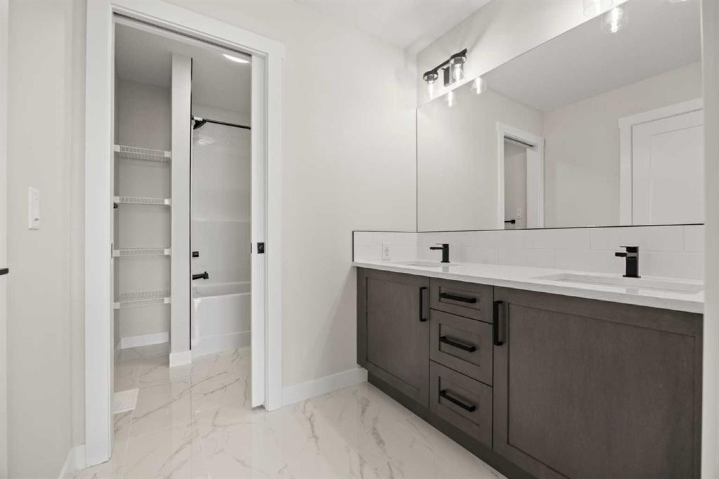 Upstairs, the primary bedroom is a true retreat, complete with a 5-piece ensuite featuring a freestanding tub, double vanity, a large fully tiled shower with glass doors, and a private enclosed toilet. The ensuite connects to a spacious walk-in closet with built-in shelving and organizers, which further connects directly to the laundry room for everyday convenience. Two additional bedrooms upstairs share a well-designed Jack & Jill bathroom with dual sinks, while a large bonus room provides extra living space for a home office, media area, or playroom.