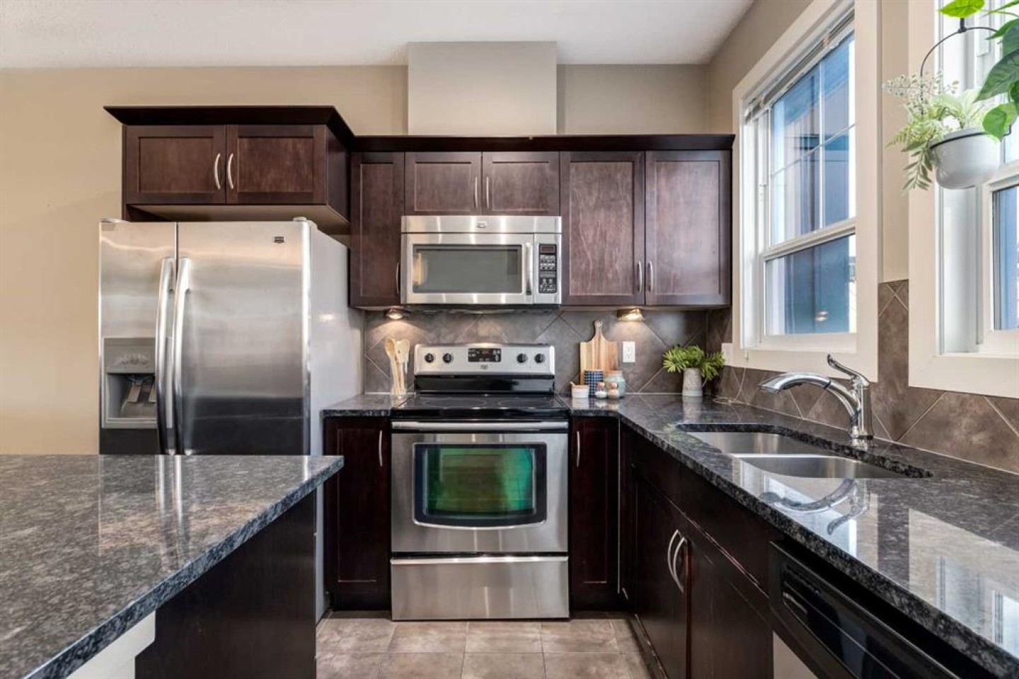 The main level features a stylish, open entertaining space with tall ceilings (14 ft), flooded with natural light from large windows as hardwood flooring finishes the space. Moving up a level, you're greeted with a spacious kitchen along with convenient main-floor laundry and a two-piece powder room. Step out onto the east-facing balcony and enjoy beautiful morning sunshine—perfect for coffee or quiet starts to your day.