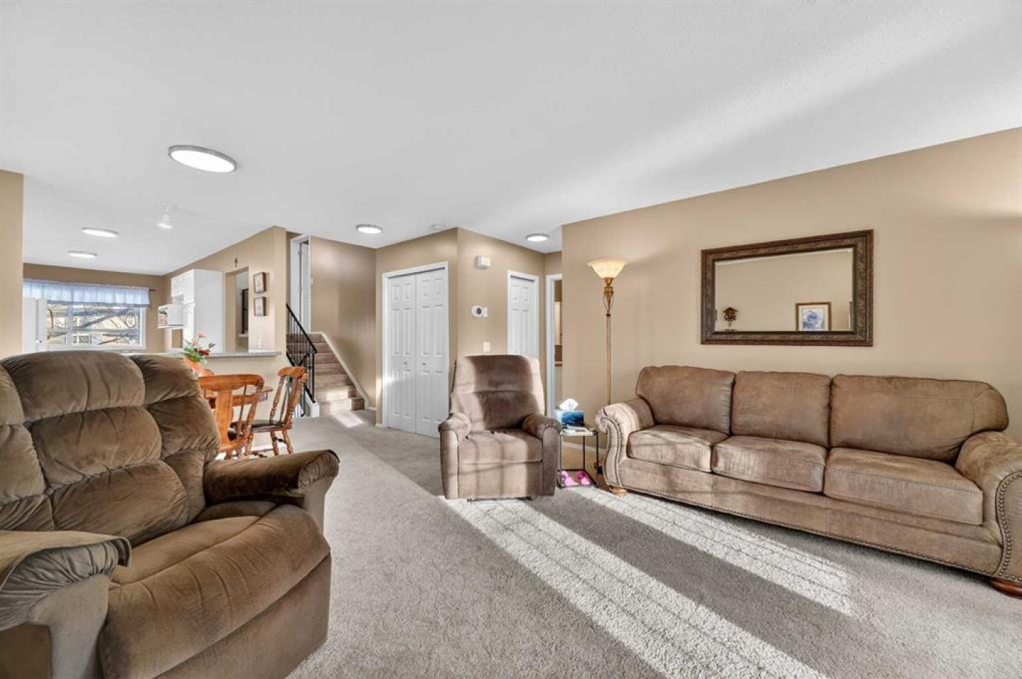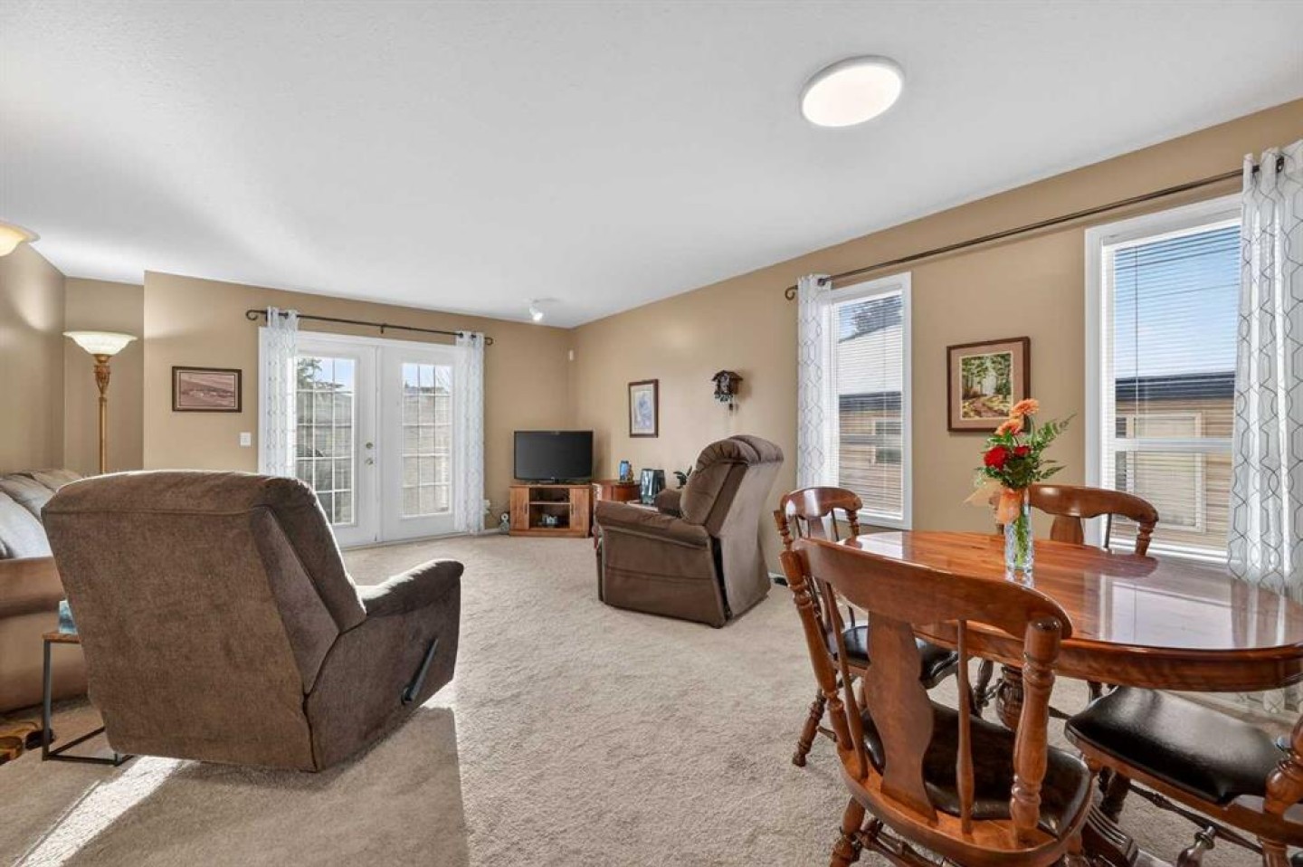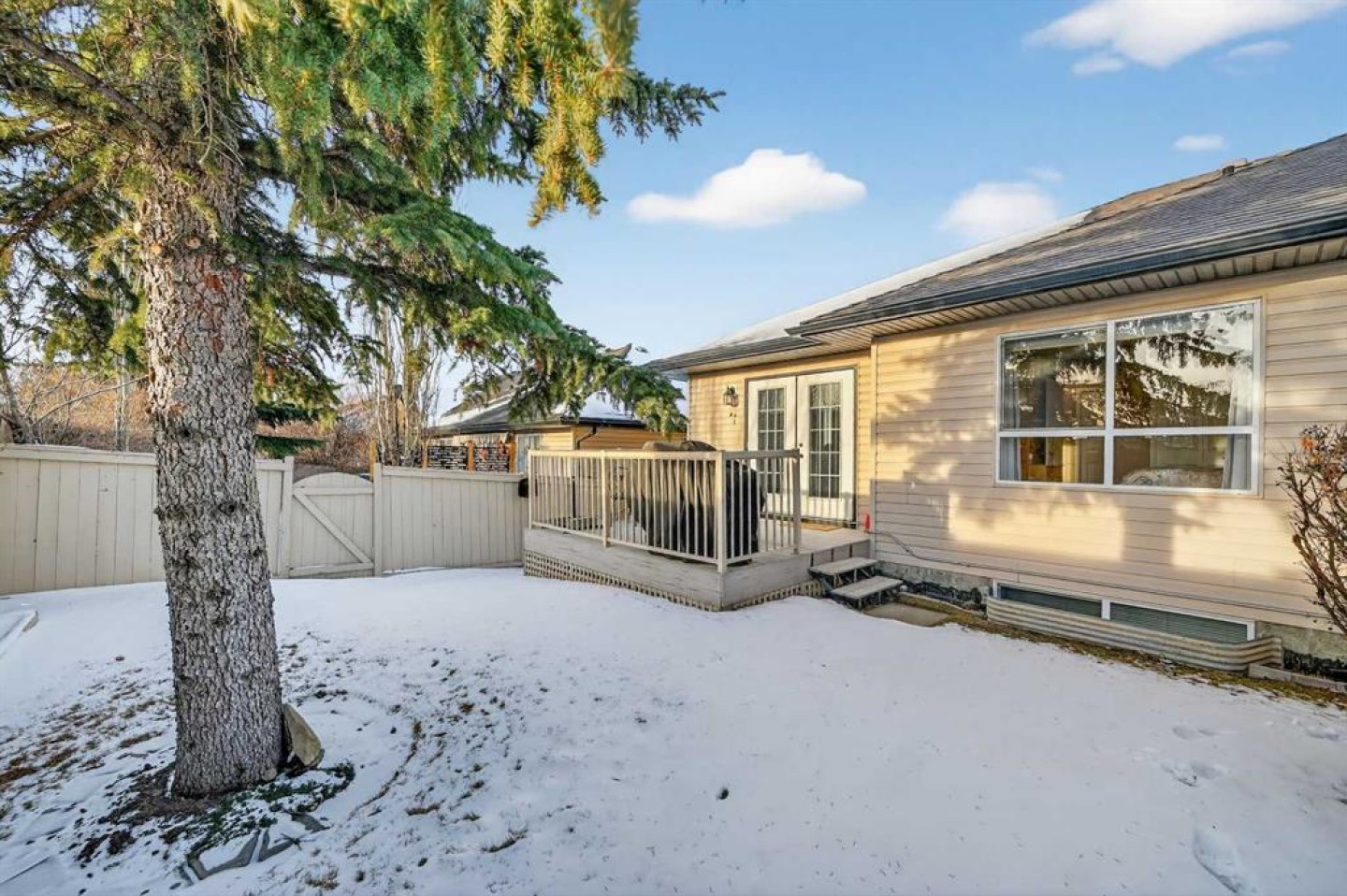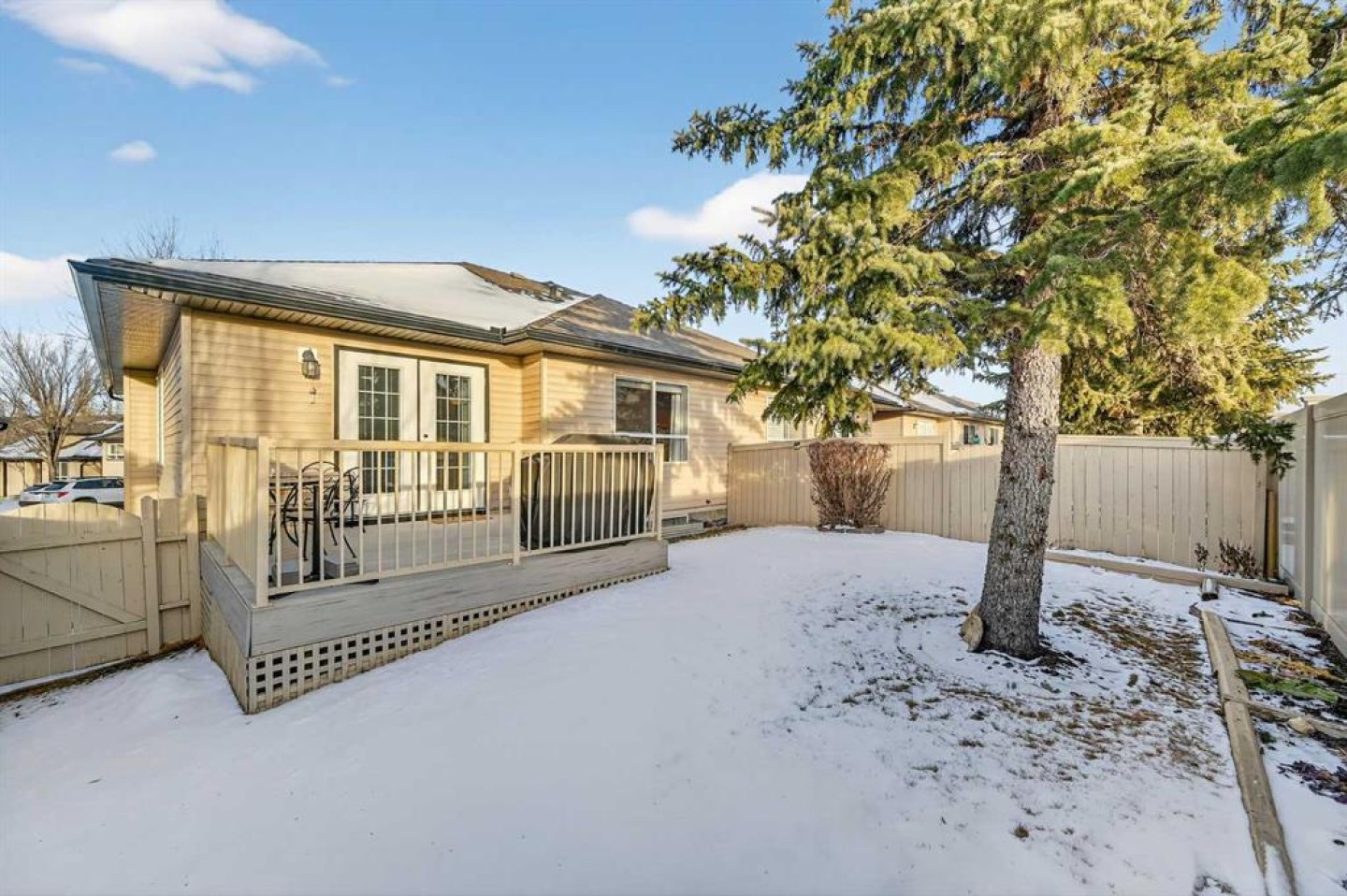 Welcome to West Pointe Villas, Airdrie’s sought-after adult living community, where pride of original ownership is evident throughout this beautifully maintained home. Thoughtfully designed with comfort and functionality in mind, the main level features an open-concept kitchen overlooking the living room, creating a bright and airy atmosphere. A generously sized dining area sits adjacent to a large window, offering an inviting space for everyday meals or entertaining. French doors from the living room lead to a sunny south-facing deck, overlooking a peaceful, fully fenced backyard—perfect for relaxing or enjoying outdoor time. A spacious bedroom on the main level can serve as a primary or guest room and is conveniently located next to a full four-piece bathroom. The upper level is dedicated entirely to a private primary retreat, featuring a large walk-in closet and a full four-piece ensuite, providing a quiet and comfortable escape. The lower level includes an additional bedroom, a welcoming family room, aundry area, and a large storage room, offering excellent versatility and extra living space. There is a rough in for a 3rd bathroom in the basement. Completing the home is a beautifully landscaped backyard and a single attached garage, making this property an exceptional opportunity for low-maintenance living in a well-established community.