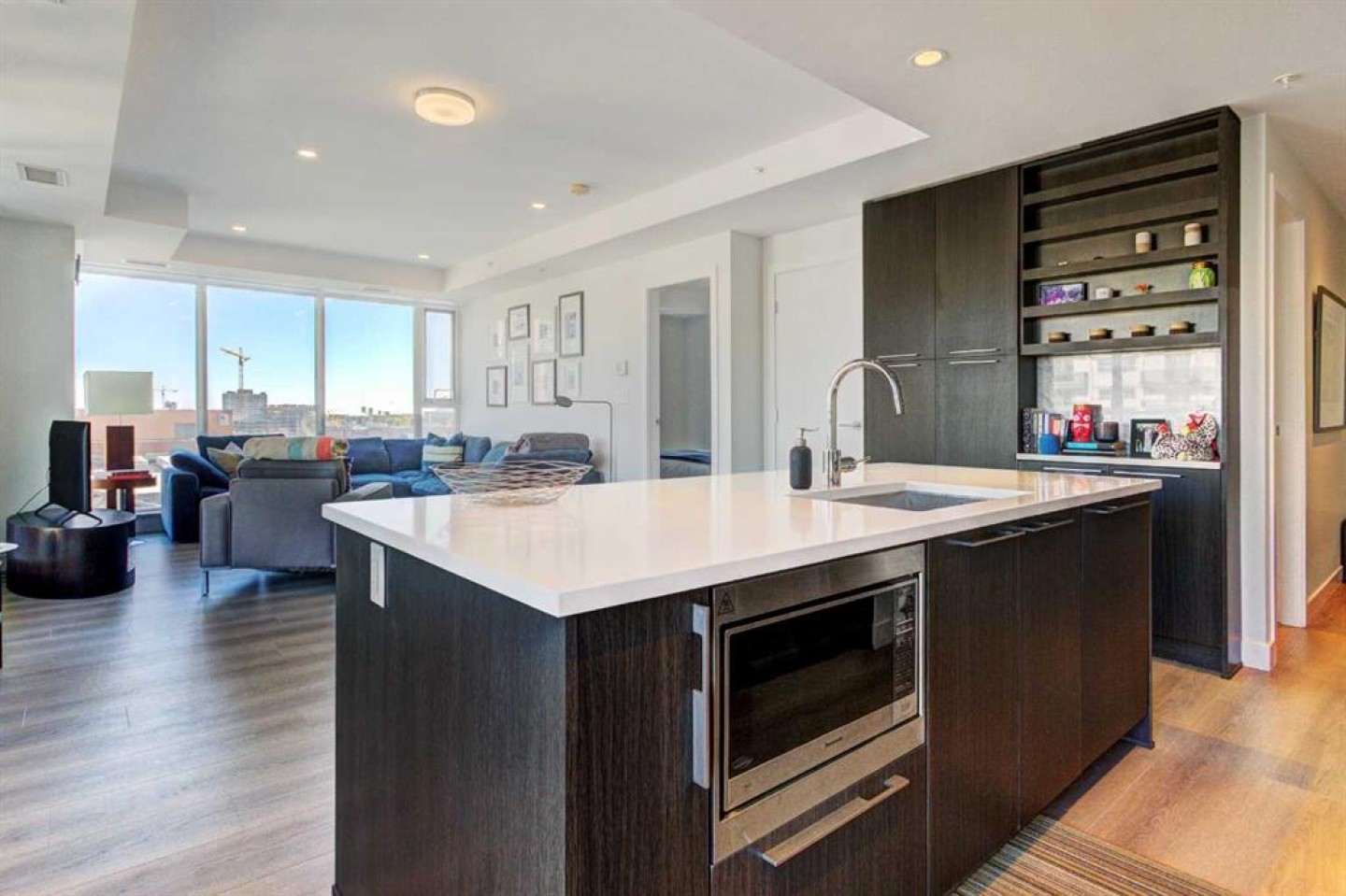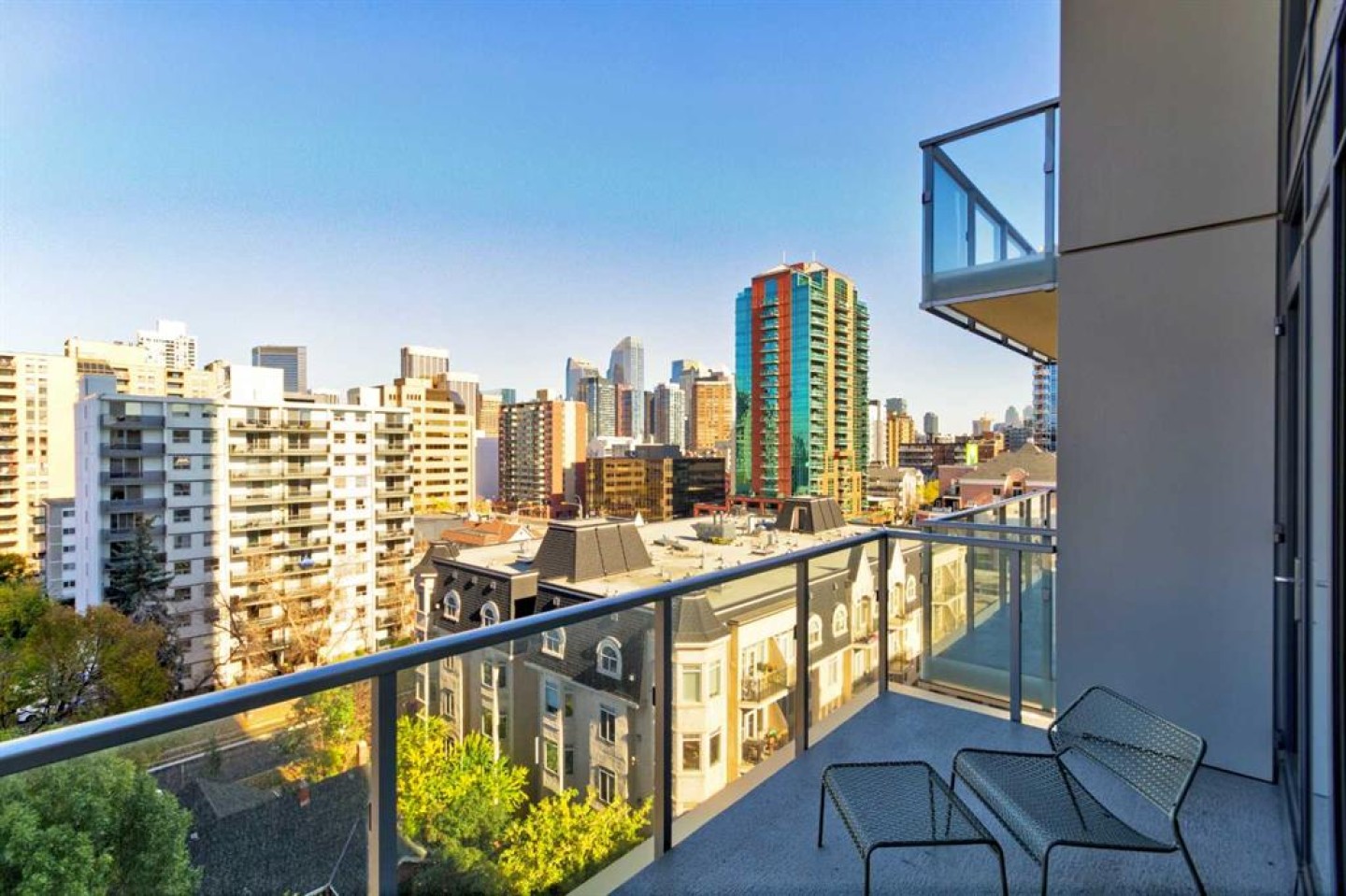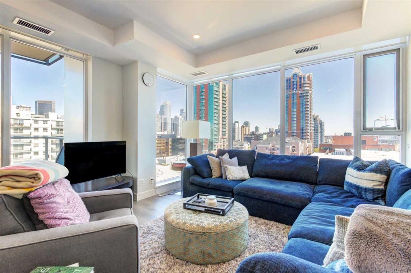 Welcome to unit 703 in The Royal! A lovely 2 bedroom 2 bathroom double balcony corner unit with stunning downtown views. The floor to ceiling windows flood the main living space with natural light and the north and east vistas are stunning. The bright kitchen is fully equipped with a large quartz island, high end appliances, plenty of cabinet and counter space with custom built in - all overlooking the main living and dining areas, perfect for entertaining. Large primary bedroom, with direct access to the second balcony, features a walk-in closet, an ensuite with a large glass door shower, double vanity and heated floors. The second bedroom is located on the opposite side of the unit, perfect for guests or home office. Other features include air conditioning, a gas line on the balcony for bbq, in-suite full size stacked laundry and additional 4 piece bathroom with soaker tub. Residents can enjoy the many amenities including a fitness center, steam room, sauna, squash court, 24-hour concierge/security, outdoor courtyard, and private dining area for larger get togethers. Located just off 17th avenue you will have quick access to great shopping, restaurants, groceries, coffee shops and pubs. Building is very pet friendly, with approval, and there are many parks and green spaces near by. This unit is complete with a secure heated underground parking space and a separate storage locker. An excellent well cared for urban home.