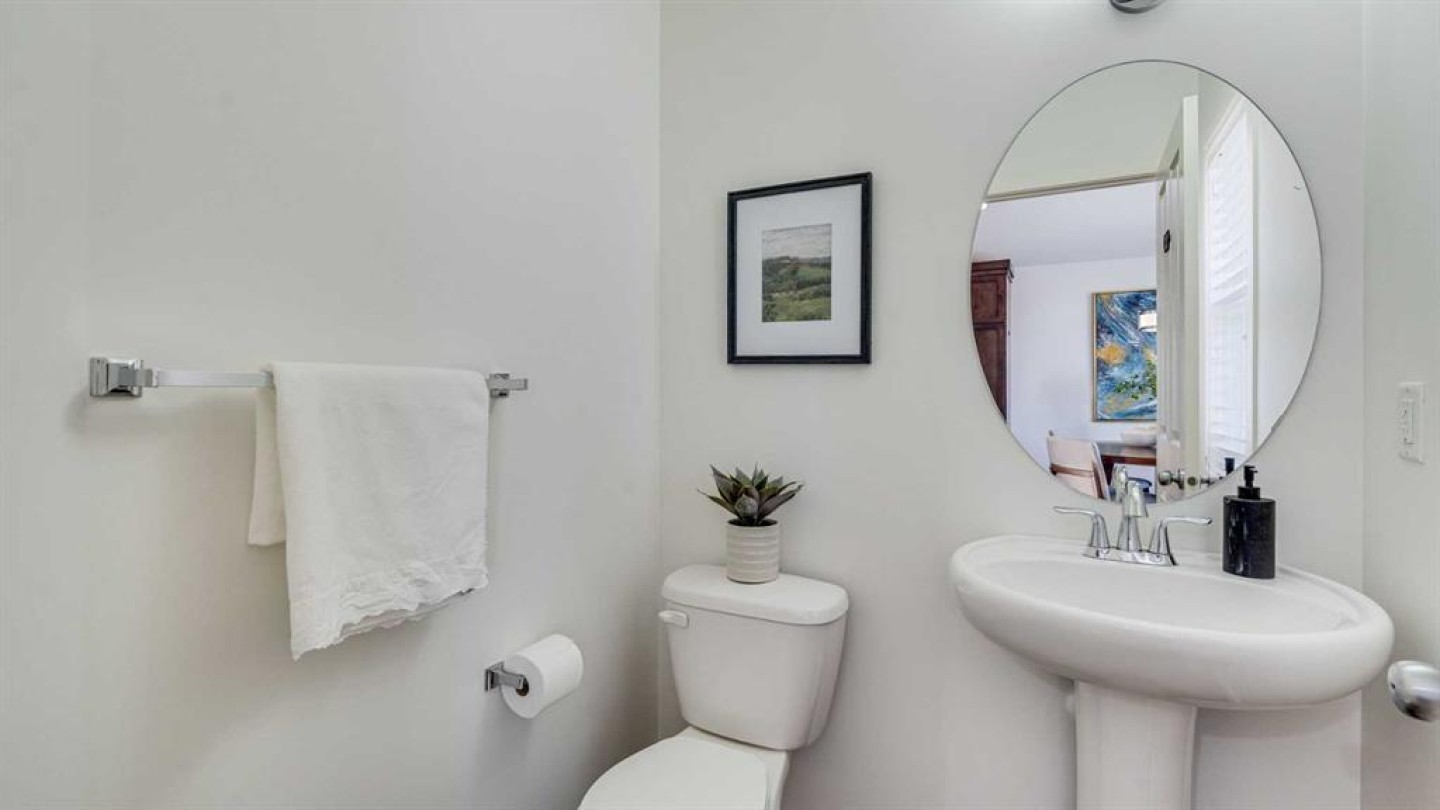 The centrally located kitchen is designed for entertaining, complete with granite countertops, a gas range, dark cabinetry with ample storage, and a functional island offering additional cabinetry. Just off the dining area, step onto the upper balcony extending your entertaining space outdoors. A convenient 2-piece bathroom completes the upper level, while the home is wired for sound throughout, enhancing both daily living and hosting.