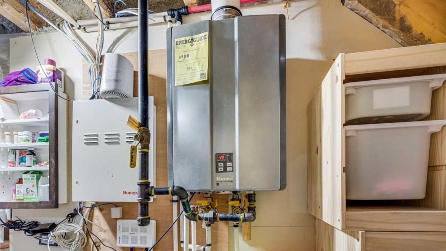 Additional comfort features include central air conditioning and on-demand hot water, enhancing efficiency and year-round comfort.