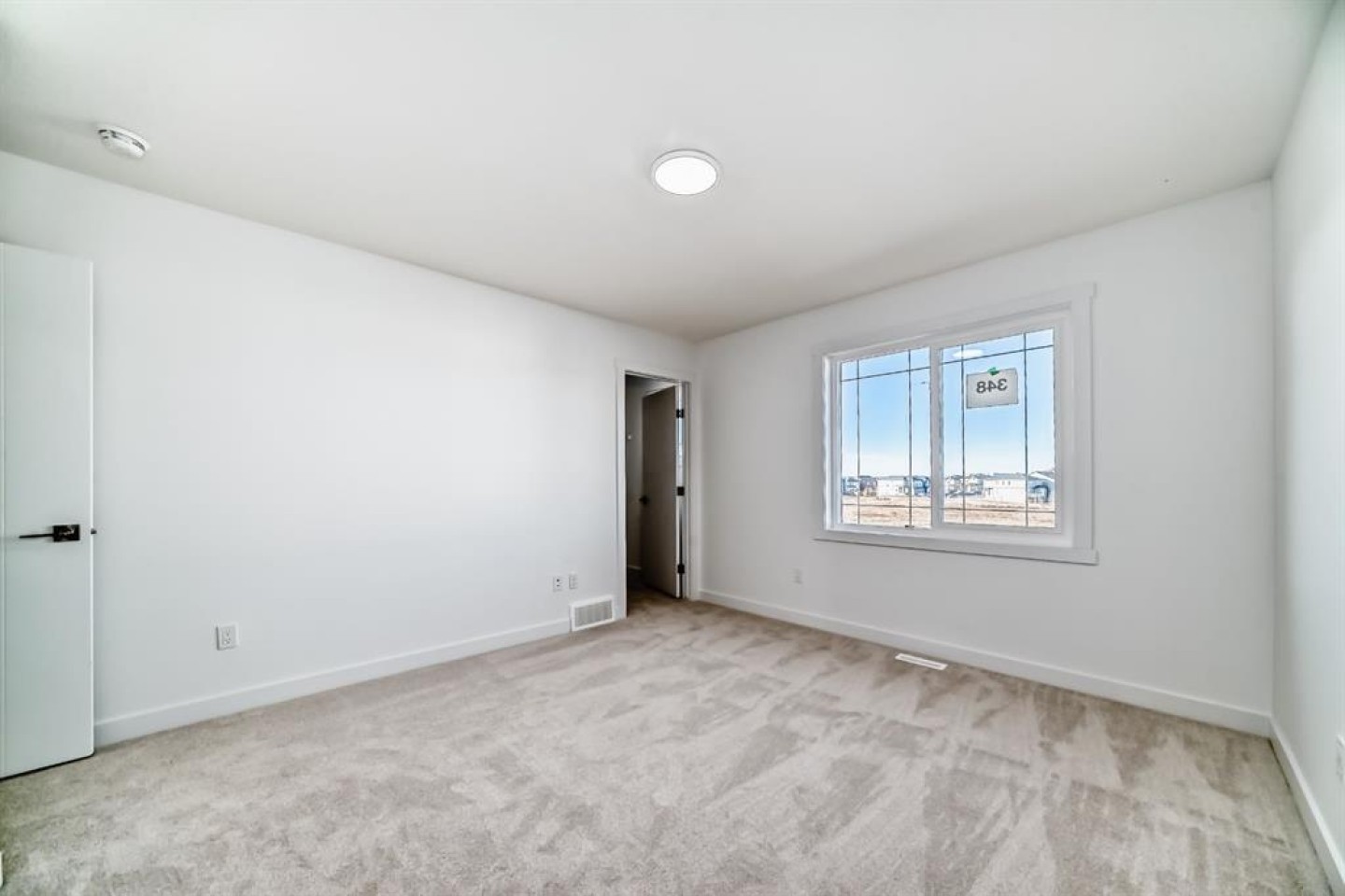 Step into this NEWLY built upgraded semi-detached home, where modern luxury and everyday functionality come together beautifully in the heart of Calgary’s vibrant new Northeast Community. Offering 4 BEDROOM and 3 FULL bathrooms, this home includes a MAIN floor bedroom with a full ensuite, ideal for elderly family members, guests, or multigenerational living. All bathrooms are finished with granite countertops and under mount sinks, reflecting quality craftsmanship throughout. This thoughtfully designed home features an open-concept main floor highlighted by a sleek contemporary kitchen with a gas line to the range, ceiling-height cabinetry offering abundant storage, and a convenient pantry. The cozy living room creating the perfect space for relaxing or entertaining. Upstairs, retreat to the spacious primary bedroom featuring a luxurious 5-piece ensuite, designed for comfort and relaxation. Two additional well-sized bedrooms and a dedicated computer/desk nook provide flexibility for family living or work-from-home needs. The full basement with 9-foot ceilings and a separate side entrance is ready for your creative vision—whether additional living space, a recreation area, or a future legal suite (subject to city approvals). Located in Calgary’s desirable new Northeast community, this home offers quick access to Stoney Trail, major roadways, schools, shopping, and all essential amenities. This vacant home is available for quick possession, allowing you to move in without delay. With meticulous attention to detail and modern finishes throughout, this property truly represents the pinnacle of contemporary living.