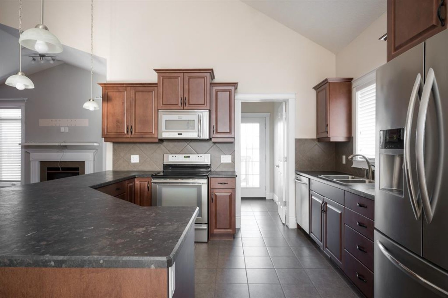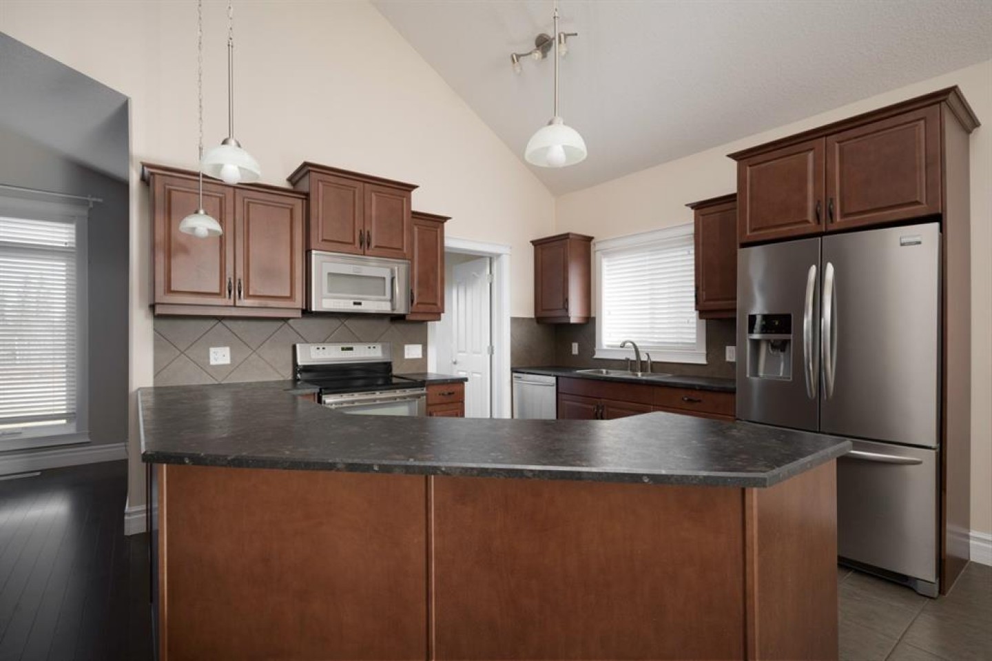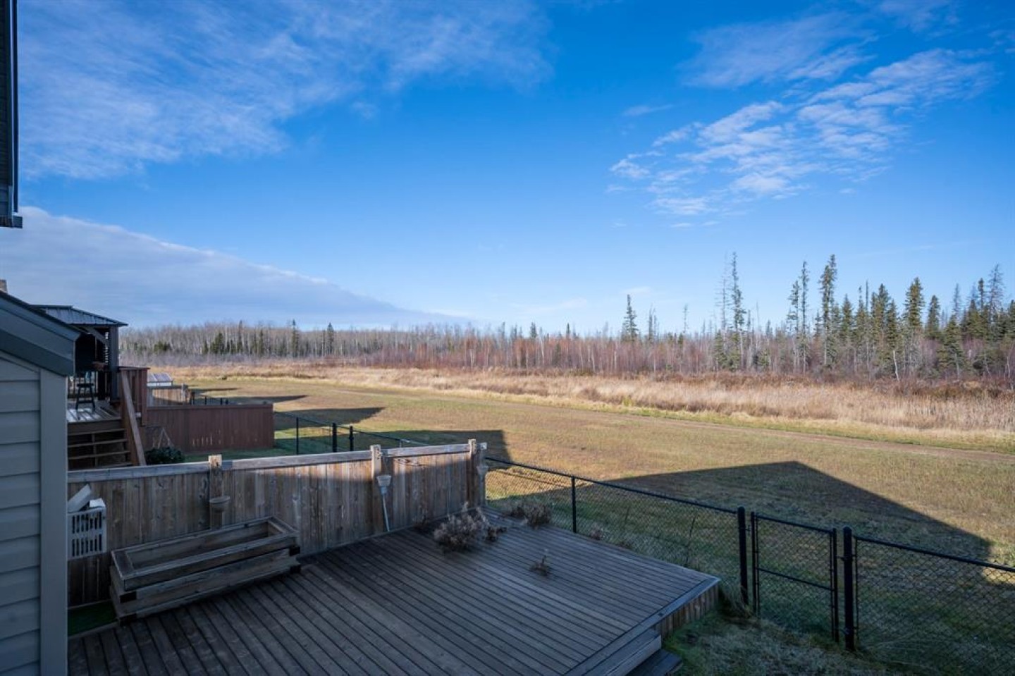 BACKING ONTO TREELINE! The first thing you will notice upon entering this home is how open and spacious this floor plan is. Offering a large entry way and huge dining nook open to the kitchen. The kitchen is rich with dark cabinetry, stainless steel appliances, lots of countertop space and has access to the backyard. Off the kitchen is the living room with vaulted ceilings, gleaming hardwood floors and a cozy gas fireplace. Also on the main level is the main bathroom and 2 bedrooms. The large master suite is tucked away above the garage and offers an abundance of natural light, a walk in closet and a 4PC ensuite with corner jet tub and separate shower. The basement is fully developed into a 2 bedroom LEGAL BASEMENT SUITE with full kitchen, laundry, separate entry and plenty of natural light. The attached garage is heated and ready for a hockey fan with the floor painted as a hockey rink. Enjoy Northern Alberta’s sunset from your West facing backyard which backs onto the forest and walking trail. Basement furnishings are negotiable.