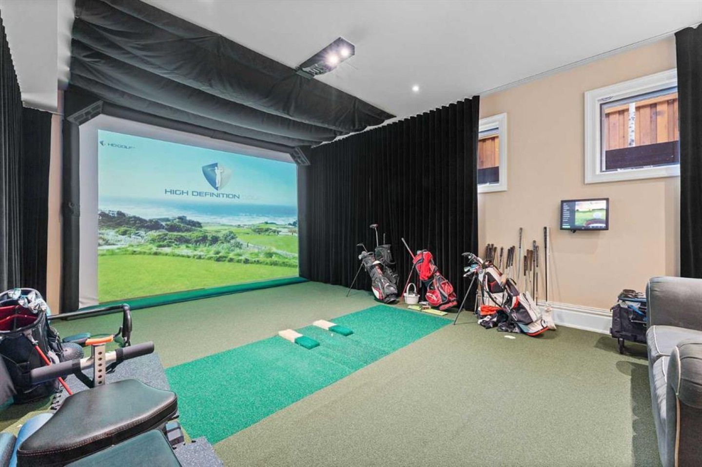 Descend the walnut staircase to the lower level, a space crafted for leisure and entertainment. Enjoy a dedicated golf simulator room, a music room, a temperature-controlled wine cellar, and a full theatre experience with projector and oversized screen. An elevator provides effortless access back to the main level and the heated double garage, finished with hand-laid tile and equipped with two car lifts—accommodating up to four vehicles. An oversized driveway offers four additional parking spaces for guests.