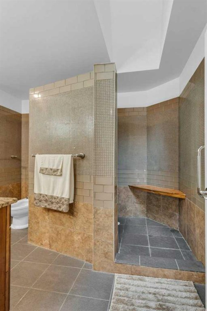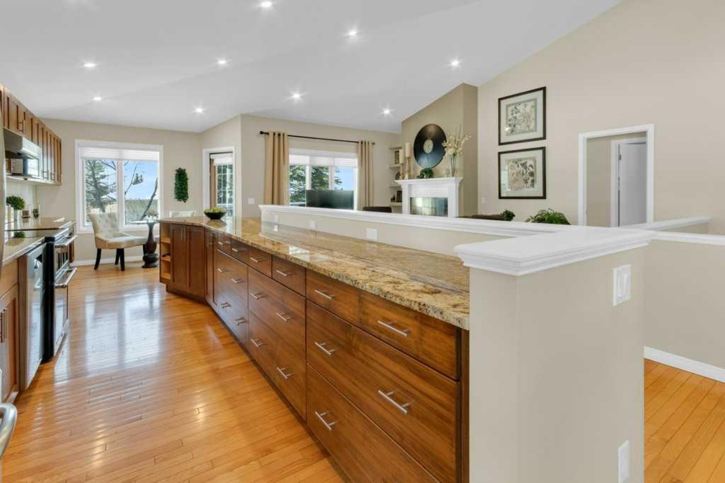 The open-concept main floor is highlighted by rich hardwood flooring and soaring vaulted ceilings, creating an inviting space ideal for both everyday living and entertaining. The chef’s kitchen is the heart of the home, featuring a striking 16-foot granite island and abundant cabinetry, seamlessly flowing to the deck with a gas line for barbecuing. A formal dining room and separate nook provide flexible gathering spaces, while the living room showcases a stunning double-sided fireplace shared with the spacious main-floor primary suite. The primary retreat includes a walk-in closet and a luxurious five-piece ensuite. A den/home office, powder room, main-floor laundry, and quality Hunter Douglas blinds to complete the level.