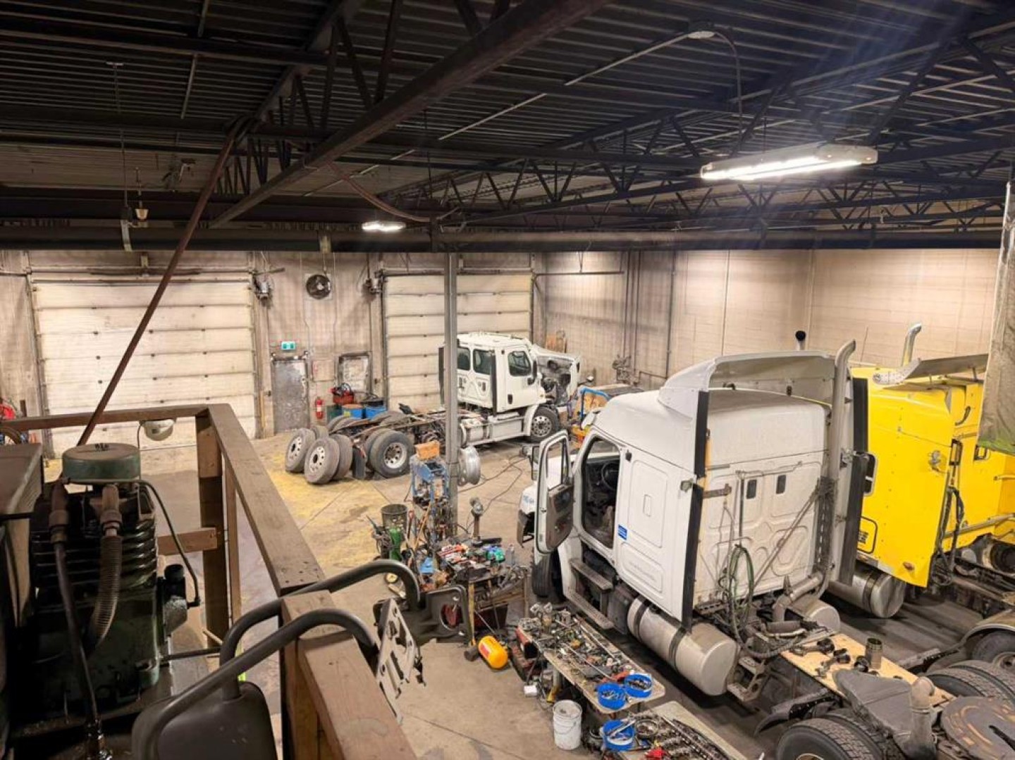The shop is fully equipped and certified, offering high-voltage electrical capacity suitable for advanced diagnostics, engine overhauls, and major mechanical work. Included in the sale is a comprehensive equipment package, featuring diagnostic equipment, tools, pressure washer, air compressor, oil collection systems, pumps, forklift, and all essential heavy-duty truck repair equipment required for day-to-day operations.