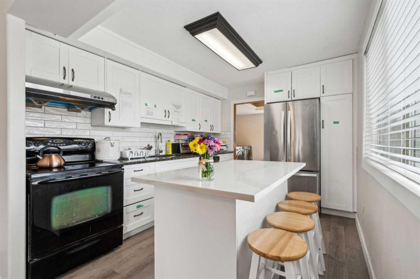 1 washer + dryer, 2 electric stoves, 2 hood fans, 3 fridges, microwave, window coverings, garage door opener and garage door opener remote