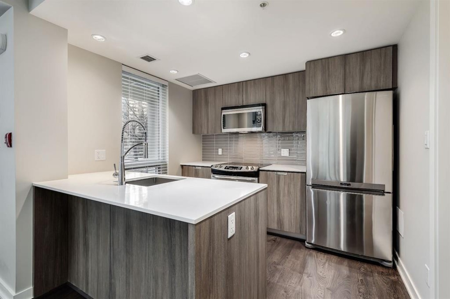 The gourmet kitchen is equipped with a quartz island and ample storage, making it ideal for both meal preparation and entertaining. Everyday living is made easier with in-suite laundry featuring new machines and central air conditioning for year-round comfort.