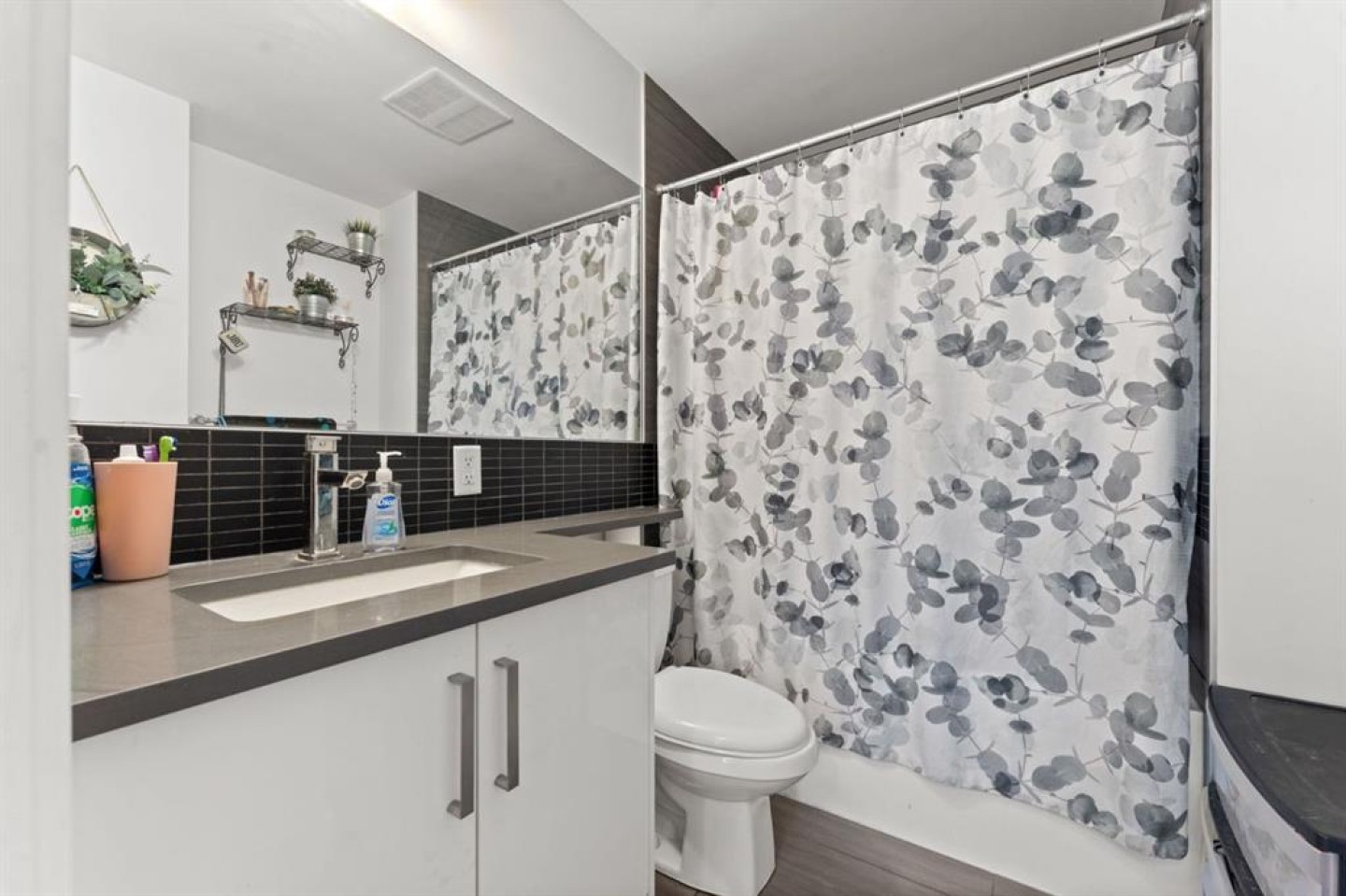 This meticulously designed 2-bedroom, 2-bathroom condo features upscale finishes and modern conveniences. The gourmet kitchen boasts high-gloss, high-profile cabinets, quartz countertops with a stylish tile backsplash, and European integrated appliances, including a gas cooktop and built-in oven. Wide plank laminate flooring, 9’ ceilings, and modern lighting create a contemporary and spacious feel throughout.