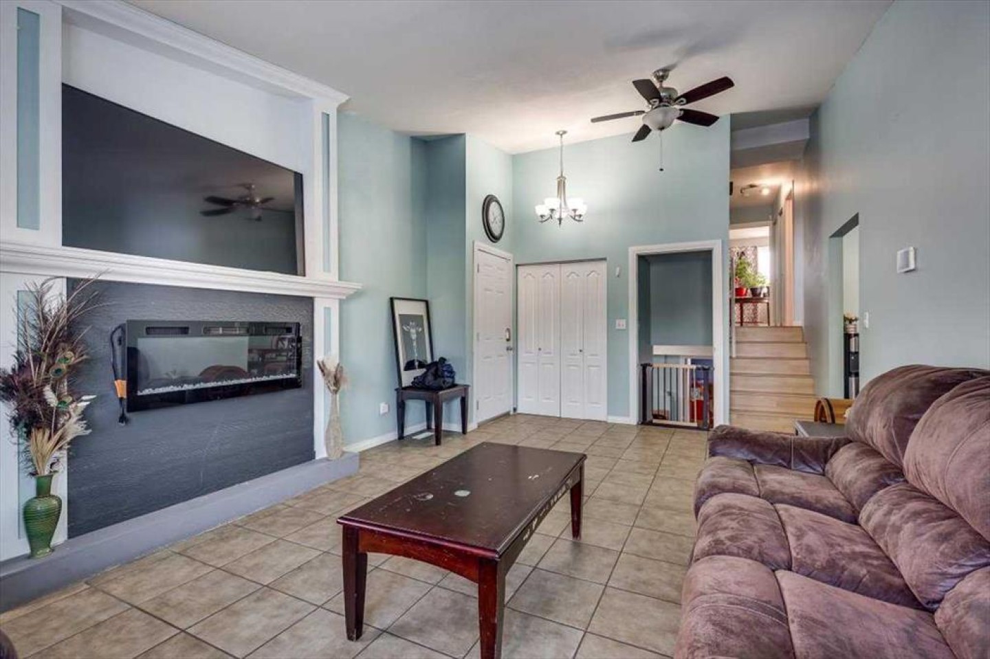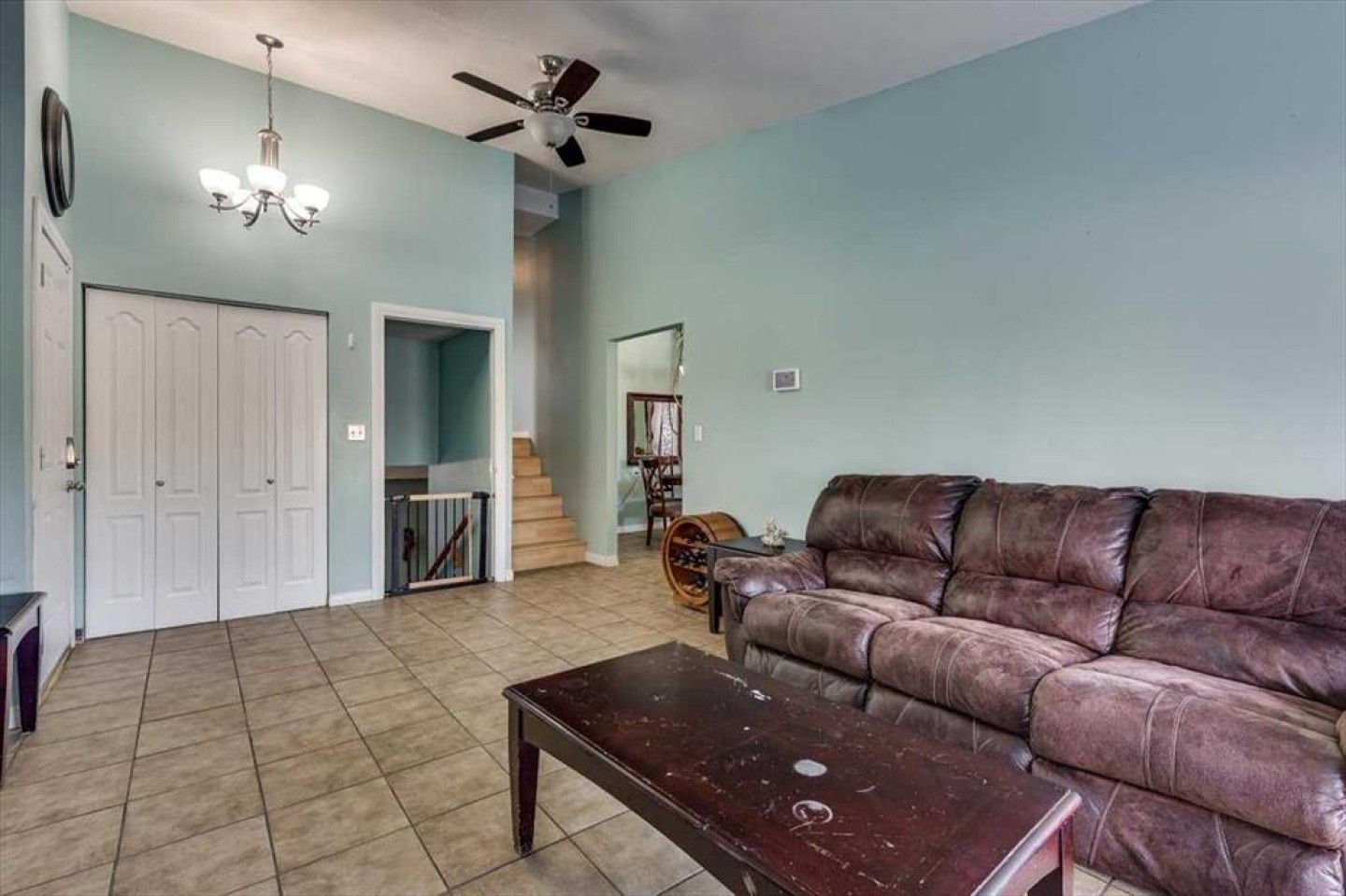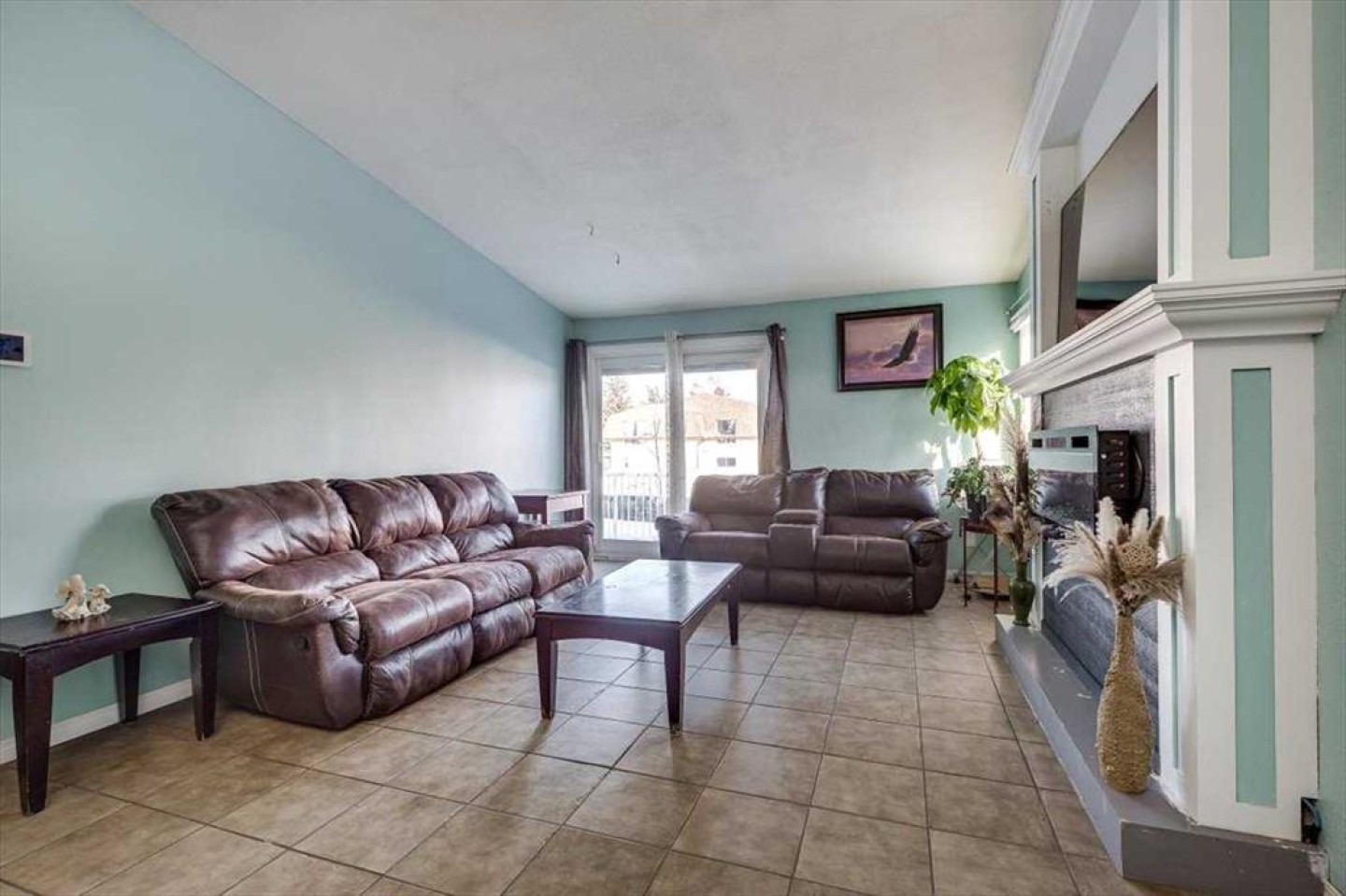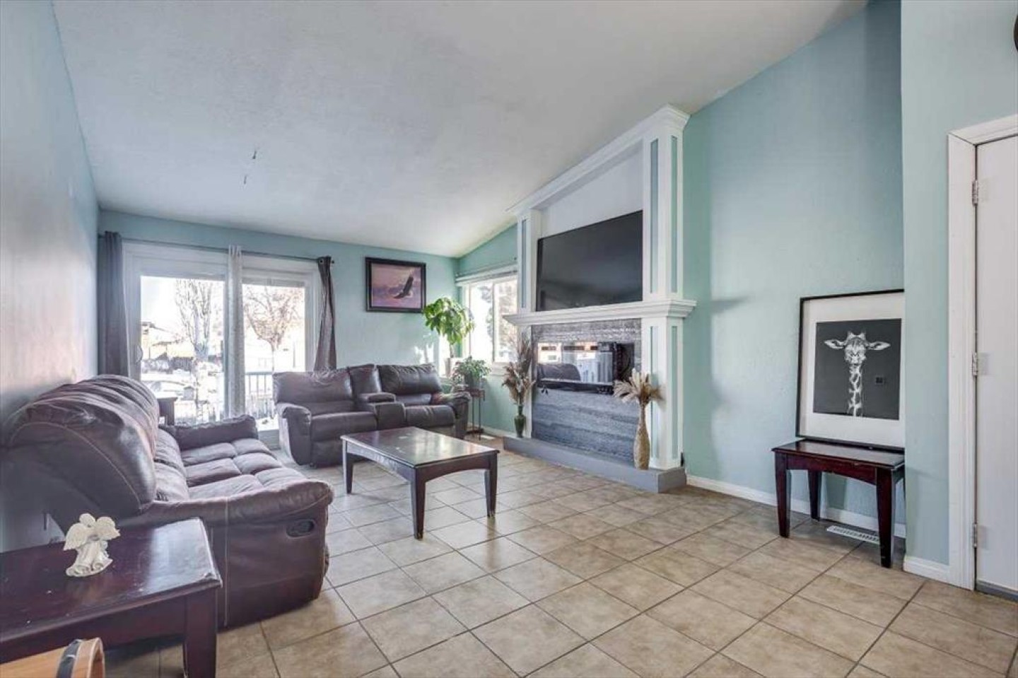 The main floor features a bright and spacious living room with vaulted ceilings and a cozy fireplace focal point, creating a warm and inviting atmosphere. The adjoining dining area flows seamlessly into the kitchen, which showcases crisp white cabinetry, ample counter space, and excellent natural light — perfect for everyday living and entertaining.