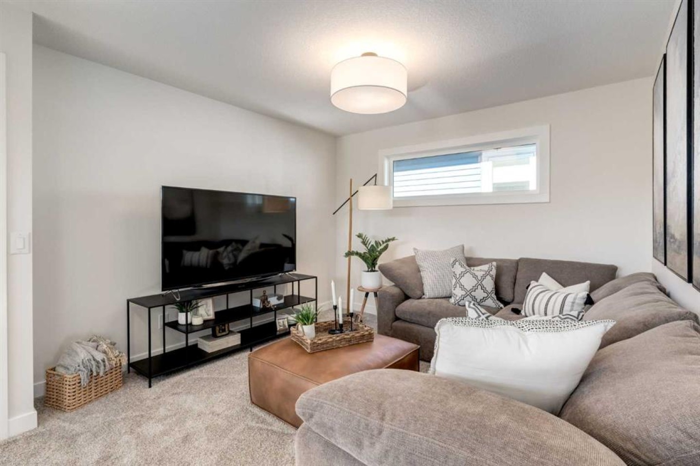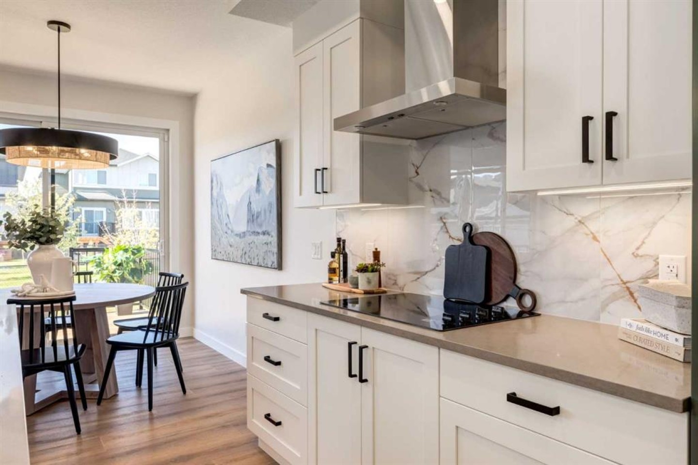 This beautifully designed former showhome offers a bright, open-concept layout that seamlessly connects the kitchen, dining, and living areas, creating an inviting space for both everyday living and entertaining. The kitchen is thoughtfully appointed with a large central island, quartz countertops, stainless steel appliances, and a striking blend of white and rich green cabinetry. A butler’s pantry and walkthrough mudroom connect the garage to the kitchen, adding exceptional functionality and storage. Pendant lighting, upgraded fixtures, and a full-height backsplash complete the space with a clean, modern finish. The living room is anchored by a gas fireplace with tile extending from floor to ceiling, creating a warm and contemporary focal point. Large windows allow natural light to fill the space, while wide-plank flooring and neutral tones enhance the home’s cohesive design. Just off the main living area, the dining space offers direct access to a full-width rear deck with a BBQ gas line, making indoor-outdoor living effortless. The home backs west onto green space, providing privacy and beautiful afternoon light. Upstairs, the primary bedroom is a serene retreat designed for comfort and relaxation. It features generous proportions, plush carpeting, and large windows that frame views of the surrounding community. The upgraded five-piece ensuite includes a freestanding soaker tub, a walk-in glass shower, dual vanities with ample storage, and modern fixtures, creating a spa-inspired atmosphere. Additional upper-level highlights include a bonus room, two secondary bedrooms, and a conveniently located laundry area. The professionally developed basement adds valuable living space and includes a recreation area, an additional bedroom, and a full bathroom, making it ideal for guests, extended family, or a home office setup. Landscaping, custom window coverings, and an upgraded lighting package are already in place, allowing the next owner to enjoy the home without additional work. Immediate possession is available, offering a rare opportunity to move into a finished, thoughtfully designed property. Located in the sought-after community of Greystone in Cochrane, this home is surrounded by scenic pathways, green spaces, and easy access to the Bow River. Residents enjoy a strong sense of community, nearby schools, parks, and convenient access to local amenities, while still being just a short drive to Calgary. Greystone offers a perfect balance of small-town charm and modern living, making it an ideal place to call home. Book your private showing today! *Measurements were pulled from builder drawings*