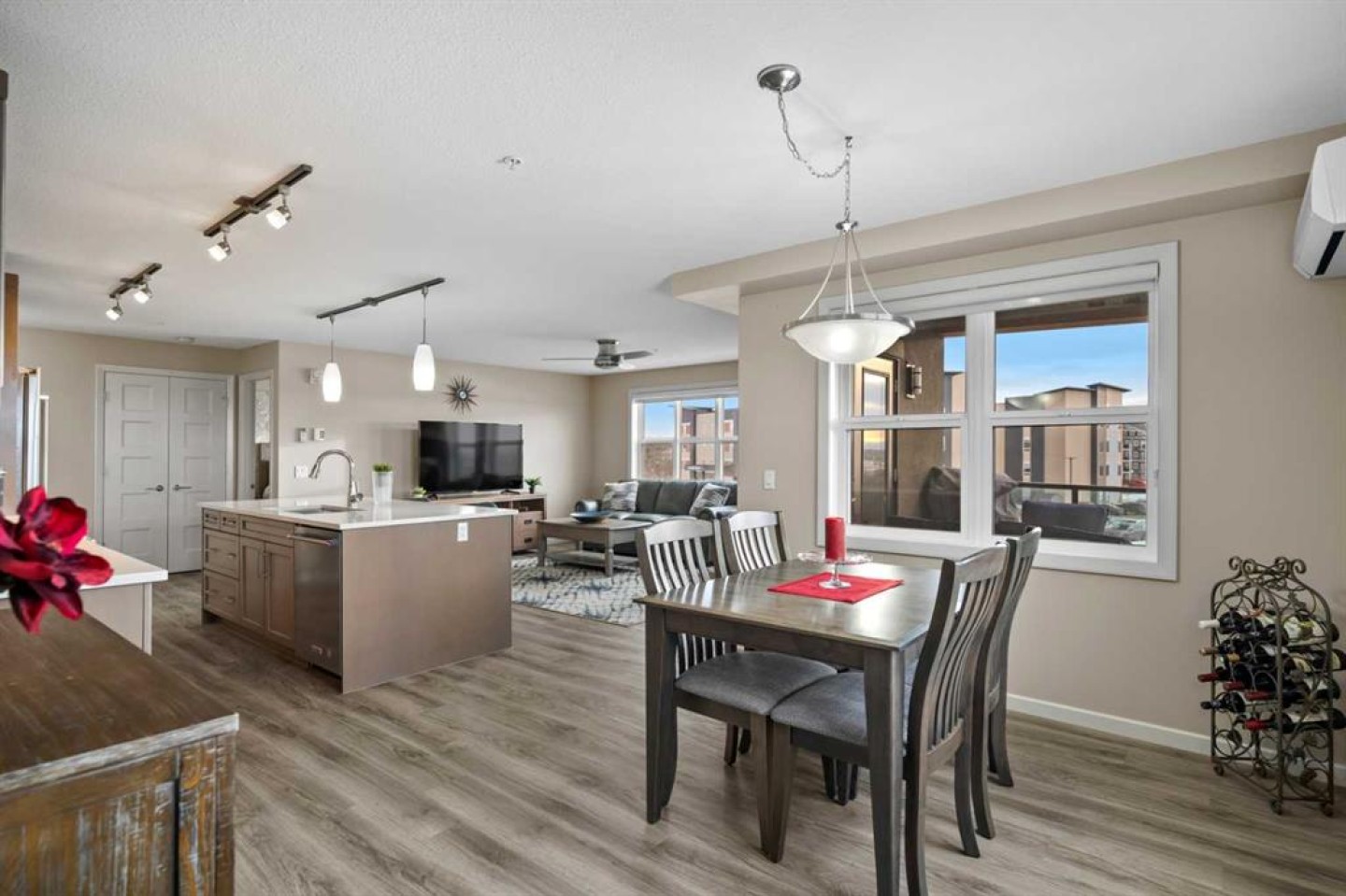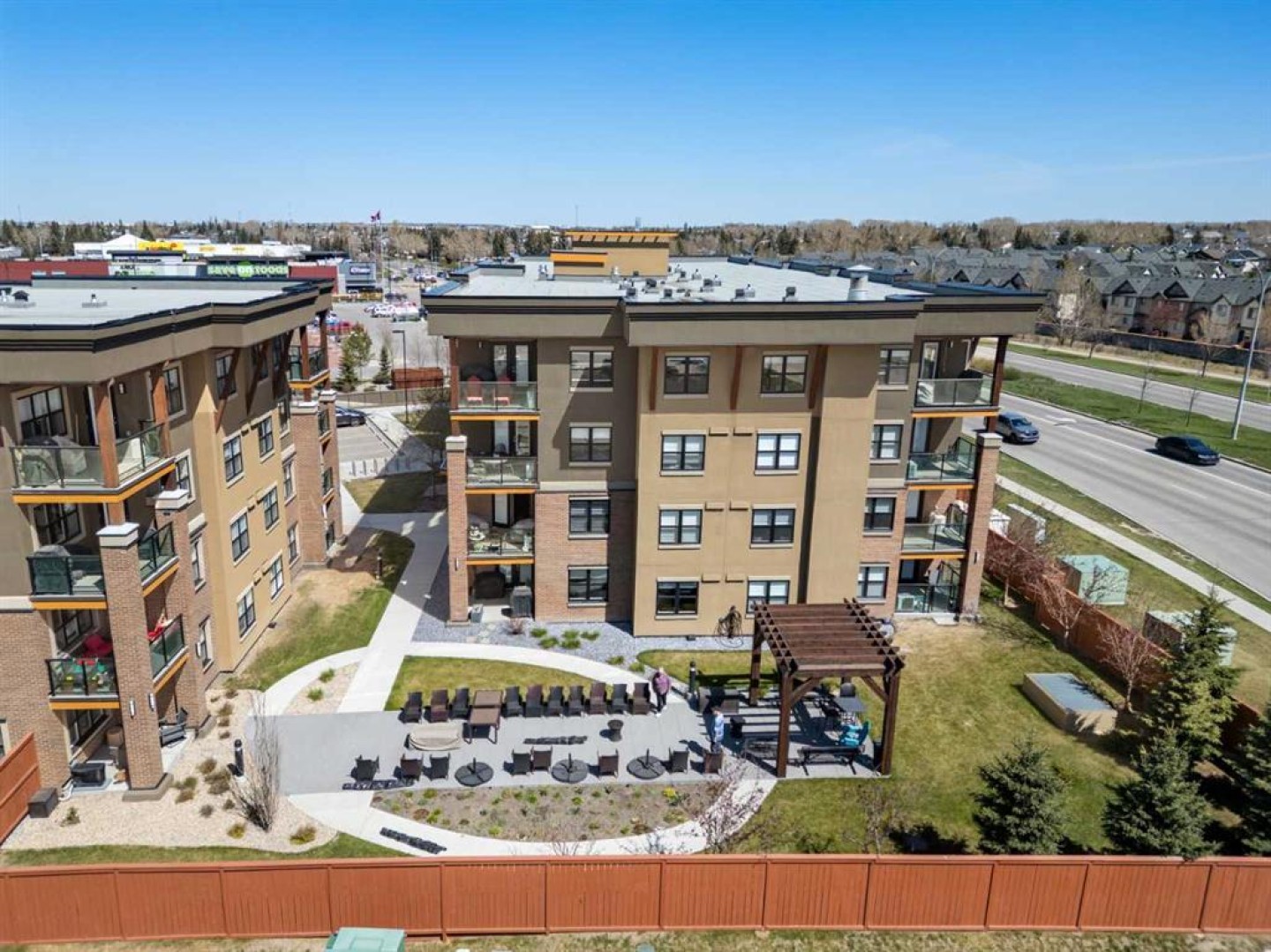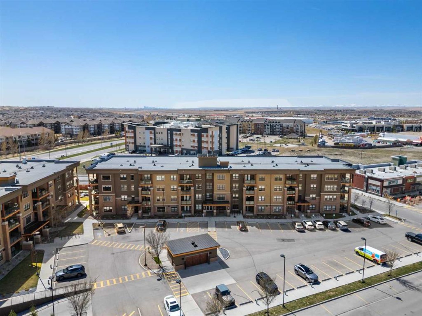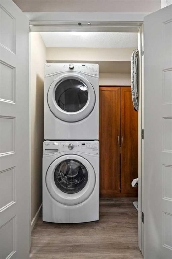 Welcome to #2310-10 Market Blvd! Airdrie's premier age restricted apartment complex, NEWLY age restricted to 55+. If you are looking to downsize in Airdrie, you will be hard pressed to find a building that compares to this one. This unit is a THIRD FLOOR, CORNER UNIT with SOUTHWEST exposure ensuring endless afternoon sun and INCREDIBLE NATURAL LIGHT throughout your home. Upon entering the unit, you are welcomed by a spacious foyer completed with a coat closet and an open, airy feel that immediately sets the tone for the home. Moving into the kitchen, it offers expansive, high-end cabinetry, granite countertops, a large island, beautiful light fixtures and stainless steel appliances. Designed for hosting, it opens seamlessly into the expansive living space with access to a spacious balcony, perfect for cozy evenings or morning coffee while enjoying the MOUNTAIN VIEWS. Just off your living space, you will appreciate a large, formal dining room that comfortably fits a six person table and is SURROUNDED by windows, a rare find in condo living. It is not every day that a unit like this hits the market, what is unique about it is that it offers TWO BEDS, 2 BATHROOMS + A LARGE DEN. The den is a versatile space ideal for a home office, exercise room, or additional storage. The PRIMARY bedroom is a true retreat, featuring a walk-through closet with built-in storage leading to a three-piece ensuite. This spa-like space includes a beautiful walk-in glass shower and a second vanity, ideal for getting ready in the morning. The second bedroom is equally spacious, offering two closets and direct access to the four-piece bathroom. You will also enjoy in suite laundry, beautiful vinyl flooring, remote controlled window coverings on the balcony doors, a garburator and many more upgrades. This unit offers TWO TITLED PARKING STALLS, one underground STEPS FROM THE ELEVATOR, the second one outdoors and a large assigned STORAGE LOCKER located down the hall on the same floor as your unit for convenient access. Stay comfortable in the summer months with your A/C wall unit and ceiling fan(s). The Chateaux features a beautifully landscaped courtyard with a gas fireplace and an amenity room available for private bookings where residents gather to host regular happy hours, social hours or just getting together to visit. There's also a secure underground workshop for those who enjoy woodworking. Located in Kings Heights, you’re within walking distance to Save-On-Foods, Shoppers Drug Mart, banks, salons, restaurants and more - covering all your grocery, shopping, and healthcare needs. This building is truly designed for mature ownership, peaceful living and a vibrant social community. Call for a private viewing today!