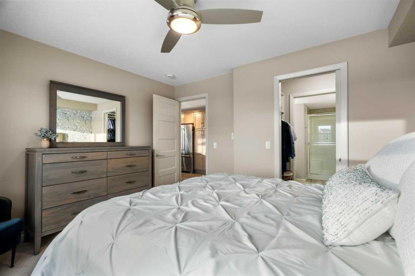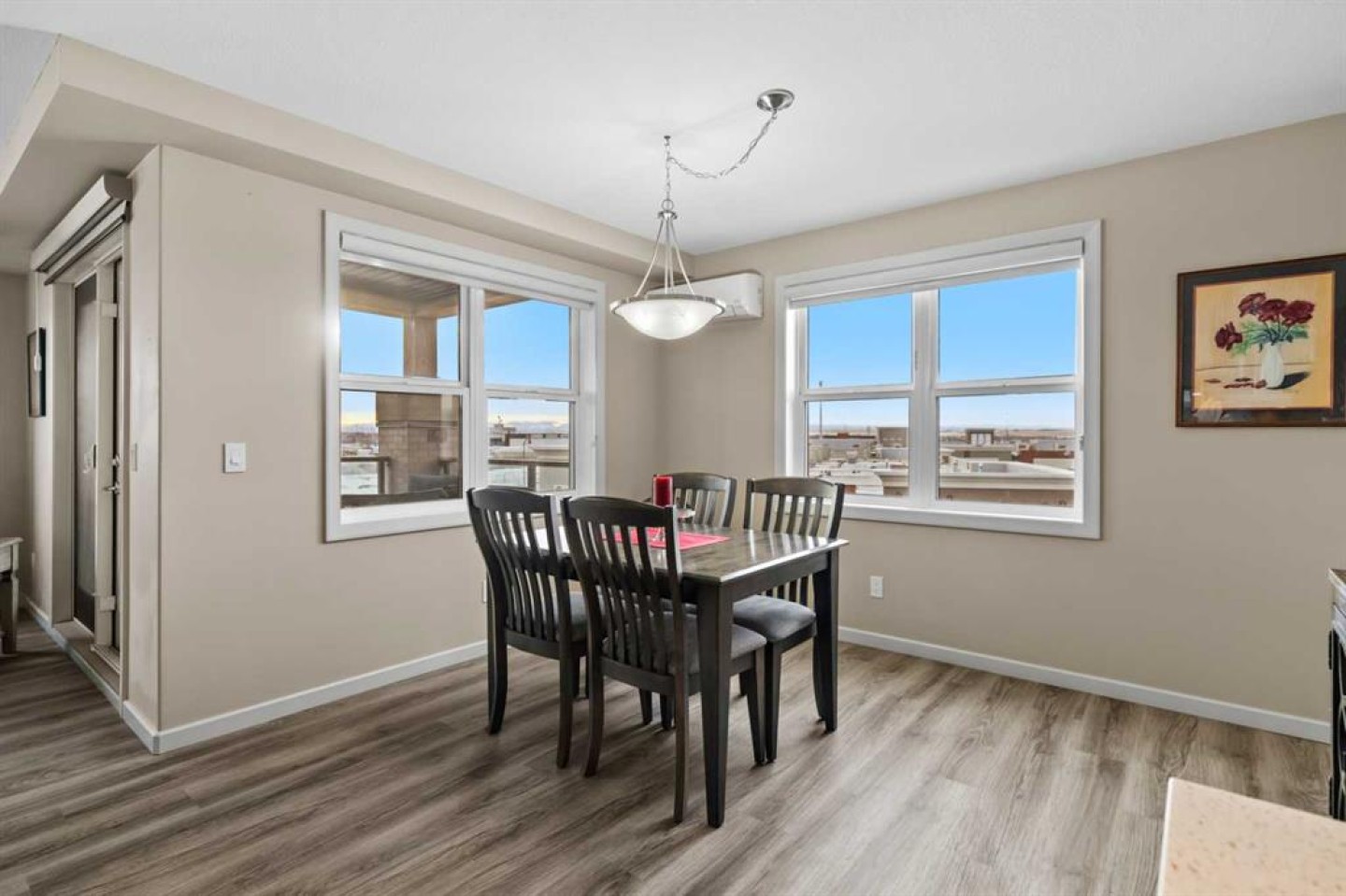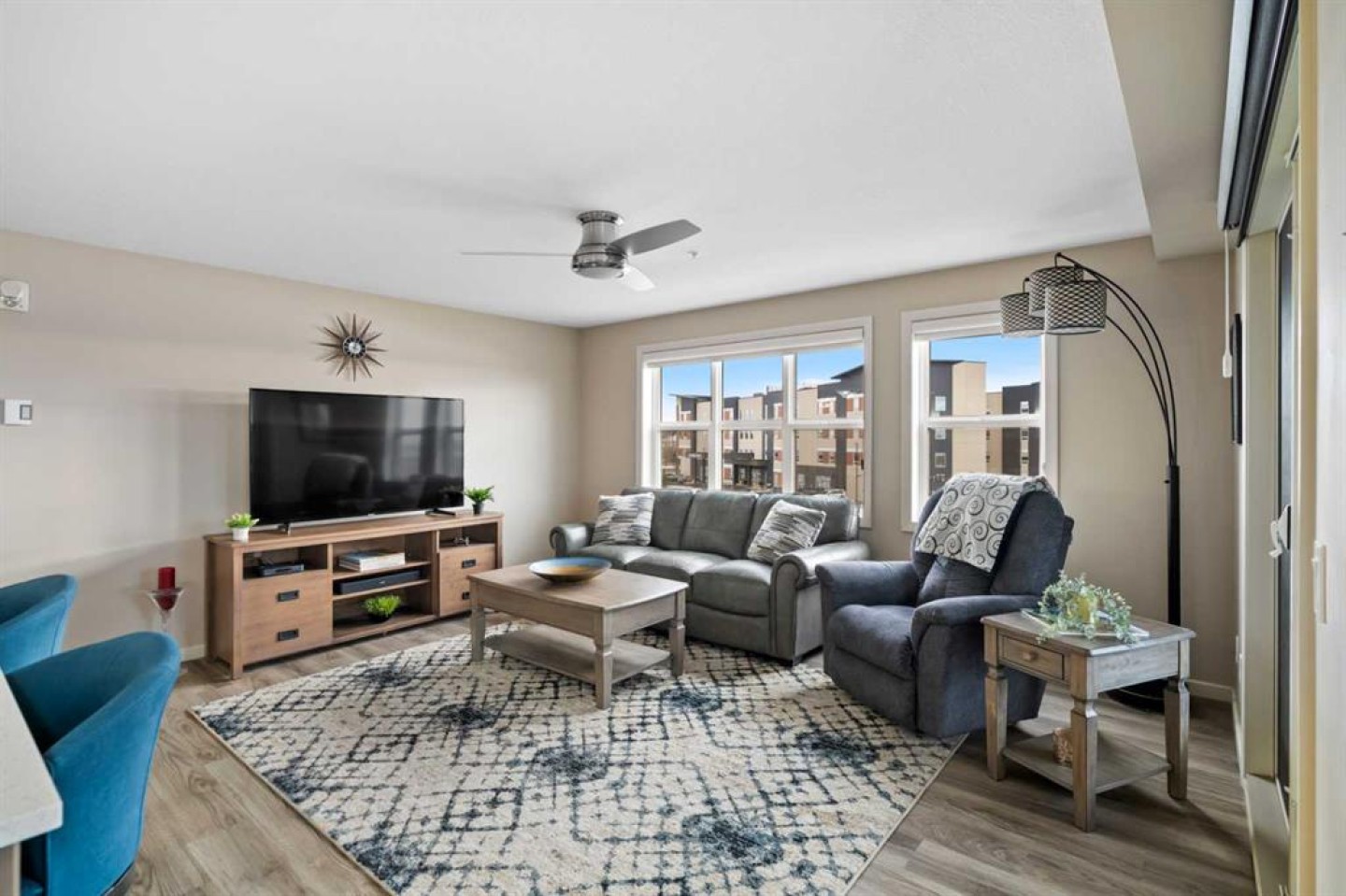Welcome to #2310-10 Market Blvd! Airdrie's premier age restricted apartment complex, NEWLY age restricted to 55+. If you are looking to downsize in Airdrie, you will be hard pressed to find a building that compares to this one. This unit is a THIRD FLOOR, CORNER UNIT with SOUTHWEST exposure ensuring endless afternoon sun and INCREDIBLE NATURAL LIGHT throughout your home. Upon entering the unit, you are welcomed by a spacious foyer completed with a coat closet and an open, airy feel that immediately sets the tone for the home. Moving into the kitchen, it offers expansive, high-end cabinetry, granite countertops, a large island, beautiful light fixtures and stainless steel appliances. Designed for hosting, it opens seamlessly into the expansive living space with access to a spacious balcony, perfect for cozy evenings or morning coffee while enjoying the MOUNTAIN VIEWS. Just off your living space, you will appreciate a large, formal dining room that comfortably fits a six person table and is SURROUNDED by windows, a rare find in condo living. It is not every day that a unit like this hits the market, what is unique about it is that it offers TWO BEDS, 2 BATHROOMS + A LARGE DEN. The den is a versatile space ideal for a home office, exercise room, or additional storage. The PRIMARY bedroom is a true retreat, featuring a walk-through closet with built-in storage leading to a three-piece ensuite. This spa-like space includes a beautiful walk-in glass shower and a second vanity, ideal for getting ready in the morning. The second bedroom is equally spacious, offering two closets and direct access to the four-piece bathroom. You will also enjoy in suite laundry, beautiful vinyl flooring, remote controlled window coverings on the balcony doors, a garburator and many more upgrades. This unit offers TWO TITLED PARKING STALLS, one underground STEPS FROM THE ELEVATOR, the second one outdoors and a large assigned STORAGE LOCKER located down the hall on the same floor as your unit for convenient access. Stay comfortable in the summer months with your A/C wall unit and ceiling fan(s). The Chateaux features a beautifully landscaped courtyard with a gas fireplace and an amenity room available for private bookings where residents gather to host regular happy hours, social hours or just getting together to visit. There's also a secure underground workshop for those who enjoy woodworking. Located in Kings Heights, you’re within walking distance to Save-On-Foods, Shoppers Drug Mart, banks, salons, restaurants and more - covering all your grocery, shopping, and healthcare needs. This building is truly designed for mature ownership, peaceful living and a vibrant social community. Call for a private viewing today!