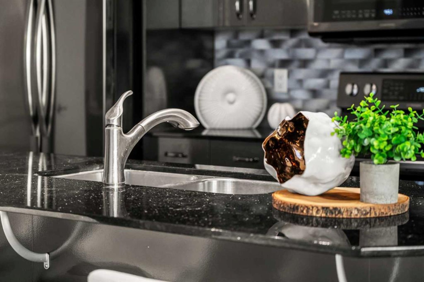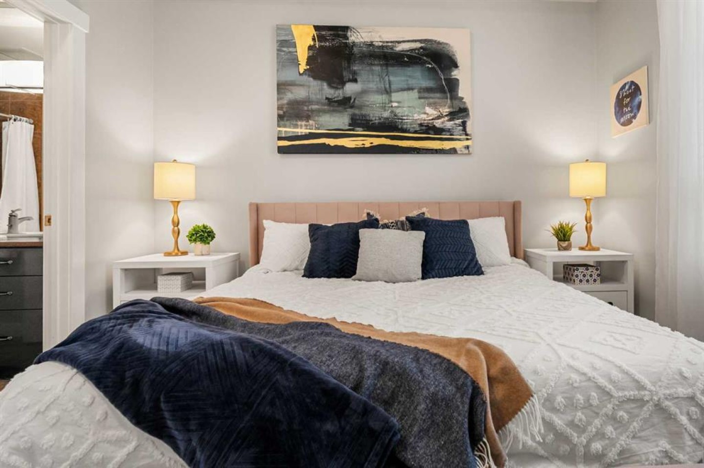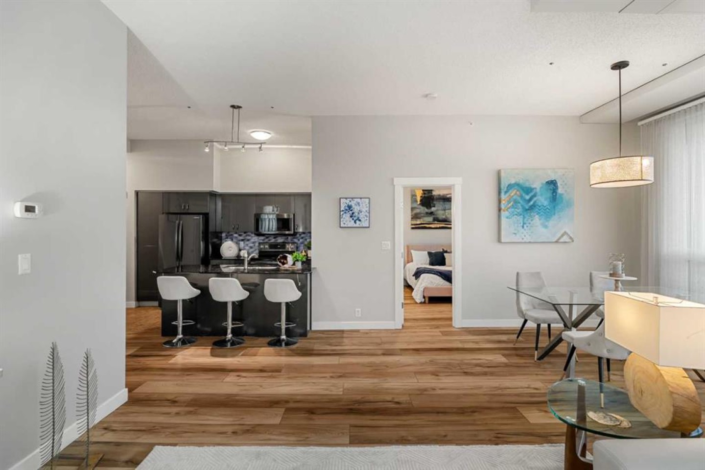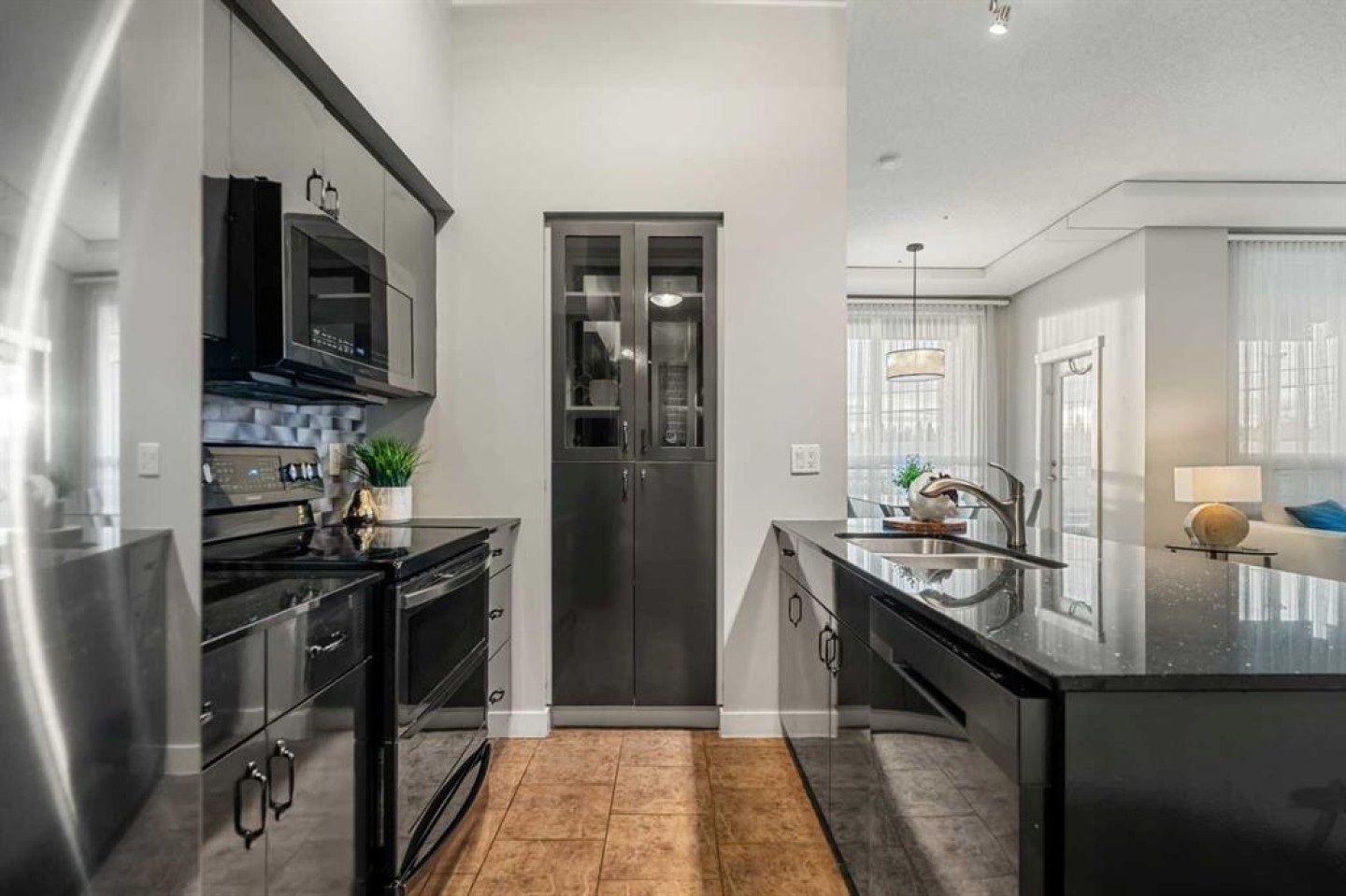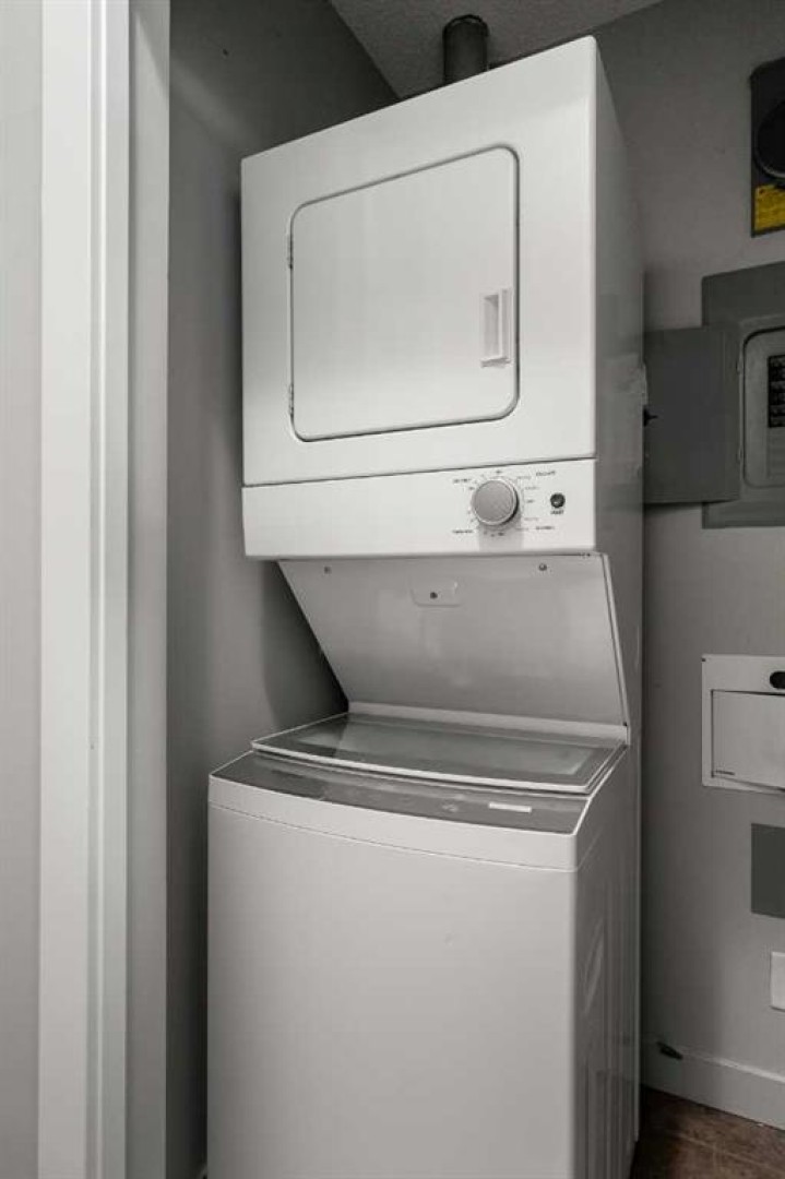 The kitchen has been thoughtfully updated with Newer gunmetal black appliances (all replaced within the last 3–4 years), including an electric stove with double oven option, refrigerator, microwave hood fan, and dishwasher. The cabinets have been updated with double coat of paint and new hardware in the kitchen and in both bathrooms. Beautiful gold-flecked black granite countertops, a tile backsplash, and a double sink complete the space, making it as functional as it is striking. A new designer dining room light fixture adds a touch of elegance to the adjoining dining area that is more house sized than a typical condo perfect for family dinners or entertaining. Comfort and style continue throughout the home with automatic blinds in the bedrooms and dining room, custom drapery on all windows, new entry and primary closet doors, and additional storage above the closets in both the primary bedroom and front entry. The front entry allows for a desk space if desired or a added space for you favorite shoe collections. The living room has lots of light and lots of space for big sectionals and a large TV if desired. The primary bedroom has room for a king sized bed, lost of extra storage added above a large closet, with a lovely 4 pc ensuite. With the other bedroom on the opposite side of the unit its spacious giving everyone occupant privacy. The unit also includes a stacked washer and dryer and a tankless hot water system for added efficiency.