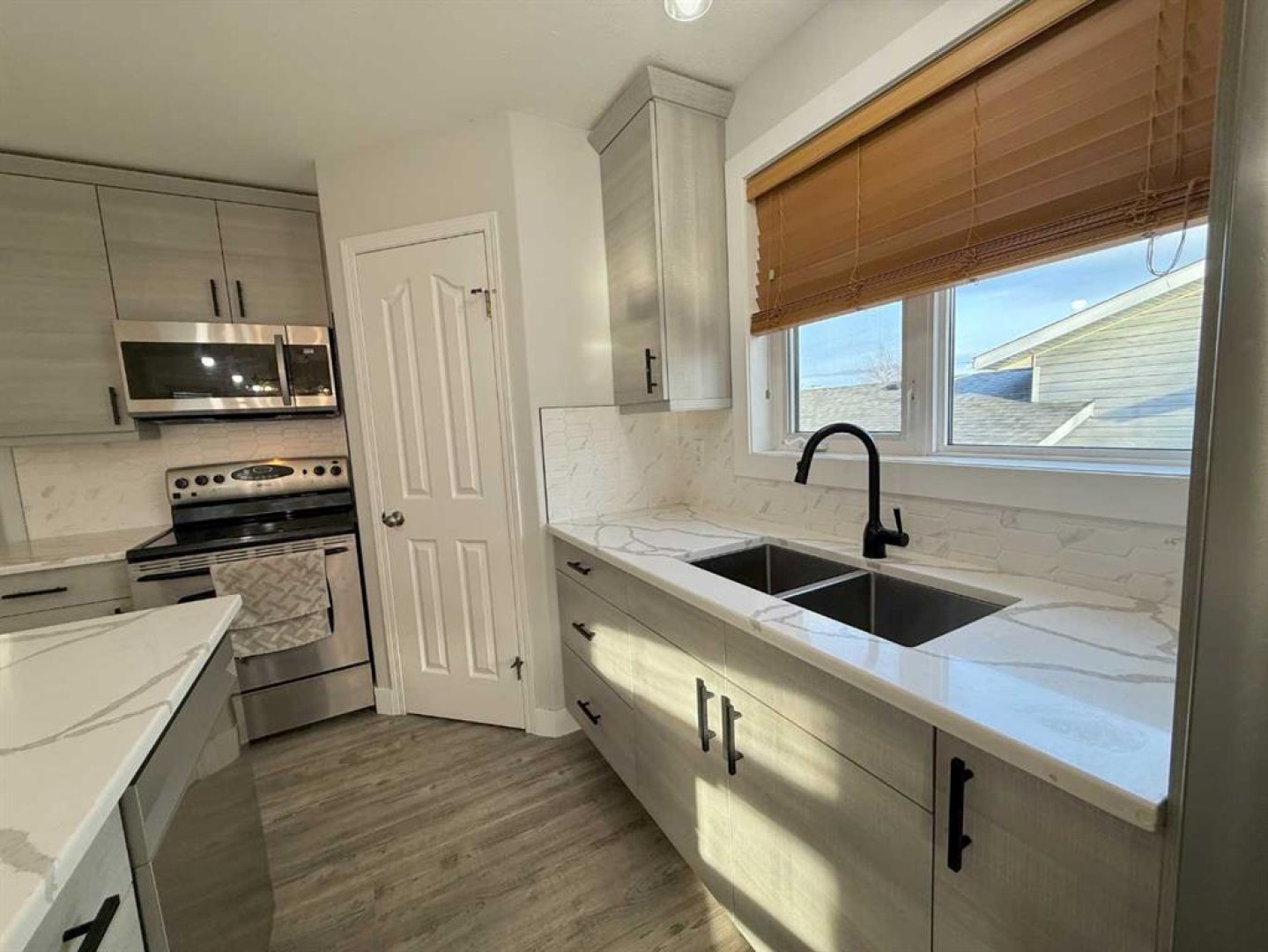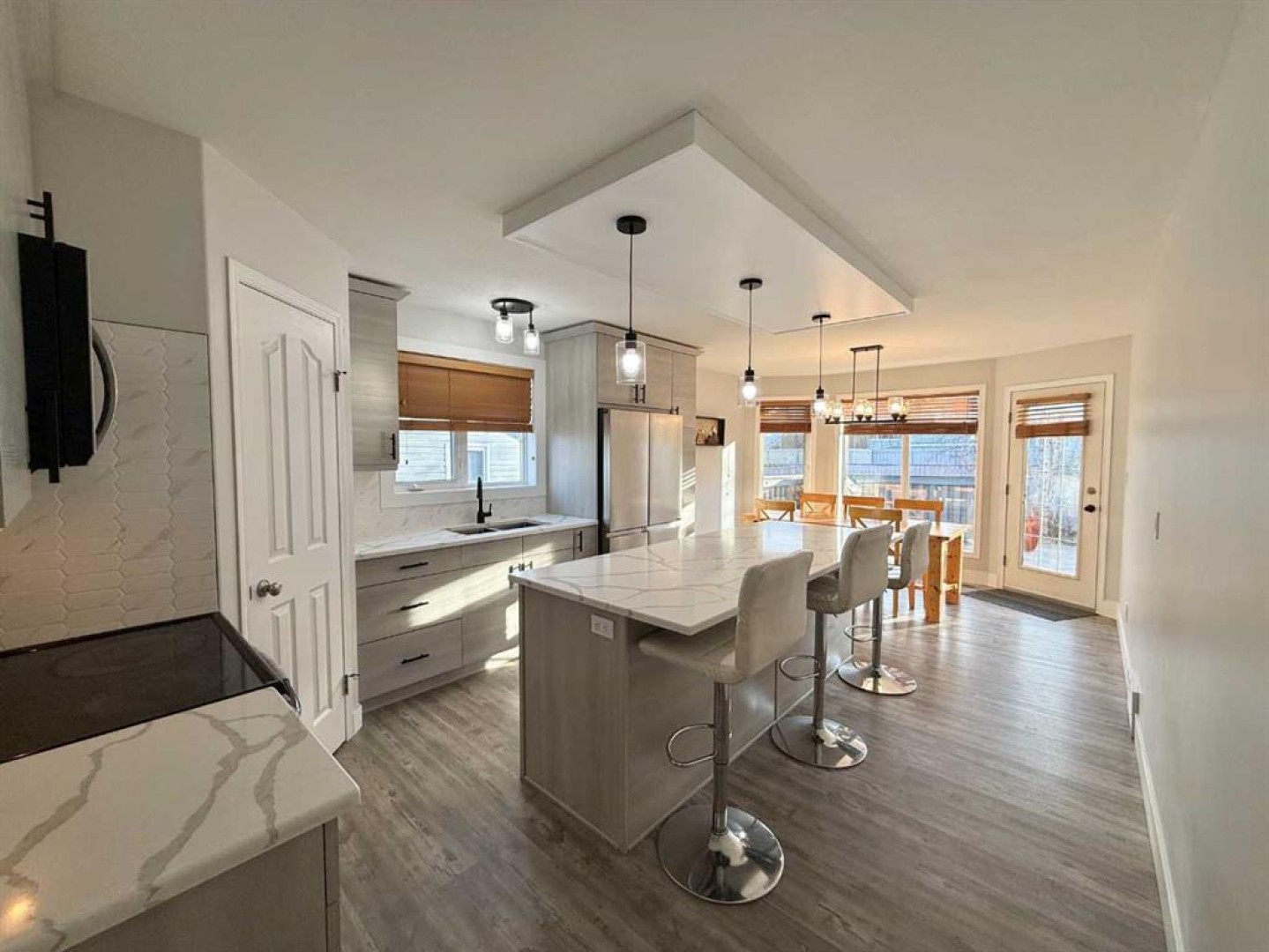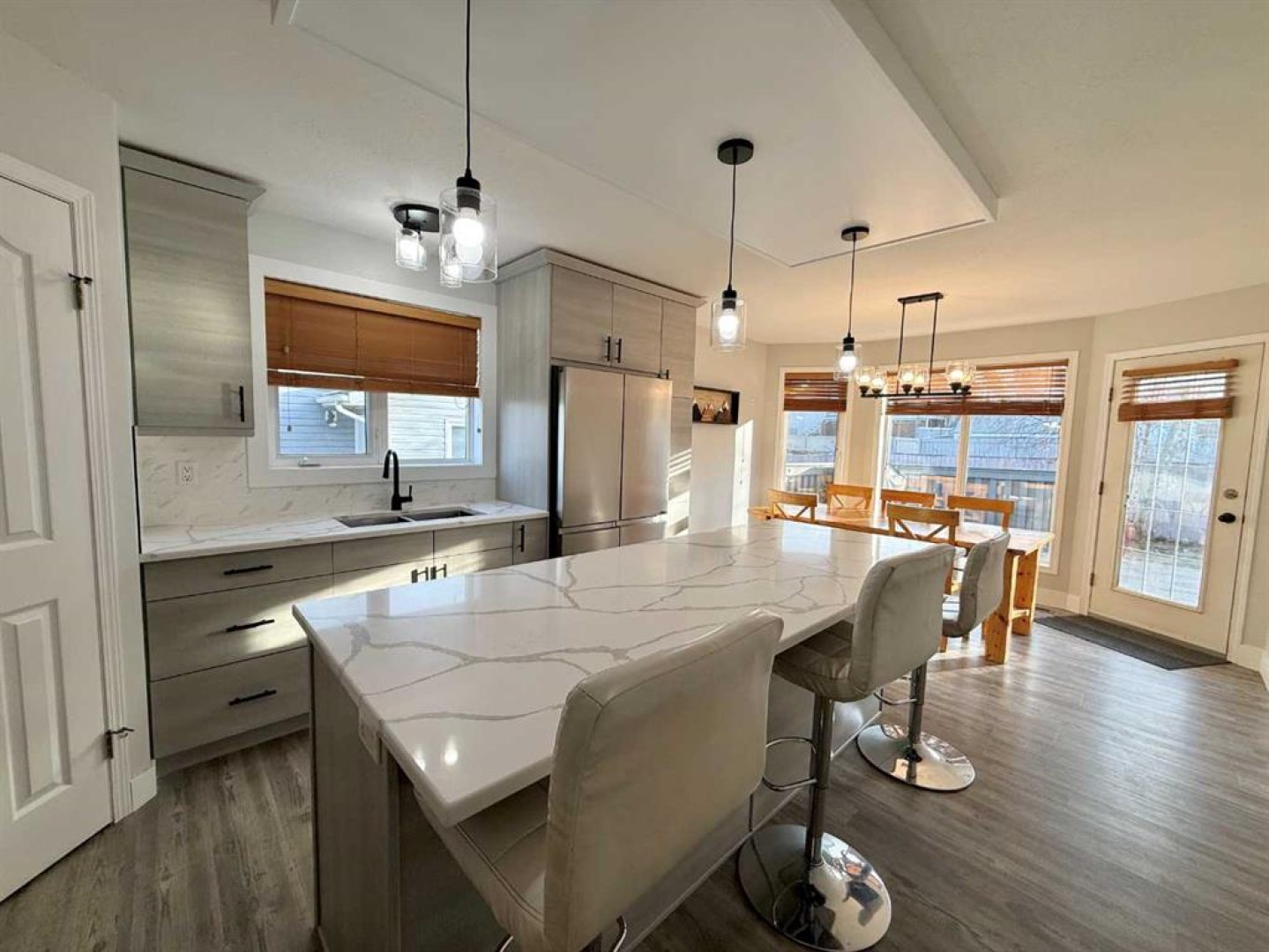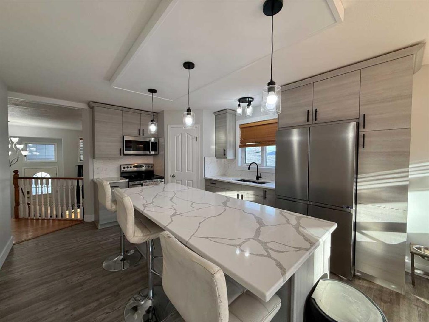 The heart of the home is the newly renovated kitchen, showcasing all-new cabinetry, quartz countertops, fresh paint, and updated flooring—ideal for both everyday living and entertaining.