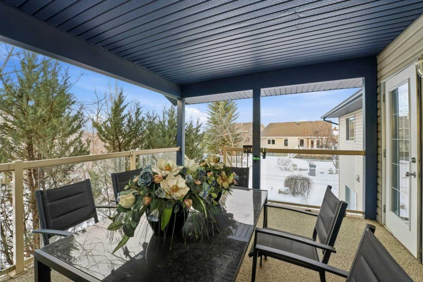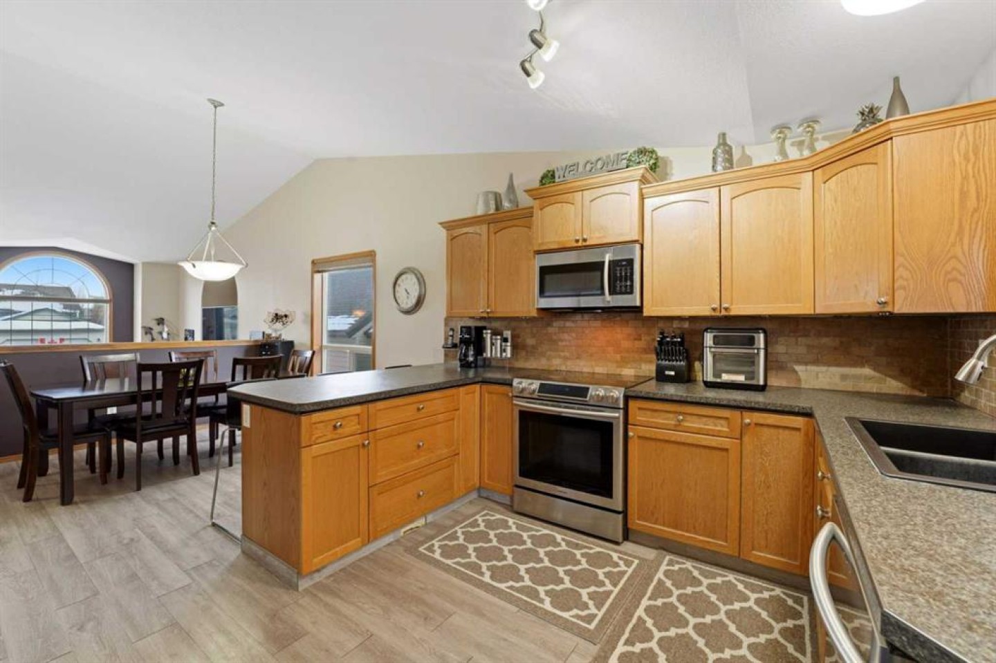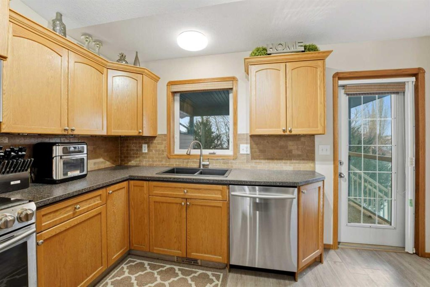 The main floor welcomes you with a spacious living room featuring a large picture window that fills the space with natural light. A few steps up leads to the heart of the home, where the open-concept kitchen and dining area connect seamlessly. The kitchen offers oak cabinetry, generous counter space, an eating bar, pantry, oversized fridge and freezer, ample storage cupboards, and a central vacuum kick sweep. A garden door off the kitchen opens to a covered deck surrounded with trees and a fully fenced backyard—perfect for relaxing or entertaining. The yard has capacity to add RV parking with a fence/gate change.