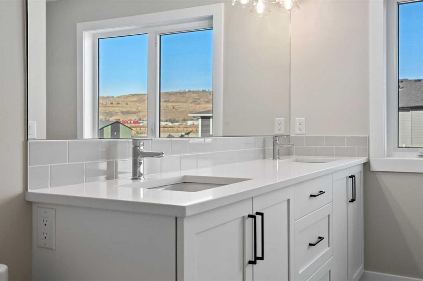 Step inside to a welcoming foyer that opens into a bright, airy main floor where large windows flood the space with natural light. The open-concept kitchen, dining, and living areas flow seamlessly—perfect for everyday living and effortless entertaining. The stylish kitchen features quartz countertops, sleek black hardware, and beautifully crafted MDF built-ins that elevate both function and design. The adjacent living room is anchored by a cozy gas fireplace, creating a warm and inviting atmosphere. A convenient powder room completes this level.