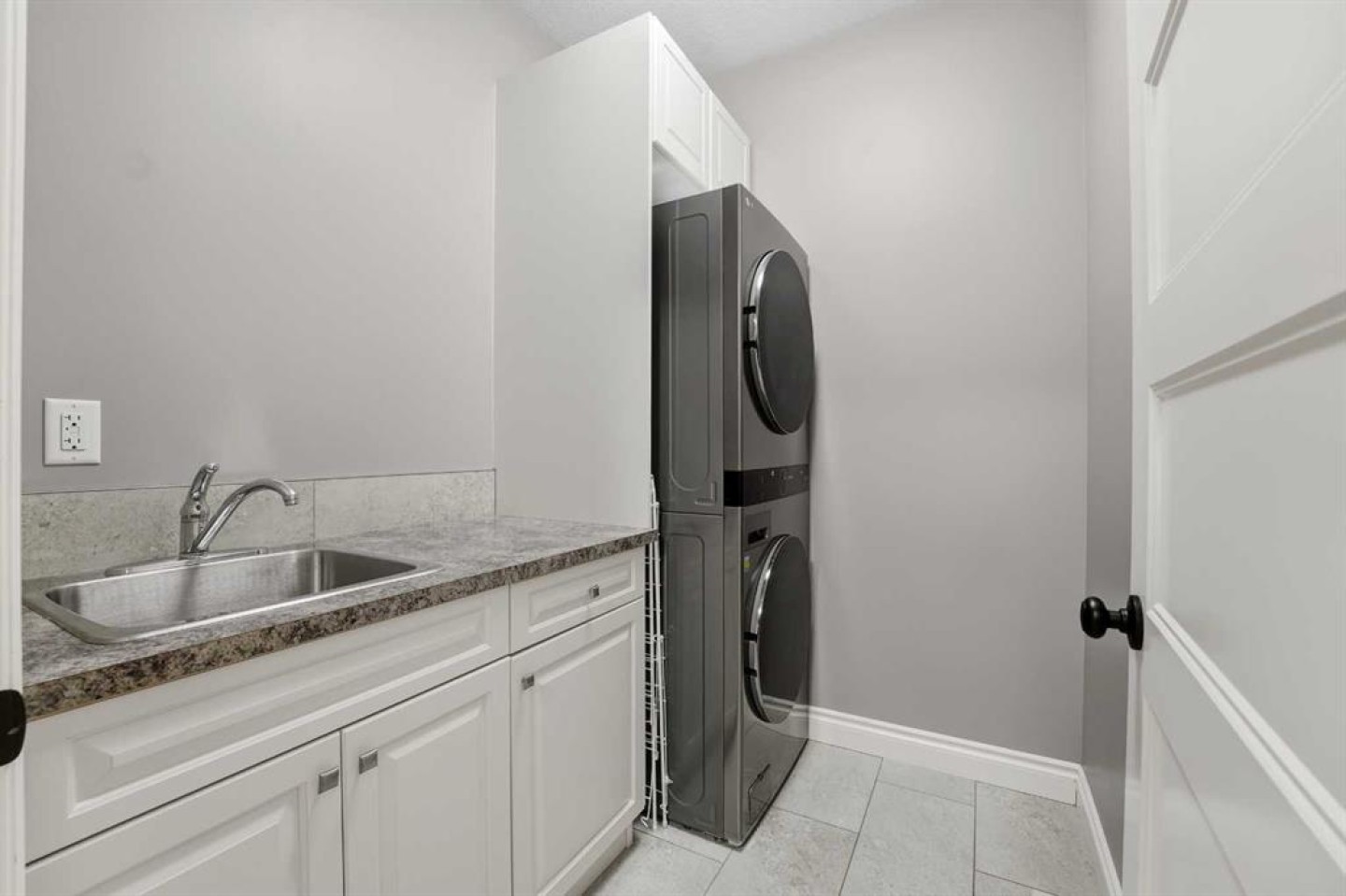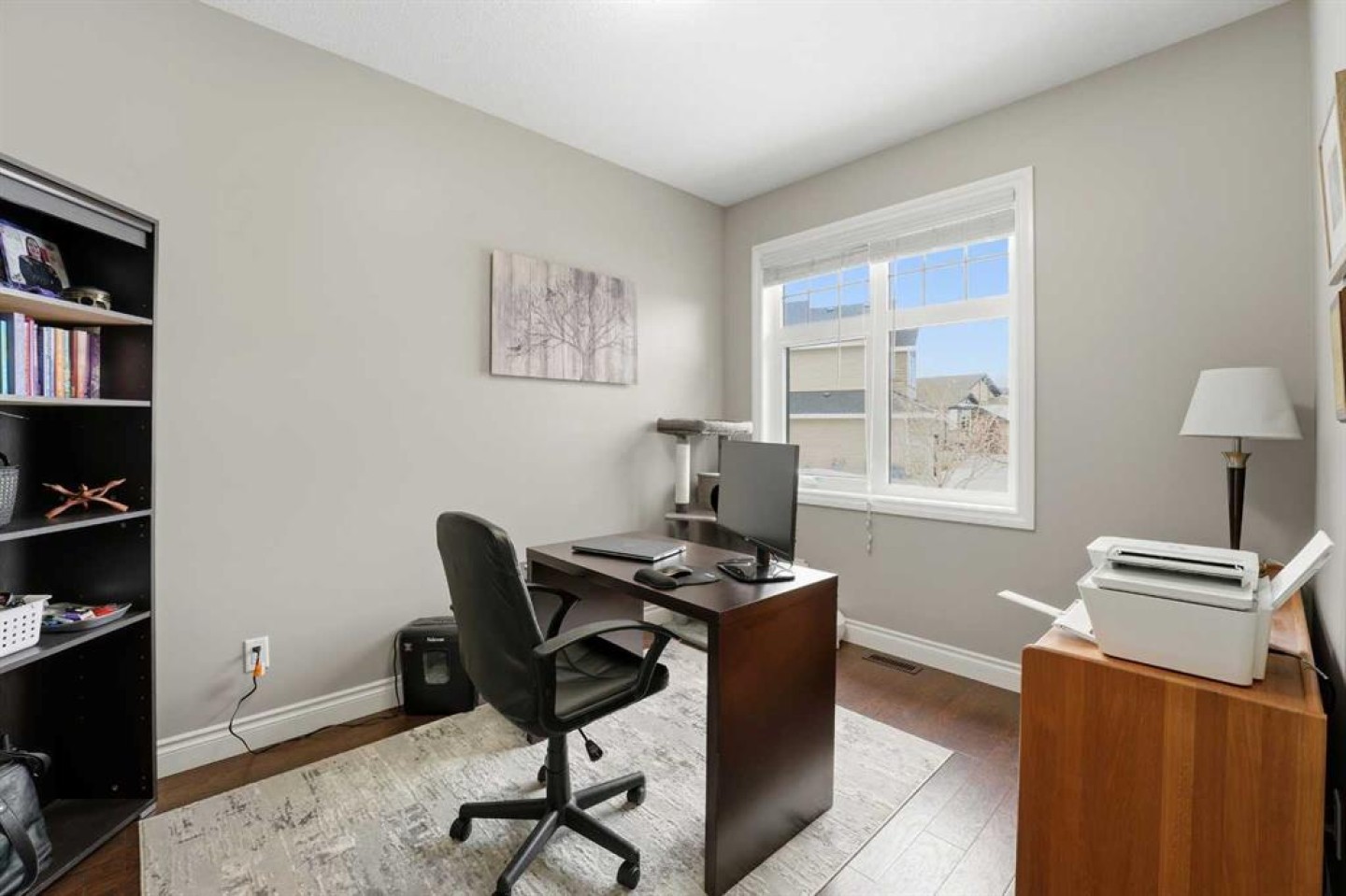 The spacious primary suite accommodates a king bed and features a walk-in closet and spa-like 5pc ensuite with soaker tub, dual vanities, separate shower, and private water closet. A second bedroom, full bath, main floor office, mudroom with built-in lockers, and main floor laundry with cabinets and sink complete the level.