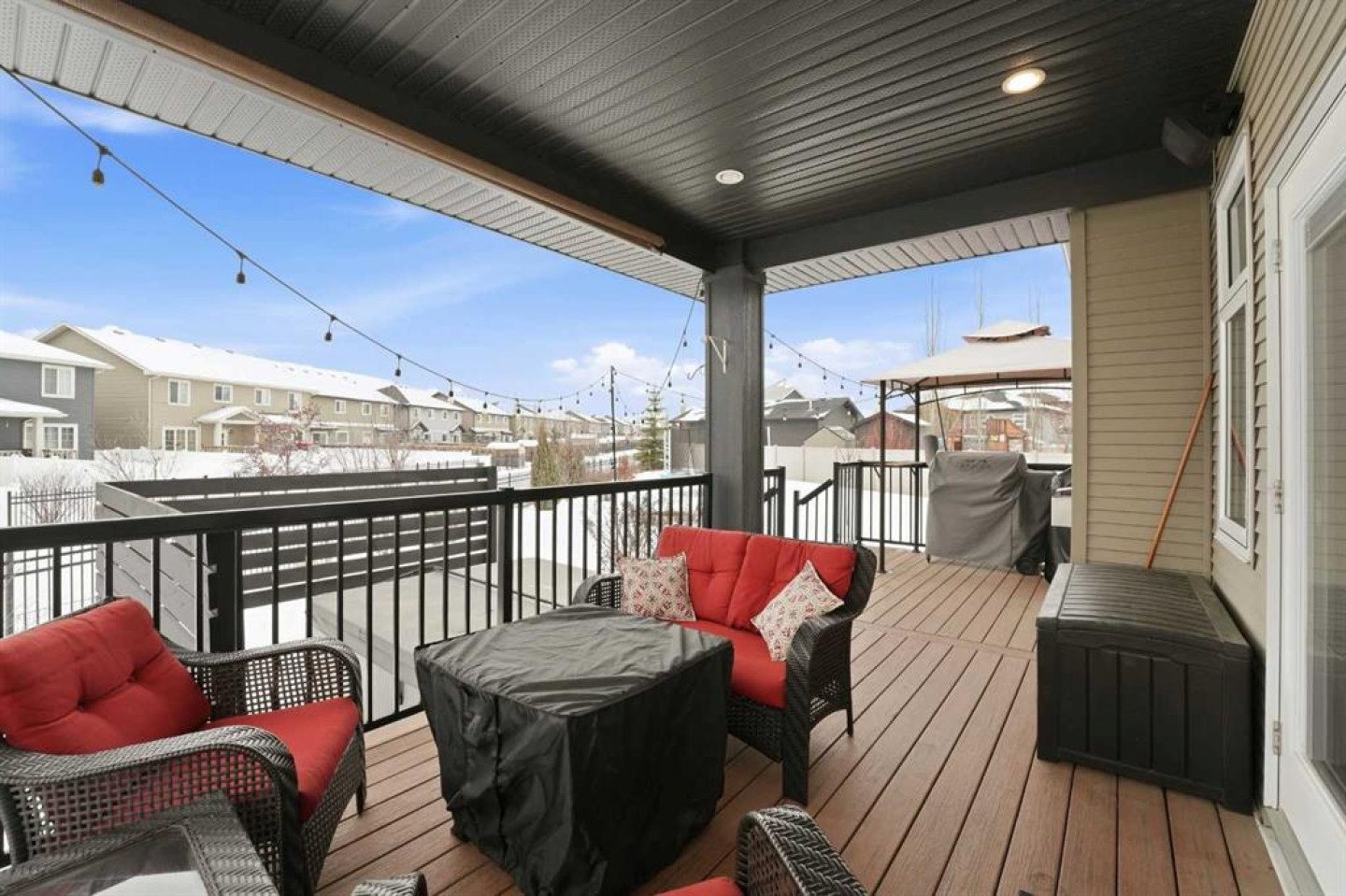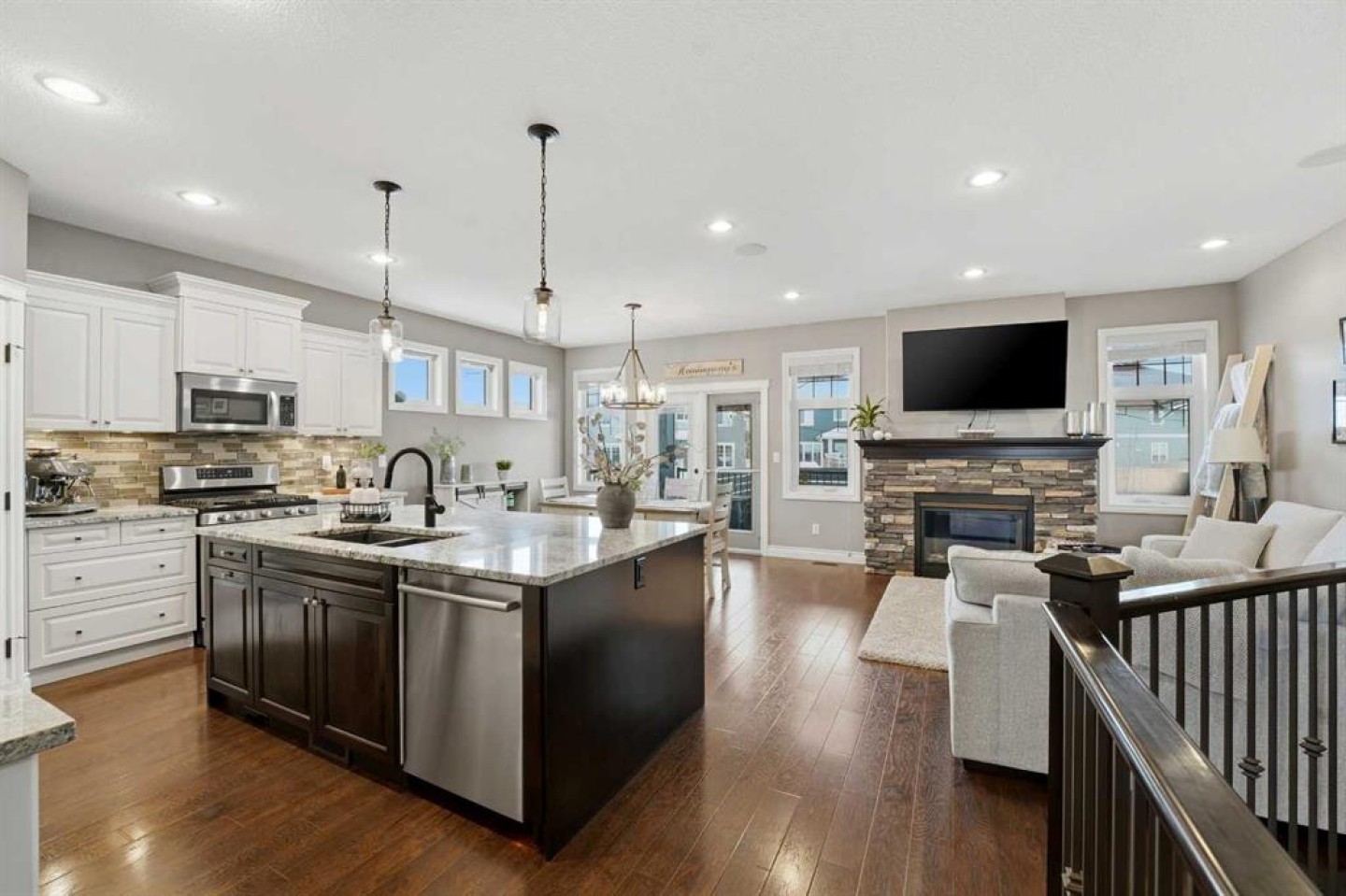 The open-concept main floor features 9 ft ceilings, pot lights, and lighted niches. The chef’s kitchen includes custom cabinetry with crown moulding, granite countertops, full tile backsplash, built-in wine rack, gas range, corner pantry, and a large island with undermount sink and lowered eating bar. The living room is anchored by a gas fireplace with stacked stone surround, and the dining area opens to a south-facing covered deck with maintenance-free decking.