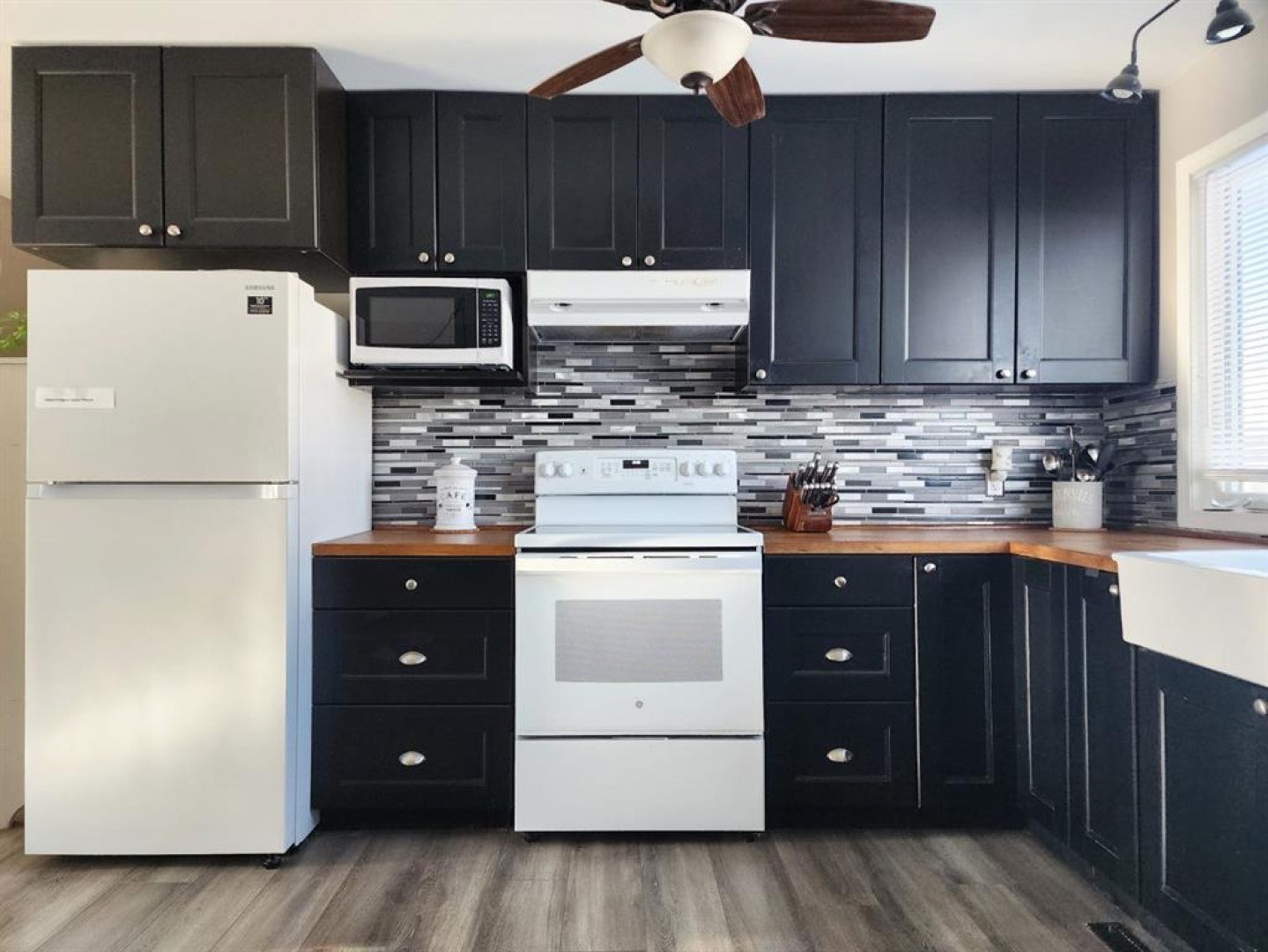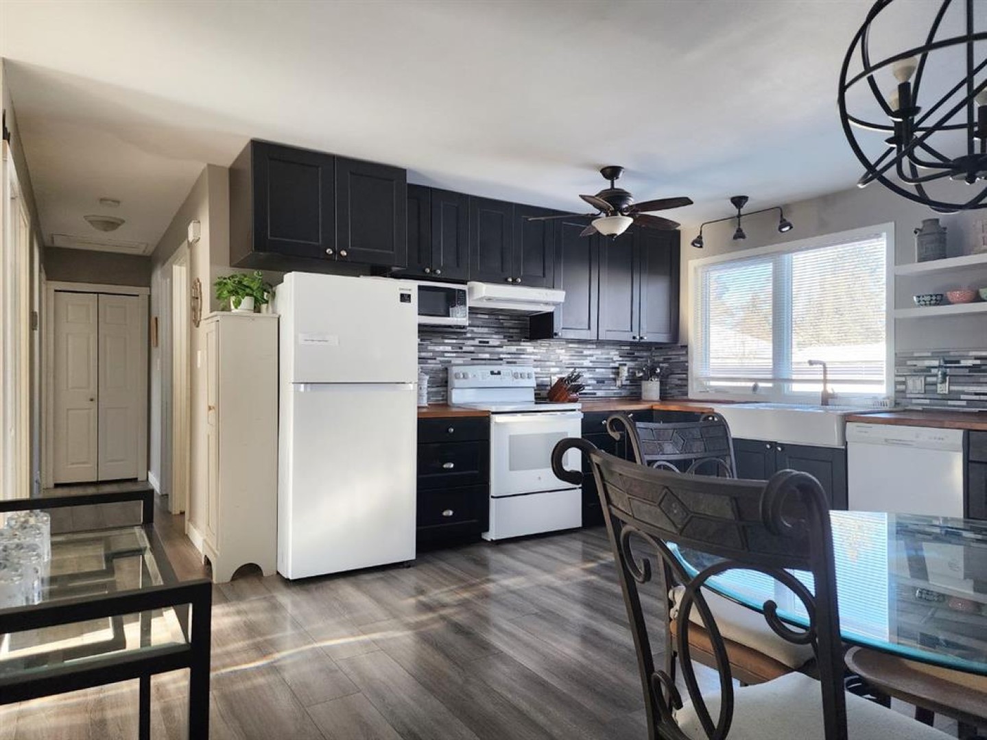 Convertible refrigerator/freezer in front of stairs , Stove, Dishwasher, Convertible refrigerator/freezers in kitchen , Washer/ Dryer, Blinds/ Window Coverings, Microwave, 2 sheds